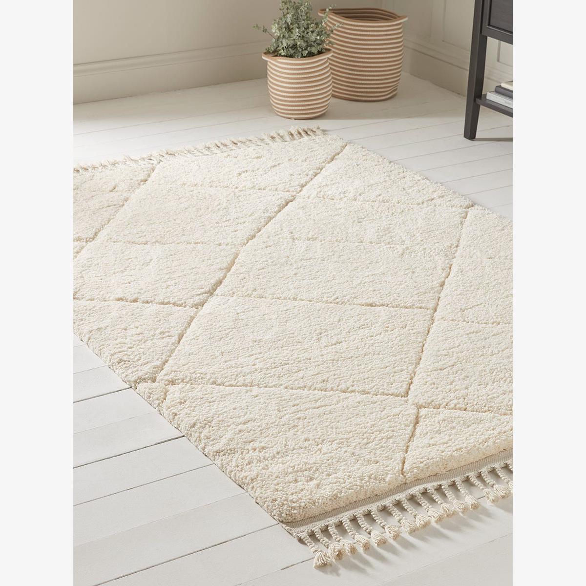 With a sumptuously deep pile and rich cream tones, our Atlas Rug will add a luxurious finishing touch to your room. Featuring a Berber inspired paving slab design and toning fringed edges, this cosy rug, available in two sizes, will bring texture to a neutral scheme or provide some welcome contrast in a maximalist space.