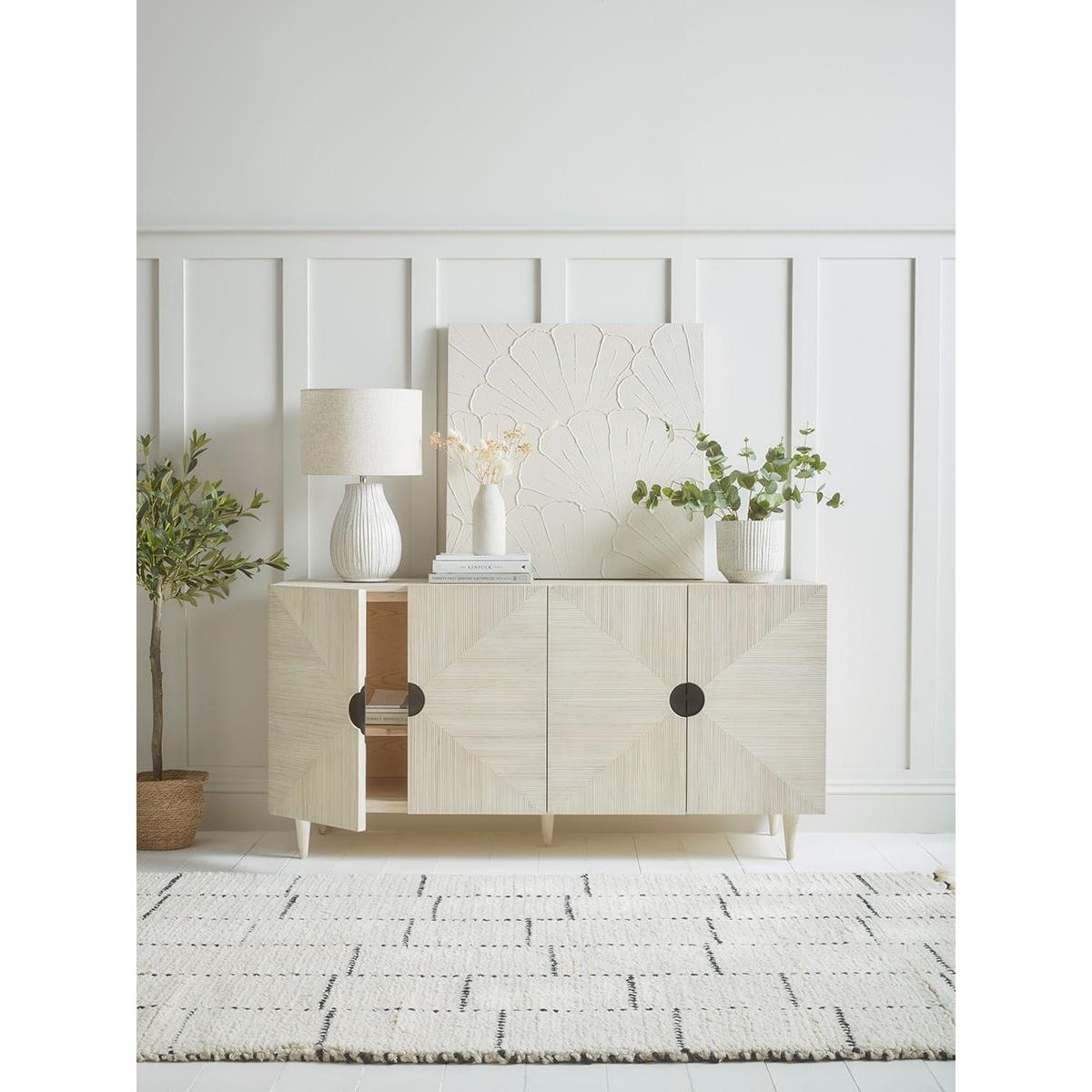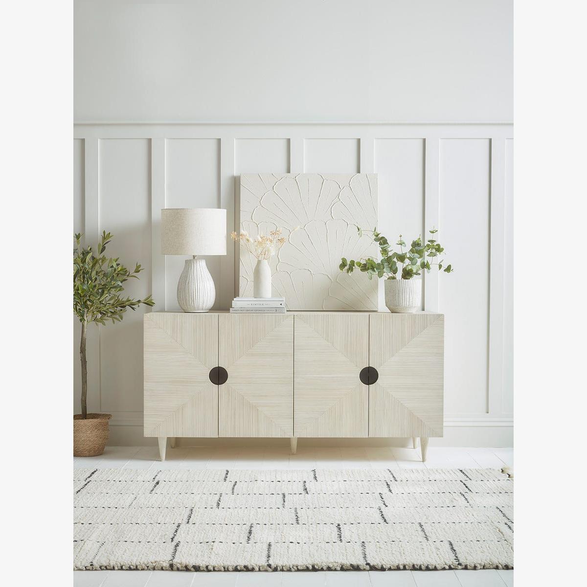 I’m a fan of this Atley sideboard for its clean lines and subtle geometric carving - it brings texture without overwhelming a space. Its pale oak finish suits Scandi, coastal or modern-minimal interiors and pairs nicely with soft greys, muted blues or a pop of terracotta. For styling, keep the top surface decluttered: place a low-profile lamp at one end and a couple of vases or sculptural objects in varying heights toward the centre. A simple piece of artwork or mirror propped behind will add depth, while indoor foliage softens the straight edges and ties the look together.