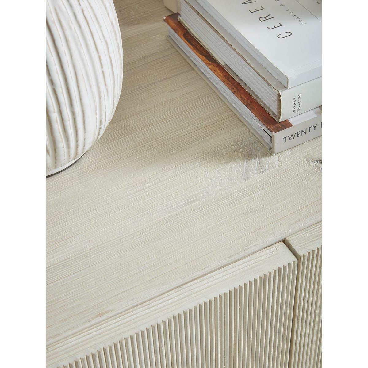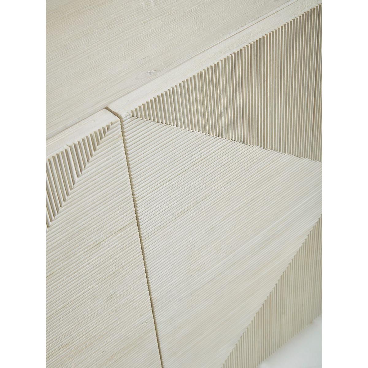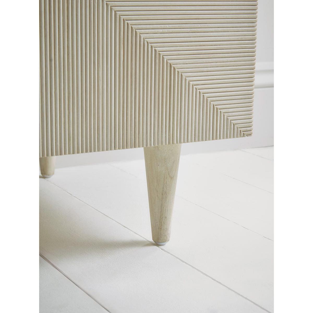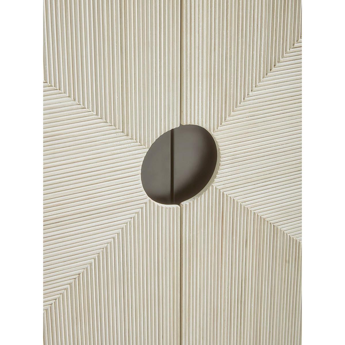 A dramatically textural sideboard softened by its pale tones, our Atley Sideboard is perfect for defining a neutral space. Reeded panels set at opposing angles create a wonderful shadowed geometric pattern across the front of the cupboard doors which feature bold round metal handles to the centre. Crafted from recycled pine, the wood has a white painted finish which gives a wonderful chalky effect while still allowing the beauty and character of the woodgrain to show through.