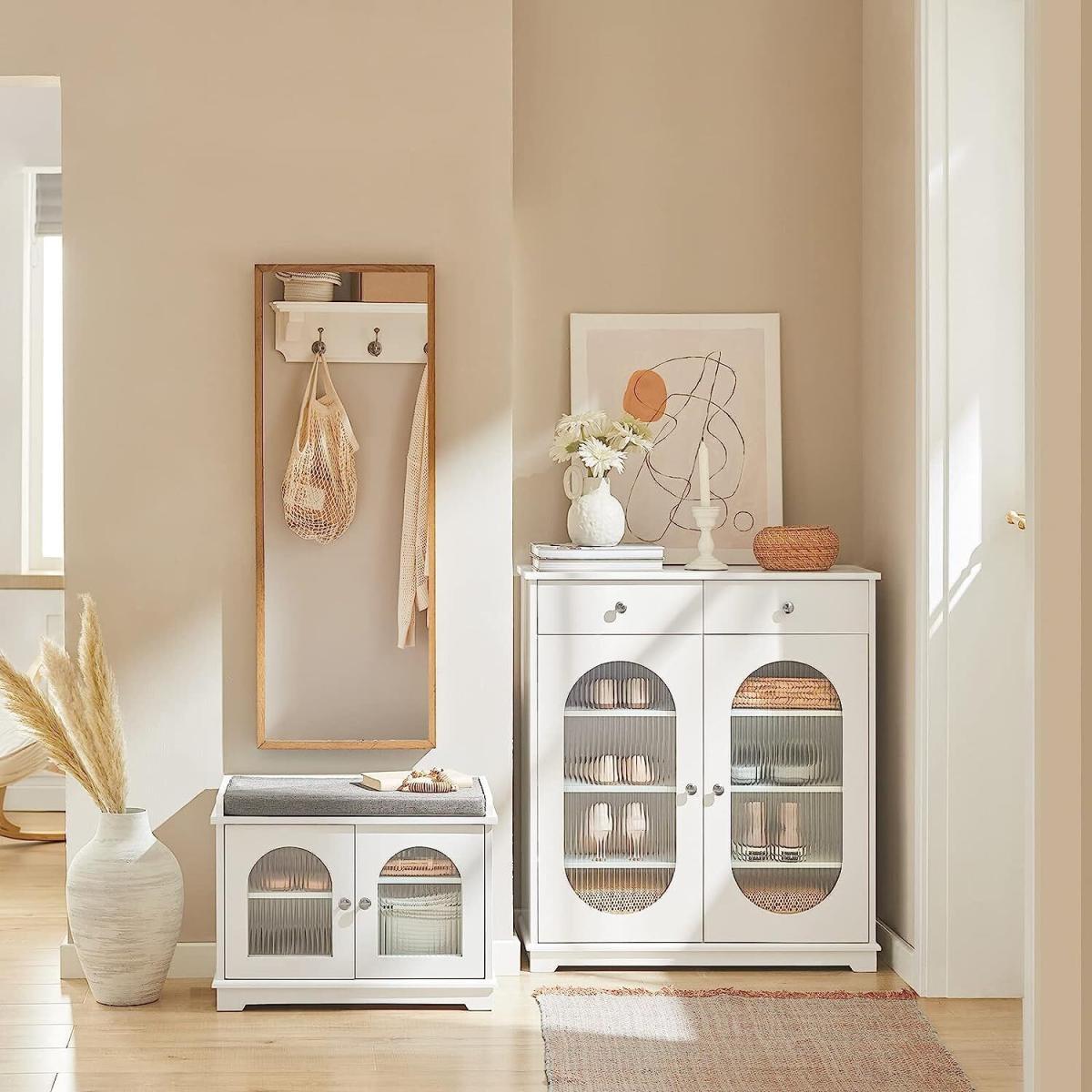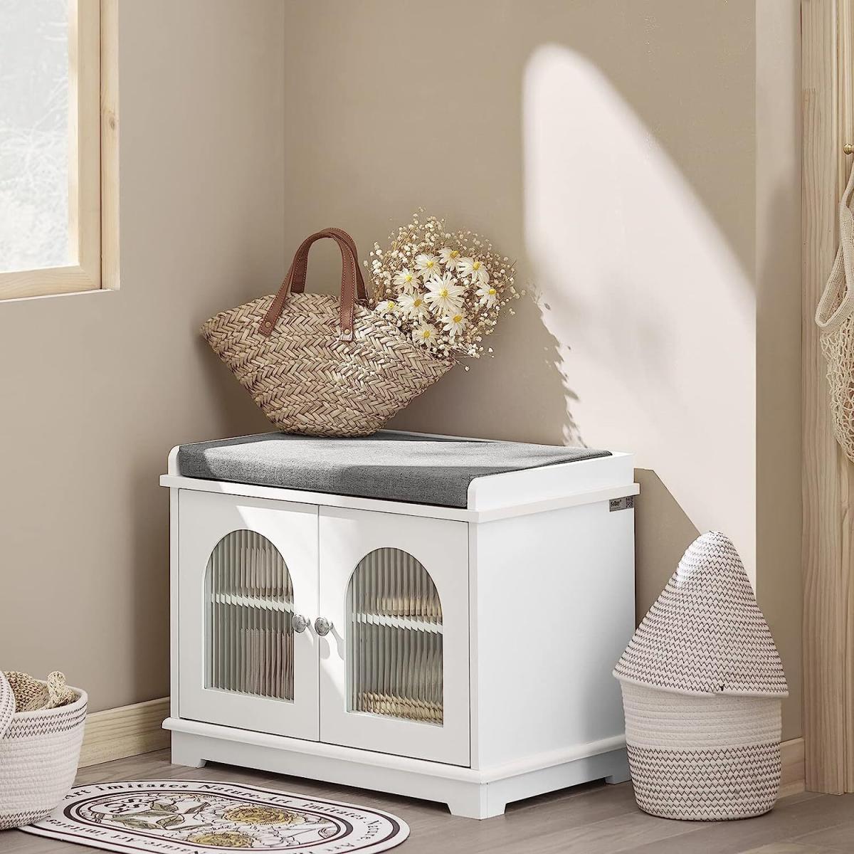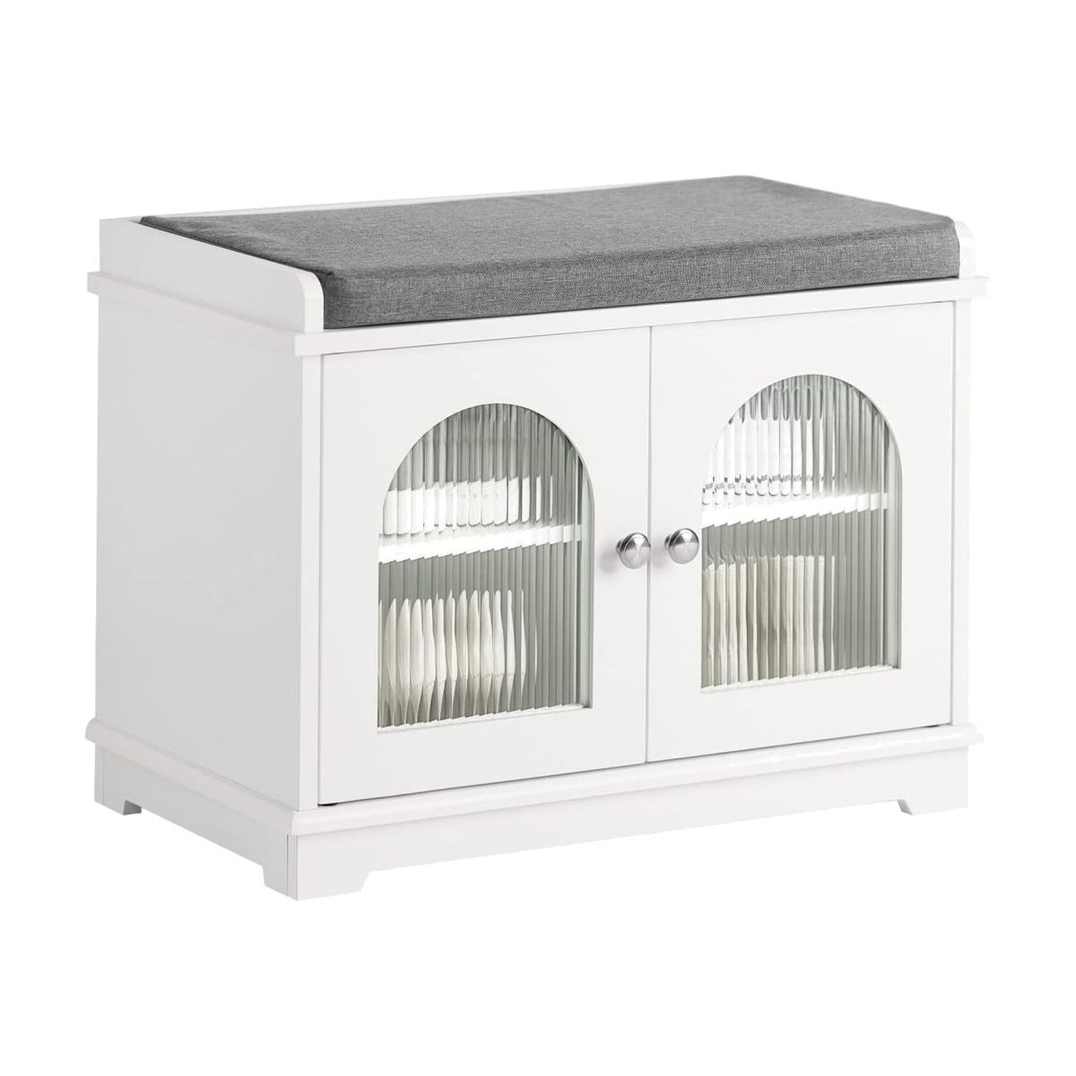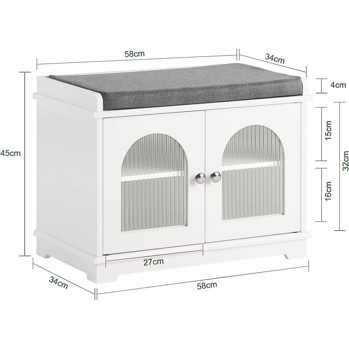 Modern design shoe cabinet storage bench is a good choice for hallway, living room, bedroom, etc. The padded seat which is removable is ideal for comfortable sitting while putting on and taking off shoes. Two shelves behind the doors are adjustable in three heights. You can adjust the height to meet your needs or simply remove the shelves. The glass doors add a stylish touch to this cabinet. There are handles on the doors so you will open the doors easily. Made of high quality MDF in white lacquer. The doors are made of MDF frames and glass. Sturdy and durable. Tidies up your hallway or porch nicely hiding all your shoes and the other items! Modern elegant design shoe cabinet will fit perfectly with any style of decor.