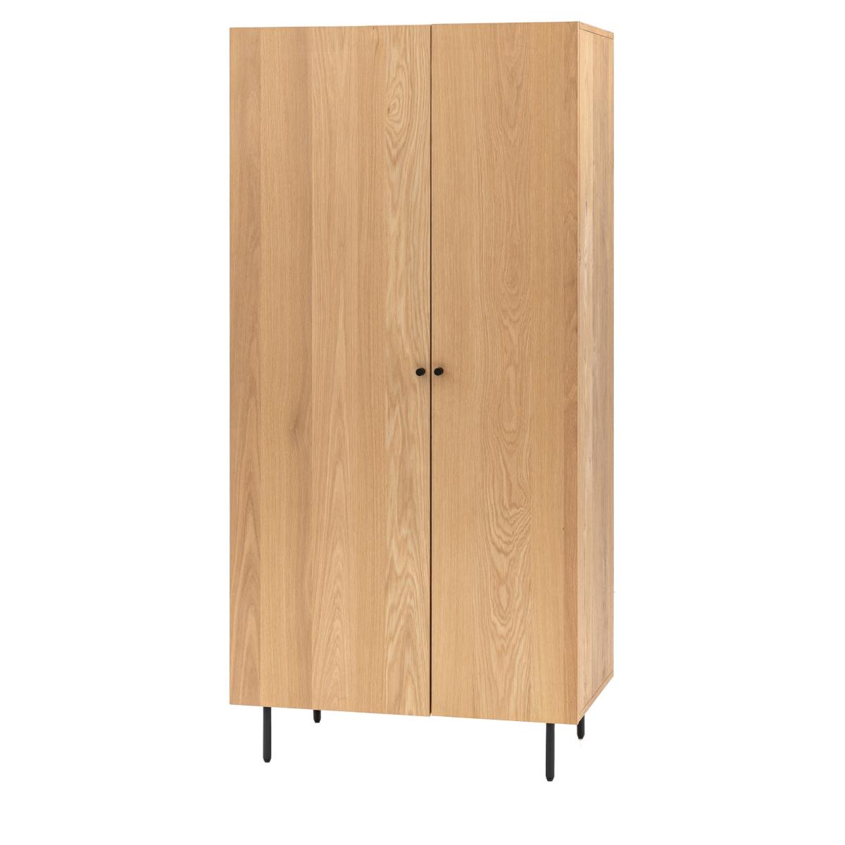 * Wooden Effect Wardrobe* Internal Shelf and Rail* Easy Assembly This delightful wardrobe brings contemporary flair to any bedroom space. Carefully crafted, it features oak veneers paired elegantly with a black metal underframe and door handles, offering a perfect blend of durability and style. The natural wood veneer, showcasing its unique random knots, lends a modern rustic appeal, adding character to your bedroom decor. Explore its matching pieces for a cohesive bedroom ensemble.