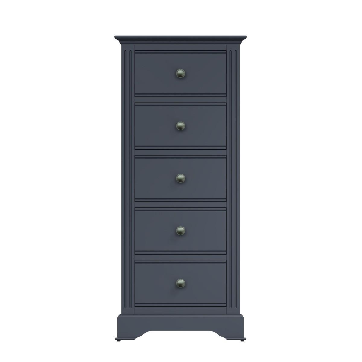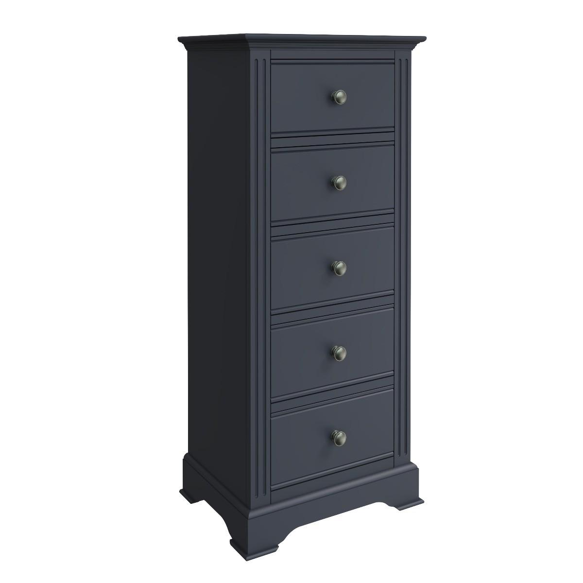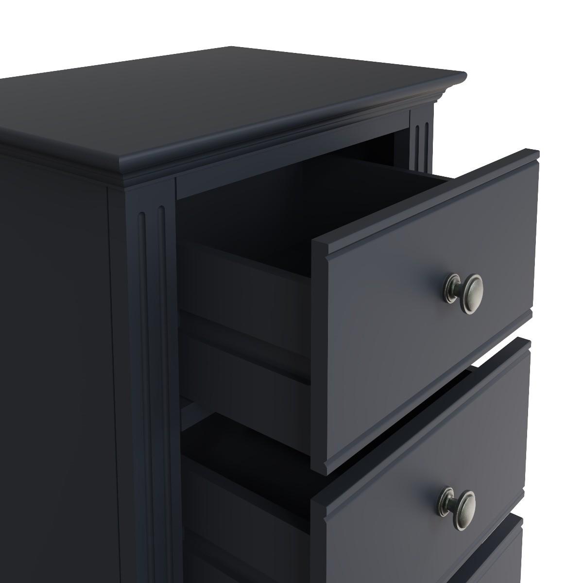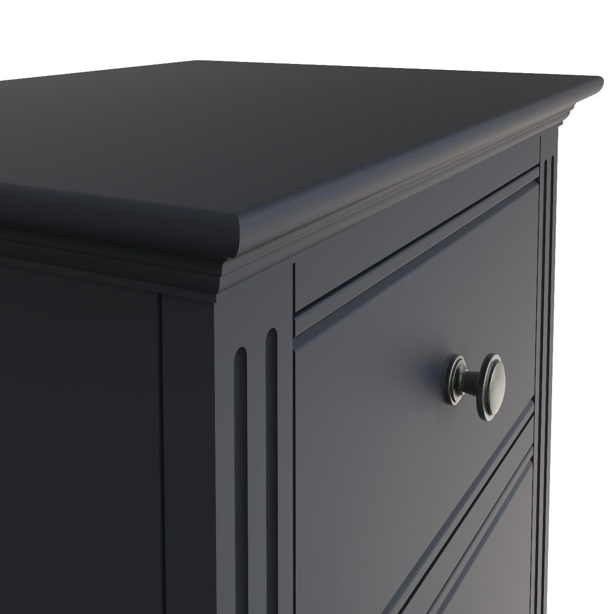The Aubrey collection is dark and mysterious with linear detailing and sculptured cornices painted in a sophisticated midnight grey. No detail has been left out with this gorgeous and immensely practical space saving chest. You’ll be delighted at the volume of clothes that can be folded and stored in the five drawers – ideal for hallways or smaller bedrooms. Robustly crafted from pine and MDF for extra durability. Drawers on wooden runners for easy opening Pewter effect knob handles. Finished in a modern midnight grey paint