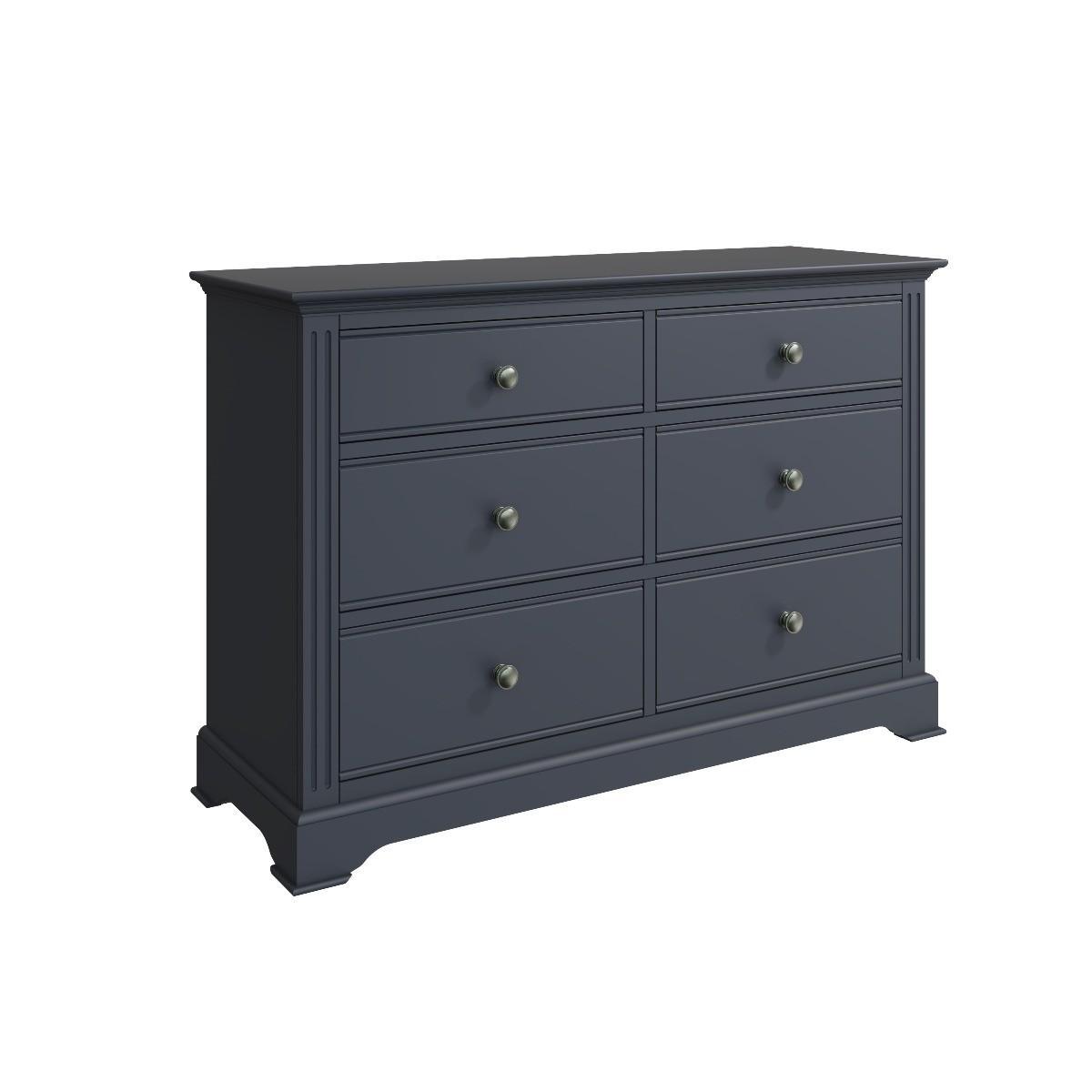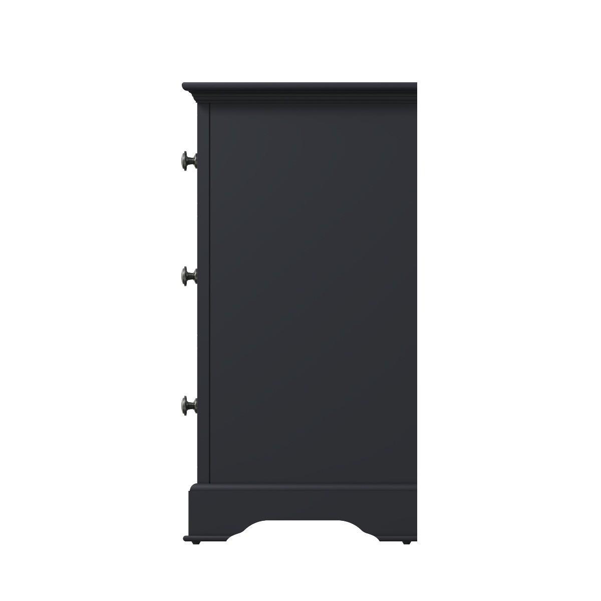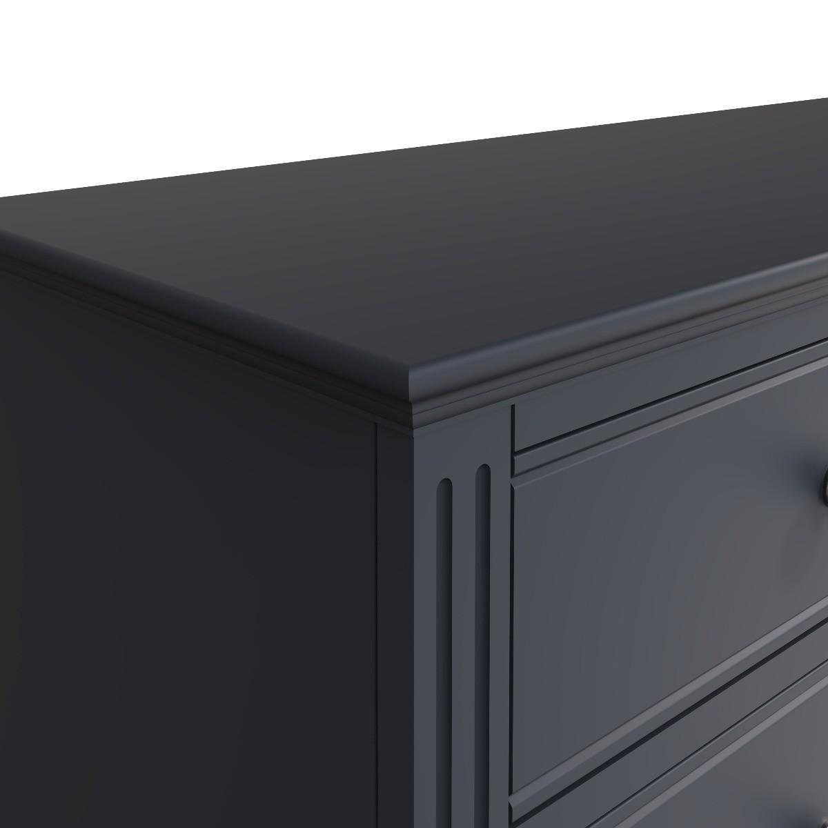 The Aubrey collection is dark and mysterious with linear detailing and sculptured cornices painted in a sophisticated midnight grey. No detail has been left out with this gorgeous and immensely practical contemporary chest. You’ll be delighted at the volume of clothes that can be folded and stored in the six deep drawers. Robustly crafted from pine and MDF for extra durability. Drawers on wooden runners for easy opening Pewter effect knob handles. Finished in a modern midnight grey paint
