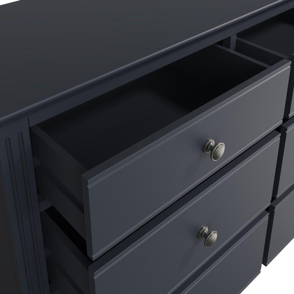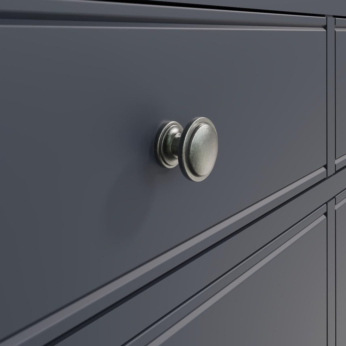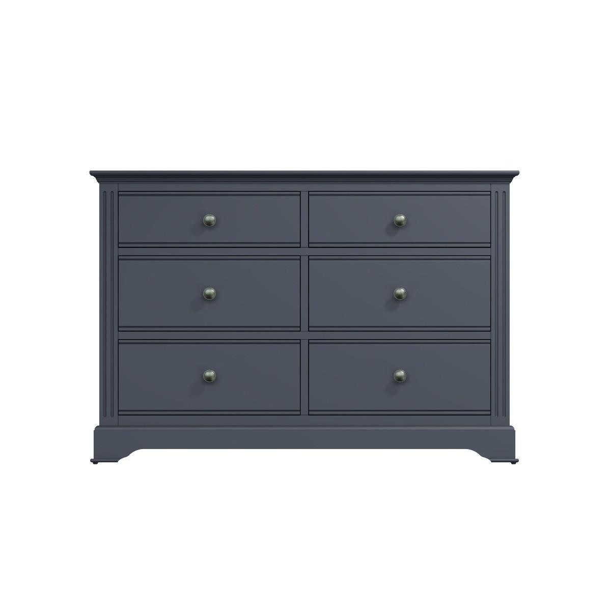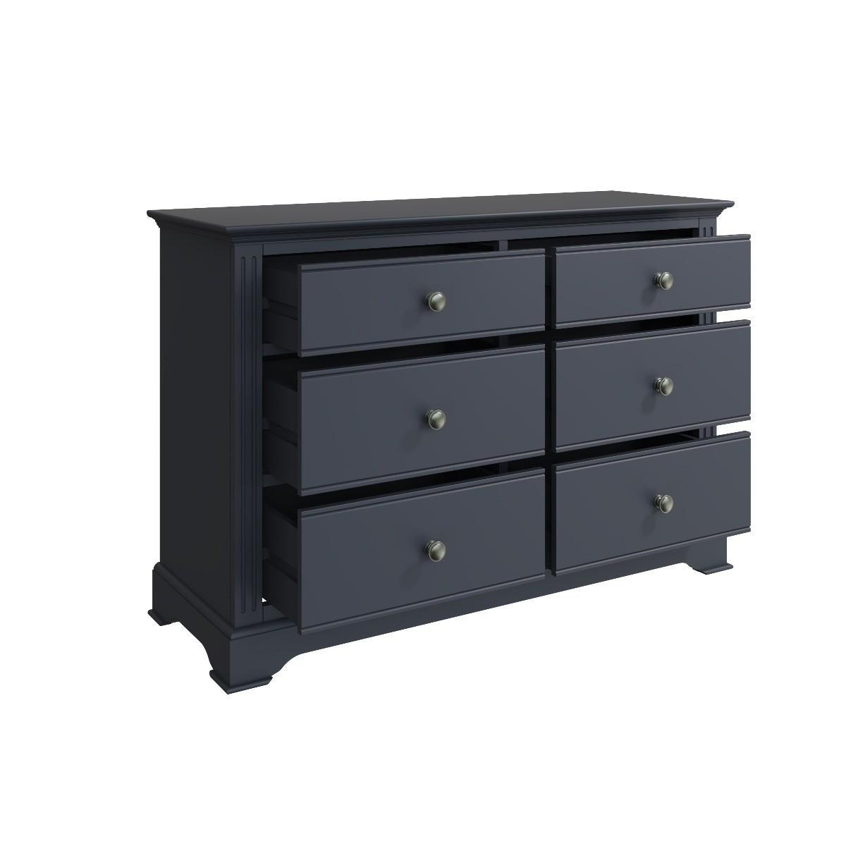 The Aubrey collection is dark and mysterious with linear detailing and sculptured cornices painted in a sophisticated midnight grey. No detail has been left out with this gorgeous and immensely practical contemporary chest. You’ll be delighted at the volume of clothes that can be folded and stored in the six deep drawers. Robustly crafted from pine and MDF for extra durability. Drawers on wooden runners for easy opening Pewter effect knob handles. Finished in a modern midnight grey paint