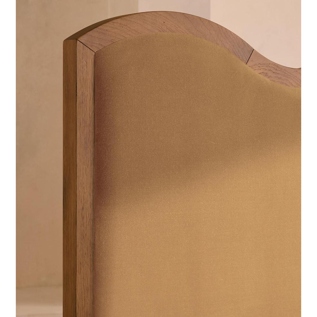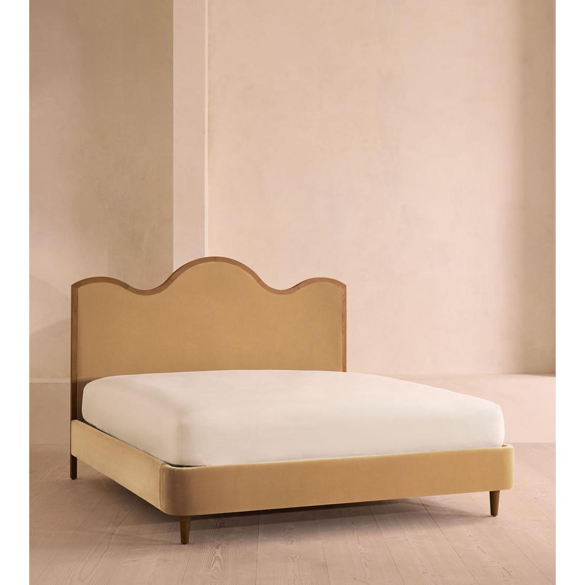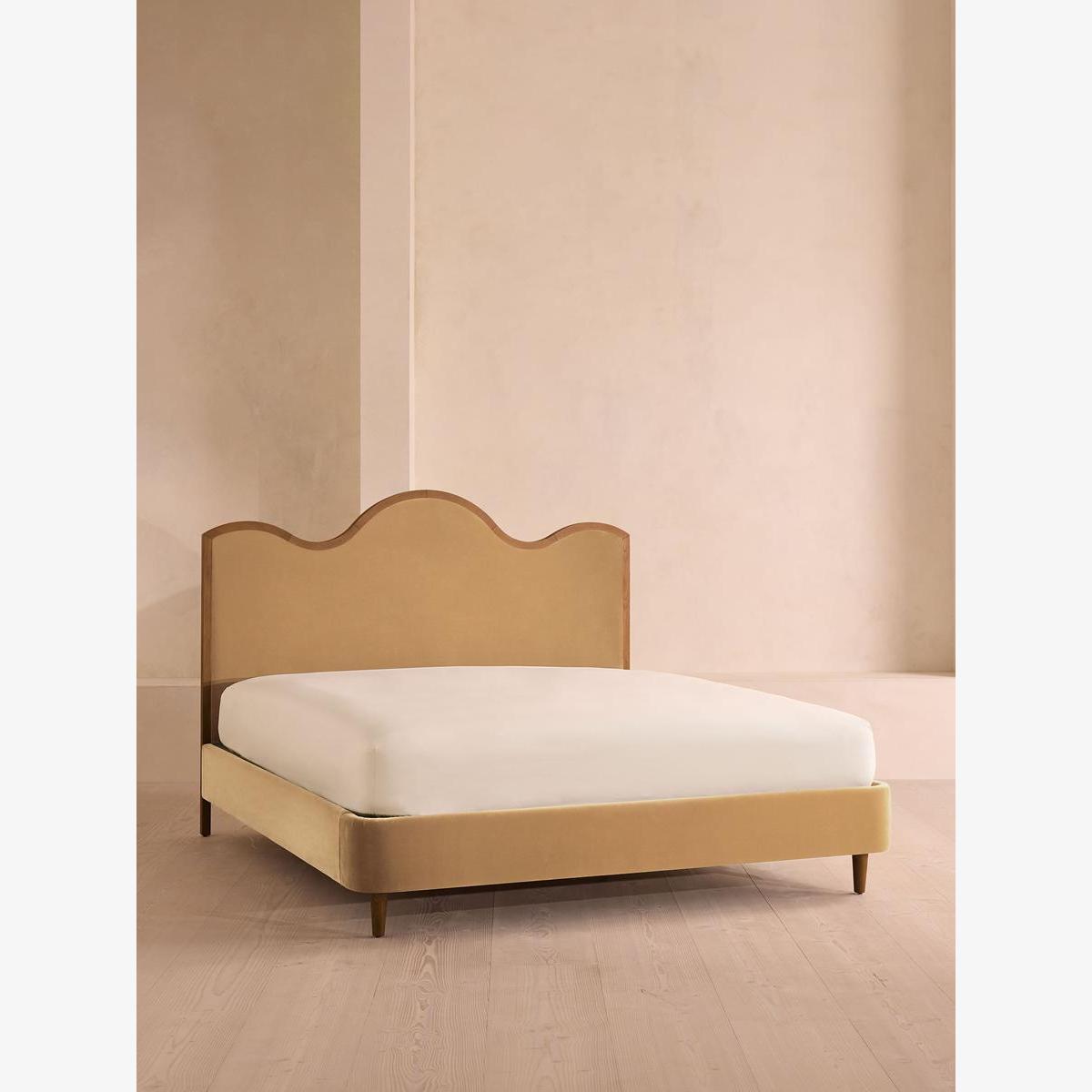 A waved headboard fully upholstered in velvet is framed with a solid oak border. The solid oak frame of our Aubrey bed creates a low, relaxed profile perched on tapered wooden legs. Characterised by its eye-catching, waved headboard, this style is upholstered in velvet designed to match back to the rest of our collection.