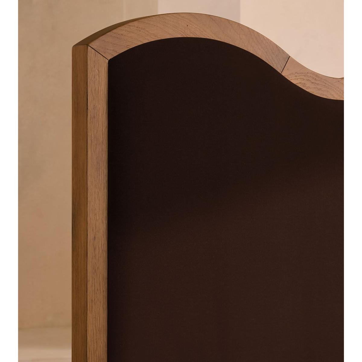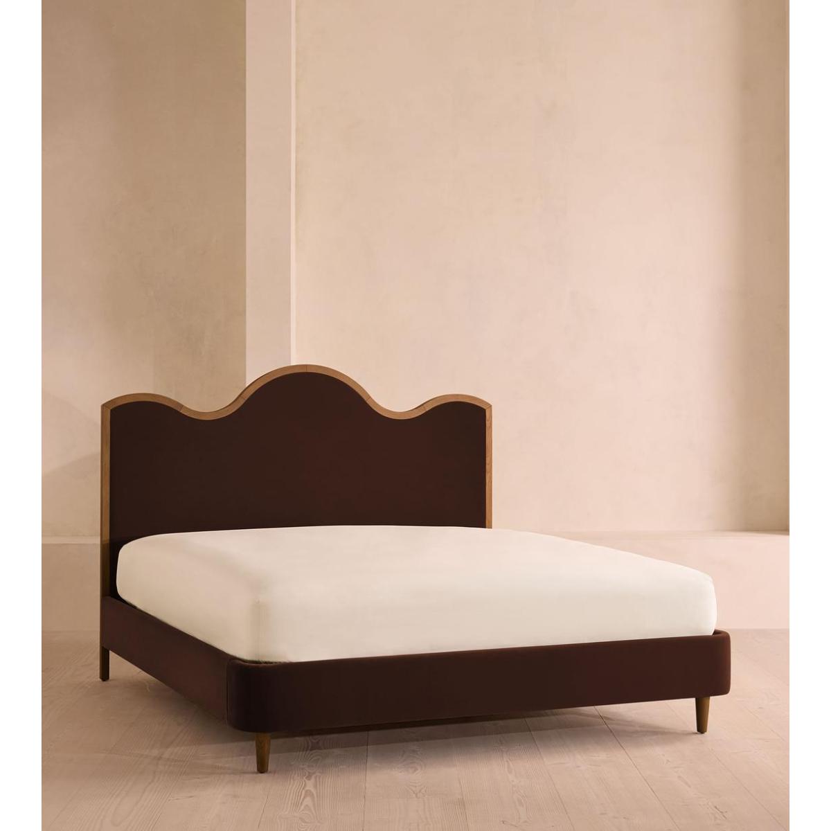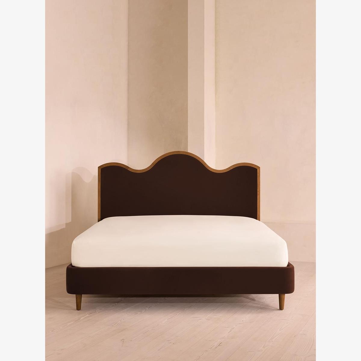 A waved headboard fully upholstered in velvet is framed with a solid oak border. The solid oak frame of our Aubrey bed creates a low, relaxed profile perched on tapered wooden legs. Characterised by its eye-catching, waved headboard, this style is upholstered in velvet designed to match back to the rest of our collection.