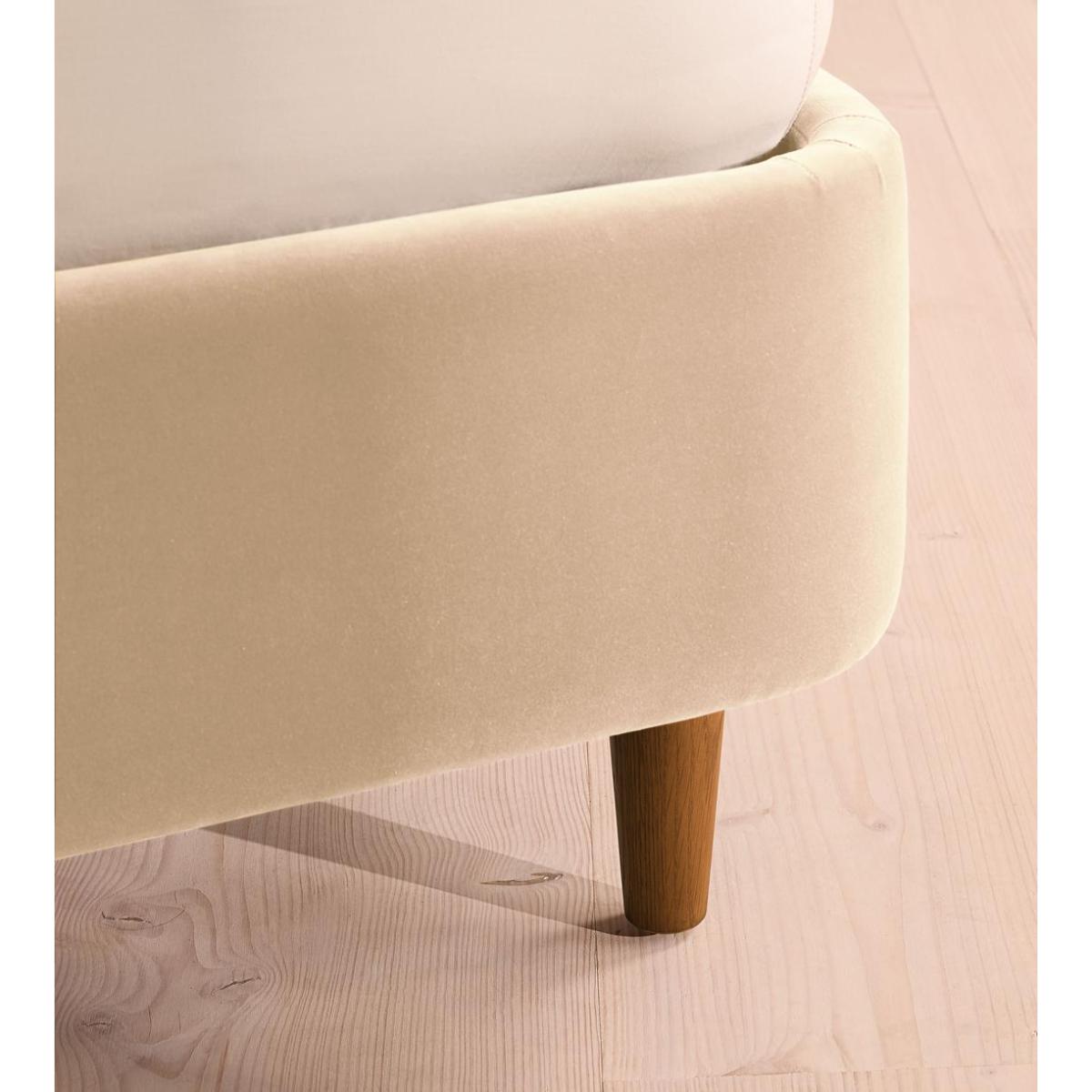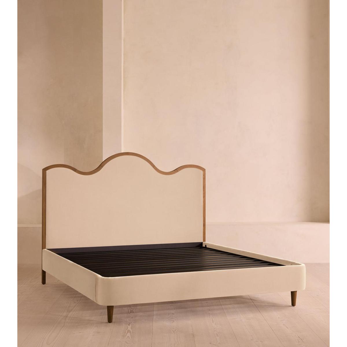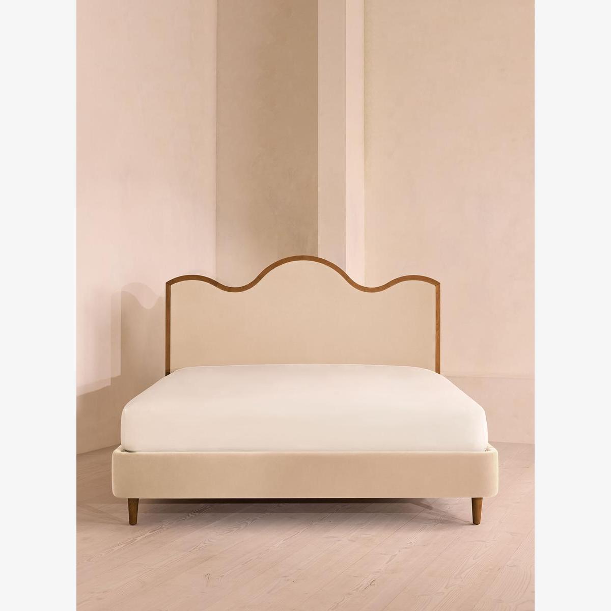 A waved headboard fully upholstered in velvet is framed with a solid oak border. The solid oak frame of our Aubrey bed creates a low, relaxed profile perched on tapered wooden legs. Characterised by its eye-catching, waved headboard, this style is upholstered in velvet designed to match back to the rest of our collection.