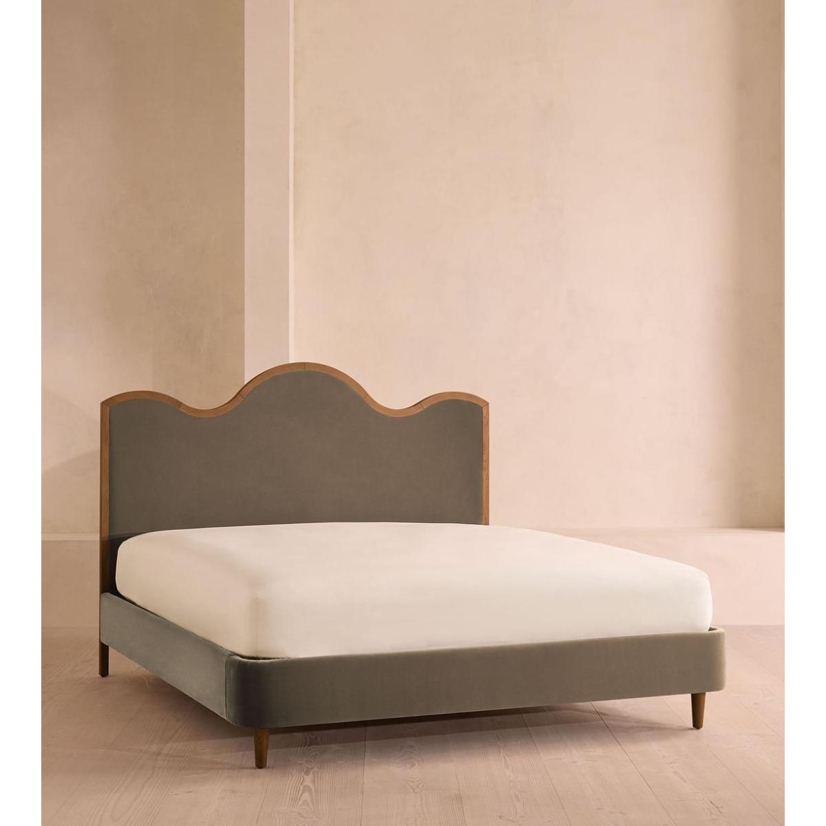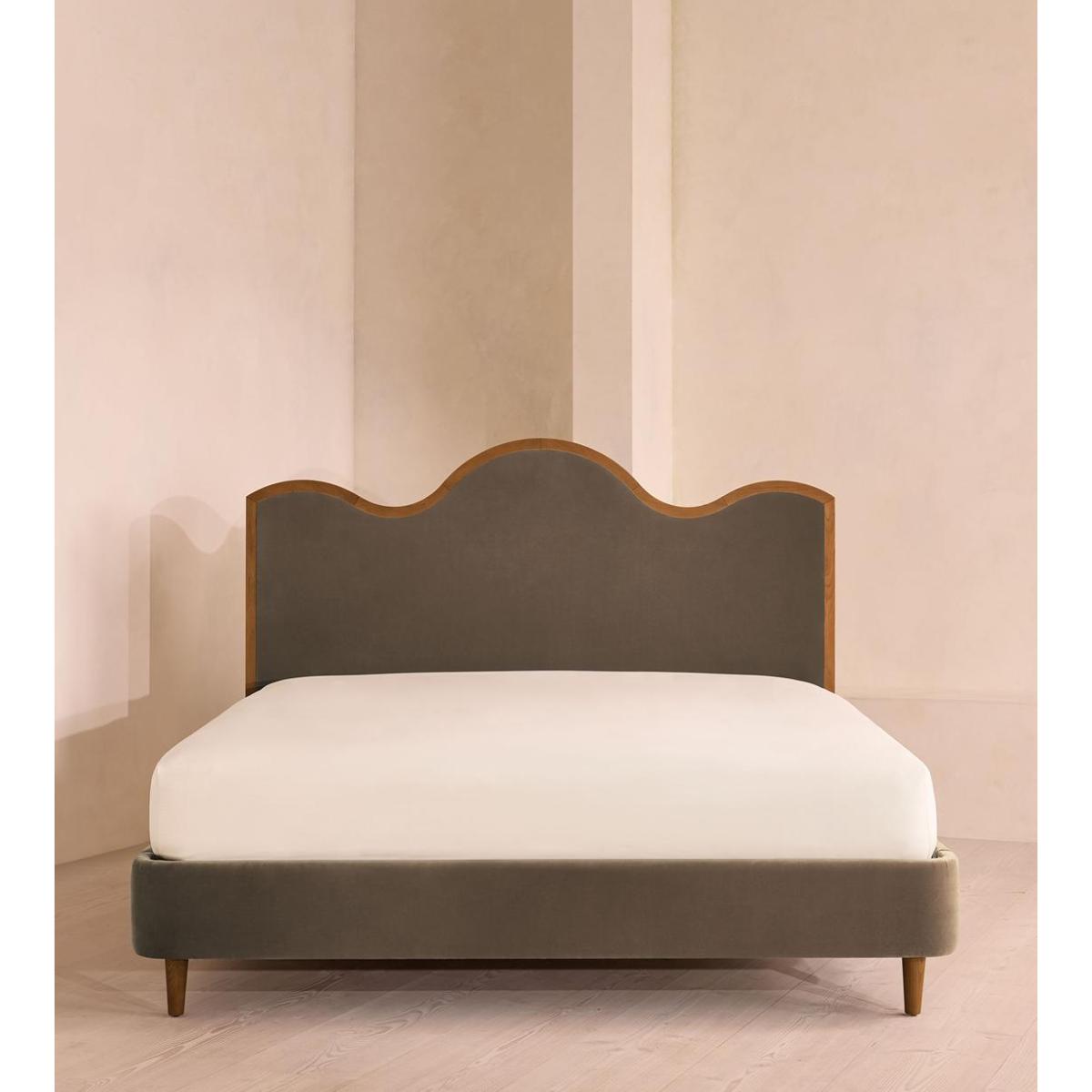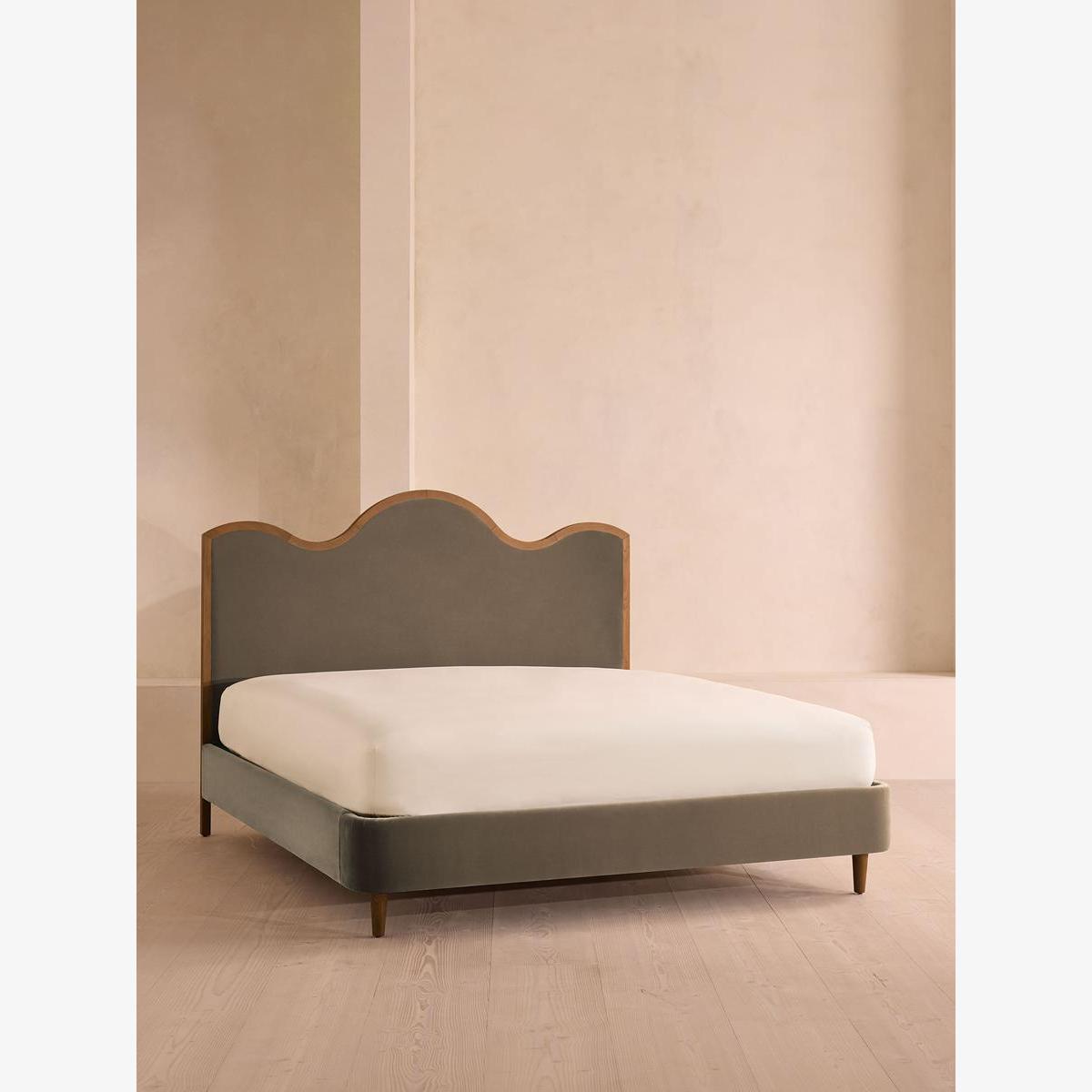 A waved headboard fully upholstered in velvet is framed with a solid oak border. The solid oak frame of our Aubrey bed creates a low, relaxed profile perched on tapered wooden legs. Characterised by its eye-catching, waved headboard, this style is upholstered in velvet designed to match back to the rest of our collection.
