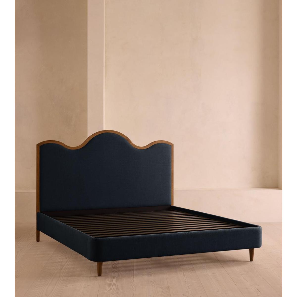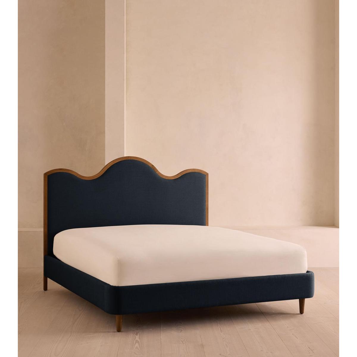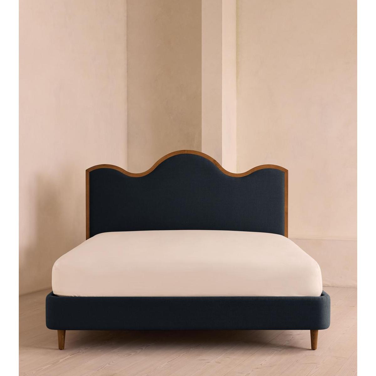 A waved headboard fully upholstered in linen is framed with a solid oak border. The solid oak frame of our Aubrey bed creates a low, relaxed profile perched on tapered wooden legs. Characterised by its eye-catching, waved headboard, this style is upholstered in linen designed to match back to the rest of our collection.