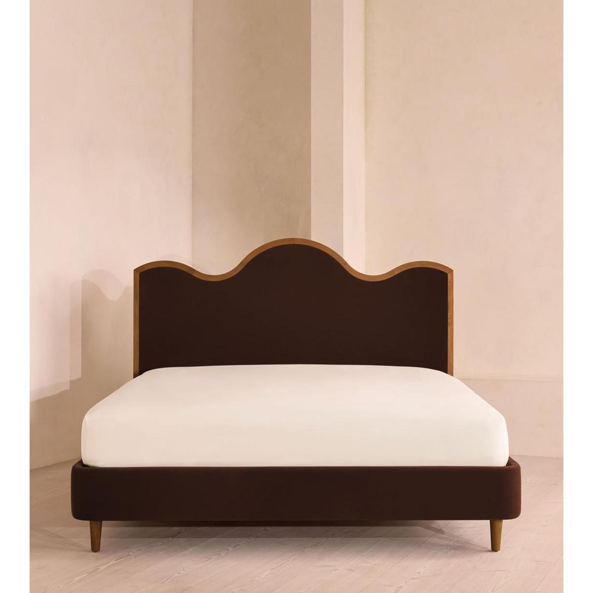 A waved headboard fully upholstered in velvet is framed with a solid oak border. The solid oak frame of our Aubrey bed creates a low, relaxed profile perched on tapered wooden legs. Characterised by its eye-catching, waved headboard, this style is upholstered in velvet designed to match back to the rest of our collection.