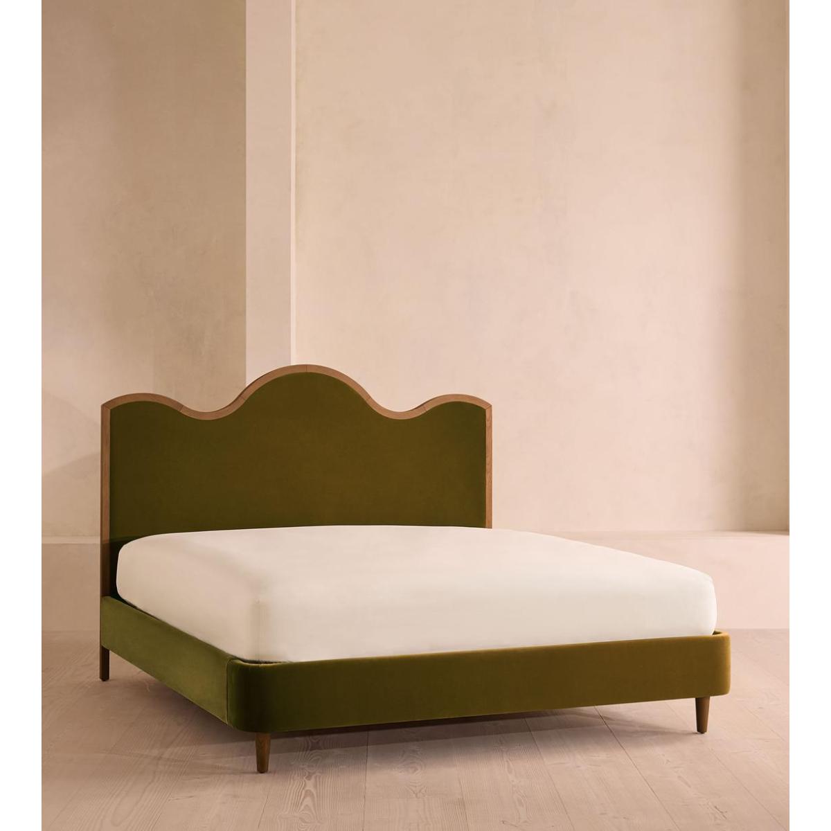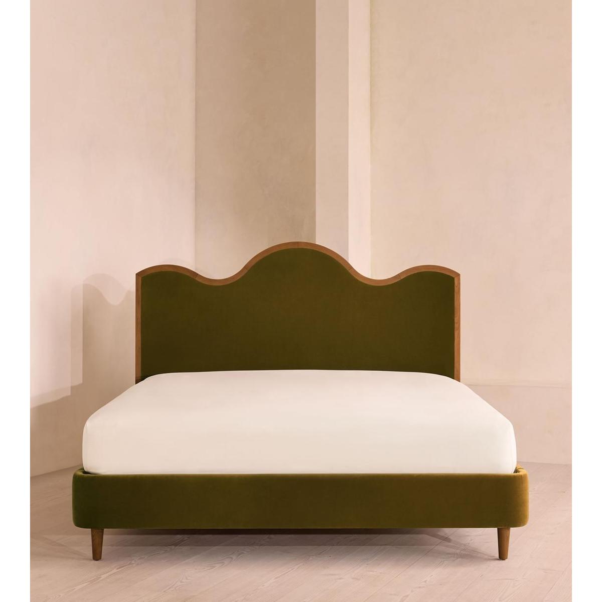 A waved headboard fully upholstered in velvet is framed with a solid oak border. The solid oak frame of our Aubrey bed creates a low, relaxed profile perched on tapered wooden legs. Characterised by its eye-catching, waved headboard, this style is upholstered in velvet designed to match back to the rest of our collection.