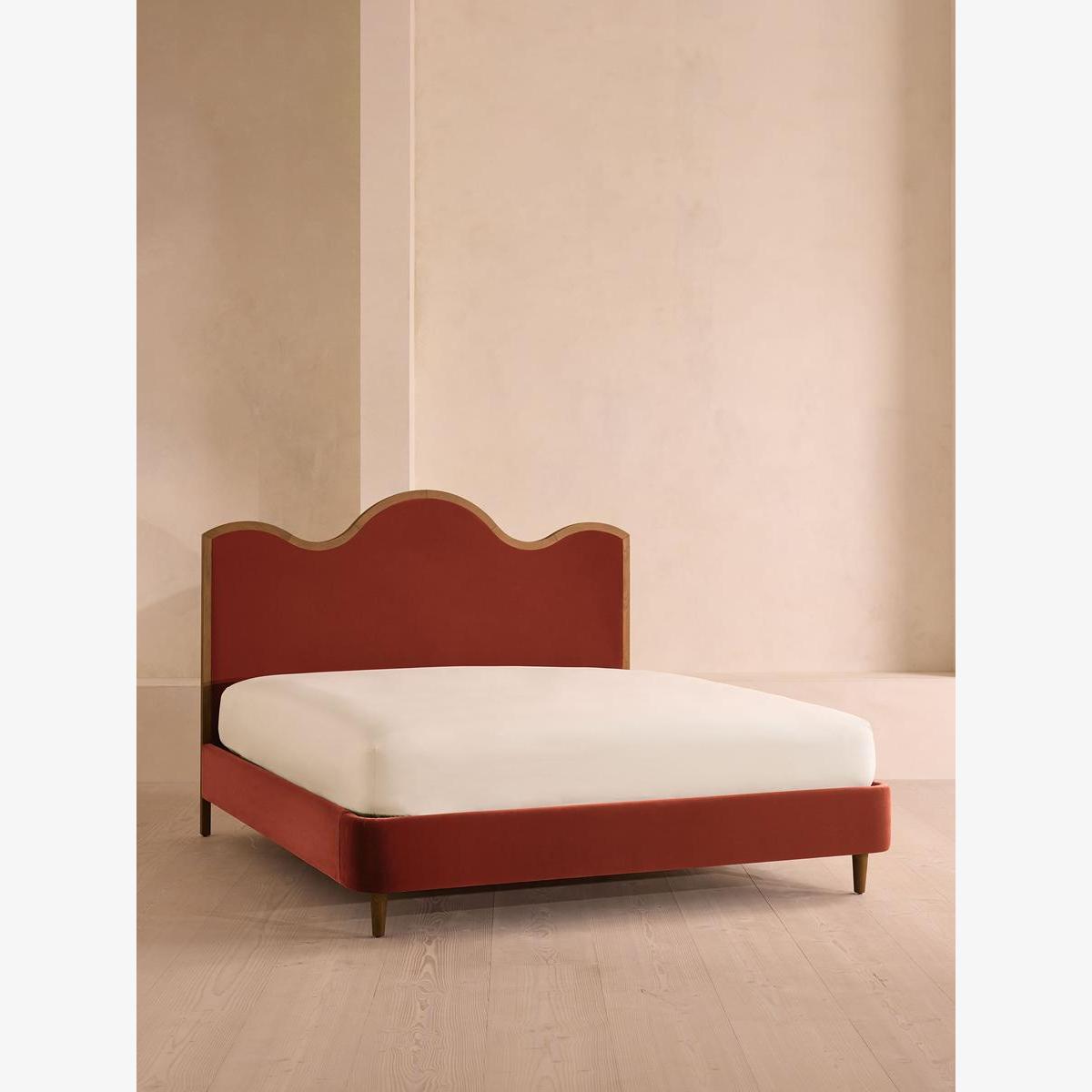 A waved headboard fully upholstered in velvet is framed with a solid oak border. The solid oak frame of our Aubrey bed creates a low, relaxed profile perched on tapered wooden legs. Characterised by its eye-catching, waved headboard, this style is upholstered in velvet designed to match back to the rest of our collection.