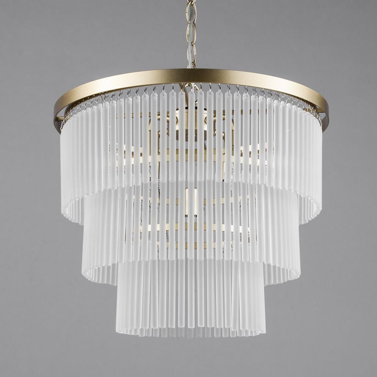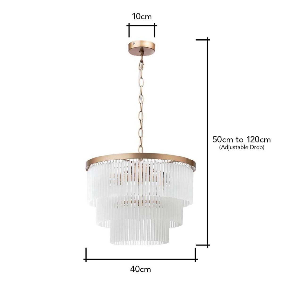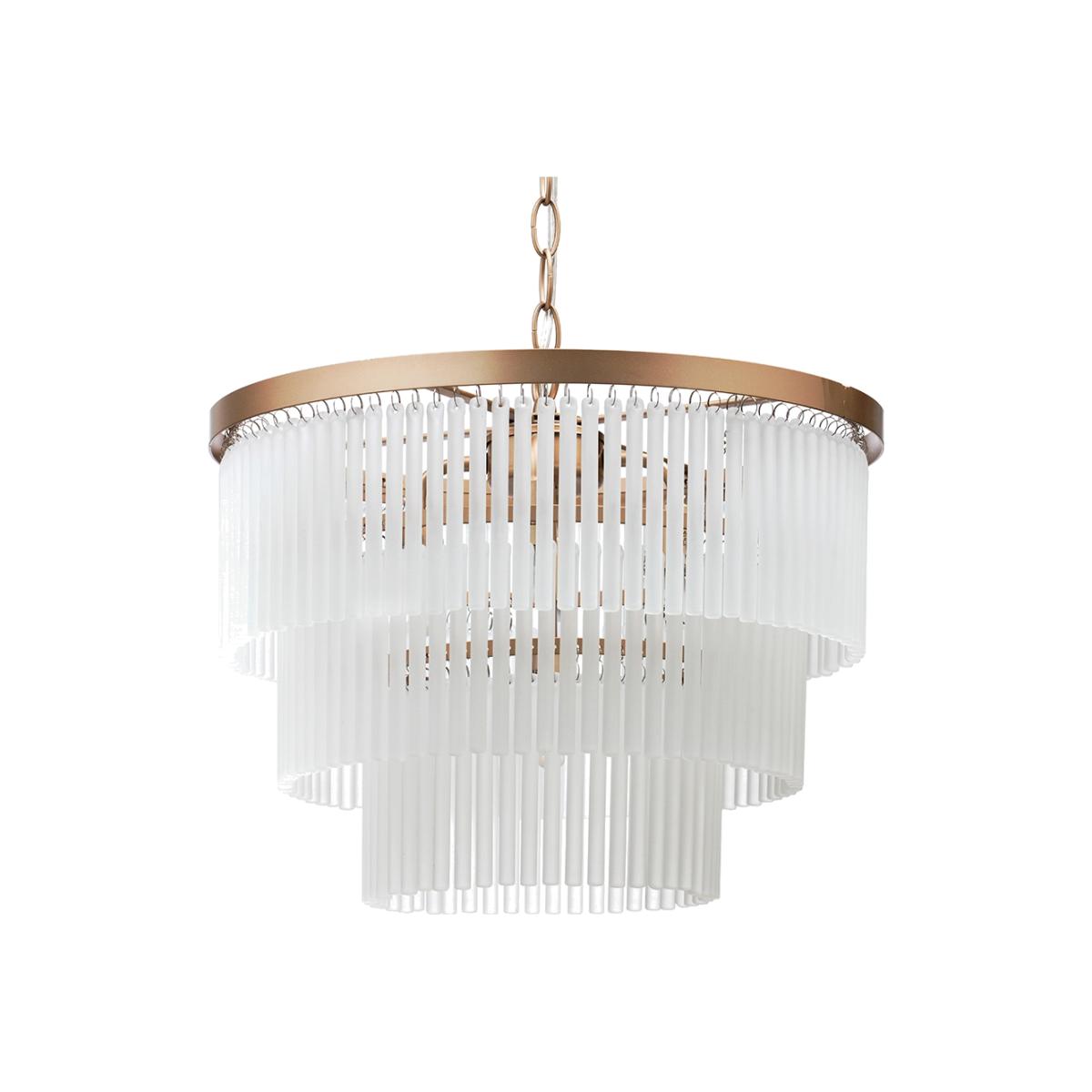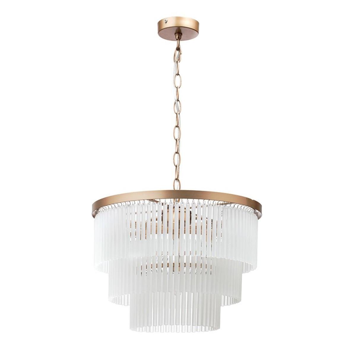 One of our most sophisticated ceiling lights, the Aubrey pendant light in brass gives a classy, yet distinctively modern look to any interior. The 3 tier pendant fitting features frosted glass rods, which form a shade around the lights for a softer, more ambient glow in the room. With brass accents, this elegant pendant light is the perfect centrepiece for any bedroom, living room, or dining room, bringing a refined elegance into the heart of your home.