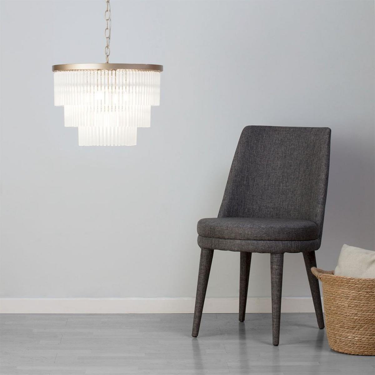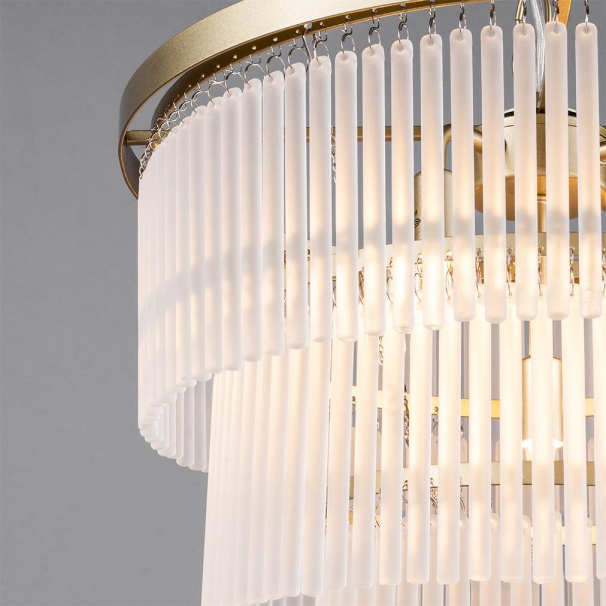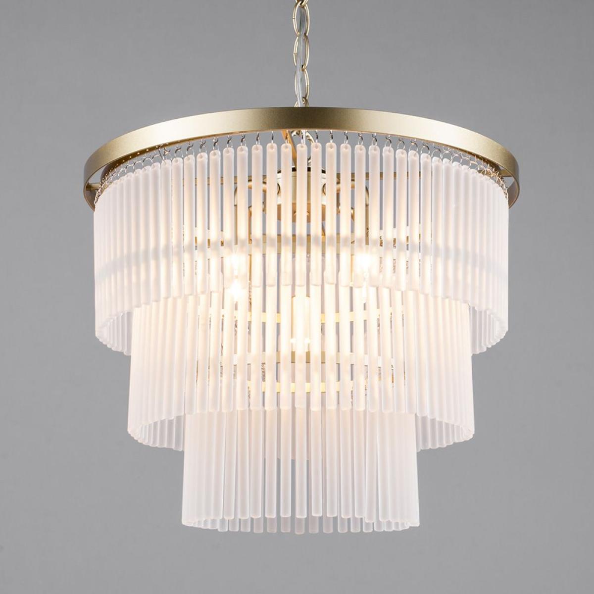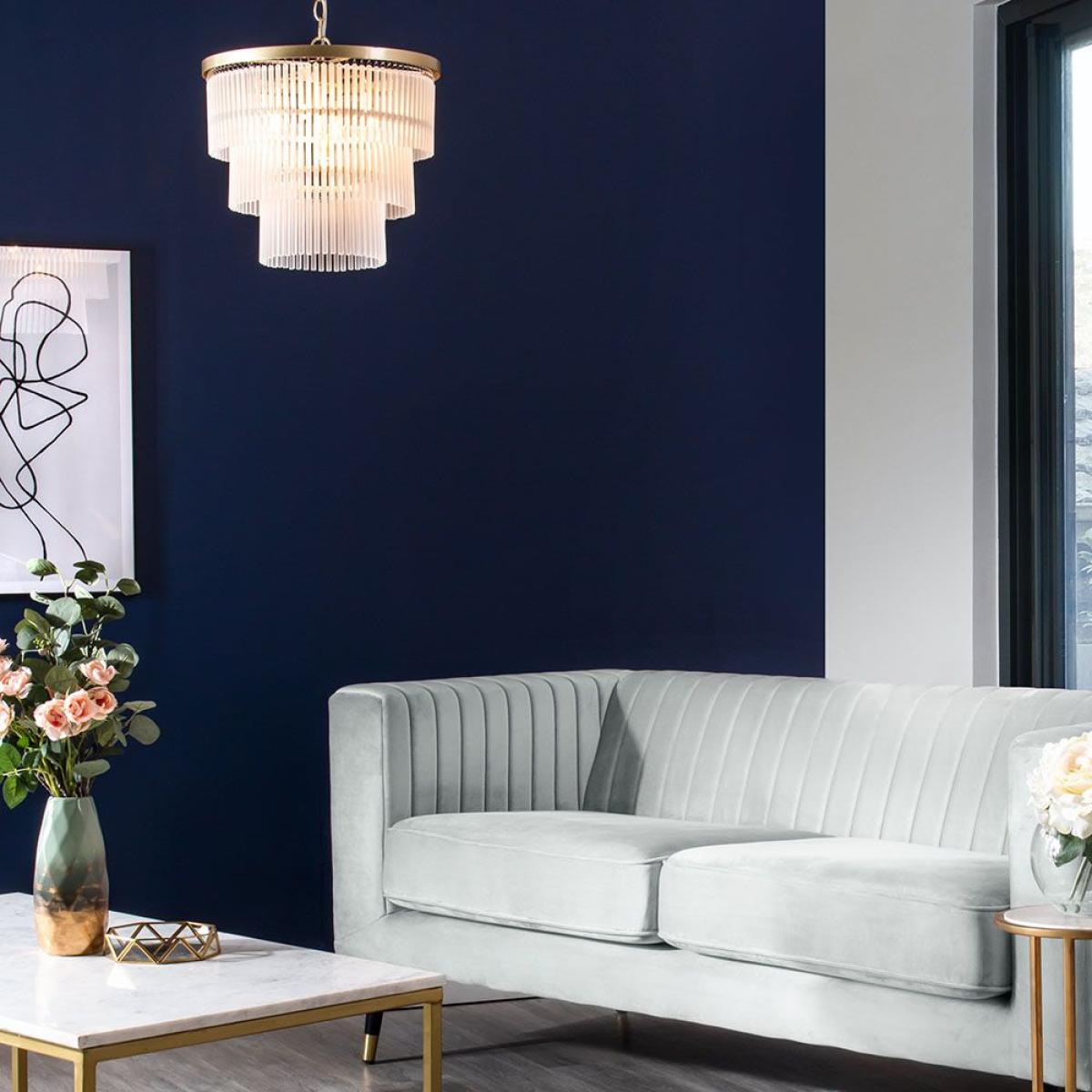 One of our most sophisticated ceiling lights, the Aubrey pendant light in brass gives a classy, yet distinctively modern look to any interior. The 3 tier pendant fitting features frosted glass rods, which form a shade around the lights for a softer, more ambient glow in the room. With brass accents, this elegant pendant light is the perfect centrepiece for any bedroom, living room, or dining room, bringing a refined elegance into the heart of your home.