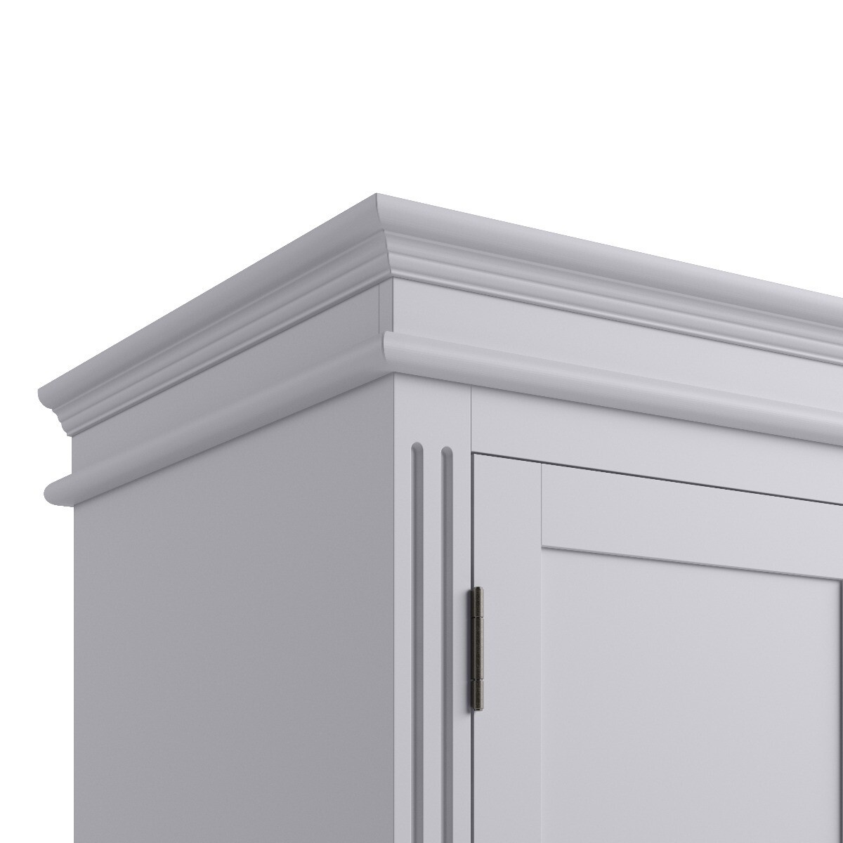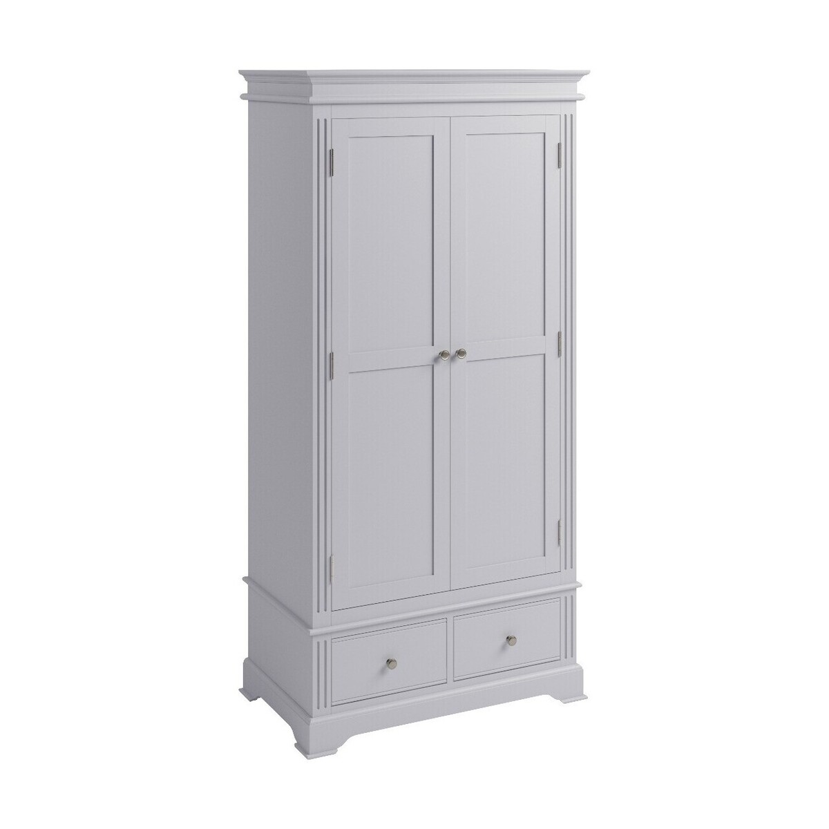 Stylish and durable, the Aubrey Grey 2 Door Wardrobe features a classic design to complement any interior. Crafted from durablewood with a grey painted finish, the 2 door wardrobe offers full hanging space and features a removable solid wood hanging rail. The grey wardrobe is complete with 2 convenient lower drawers and is finished with pewter effect knobs. Classically stylish grey painted wardrobe. Sturdy solid wood frame. Offers full hanging space. Sculpted cornices and linear detail for an elegant look to suit any bedroom. Removable solid wood hanging rail. 2 deep drawers on wooden guides offer additional storage. Pewter effect knobs complete the look. Match the wardrobe with other items from the Aubrey Grey Collection.
