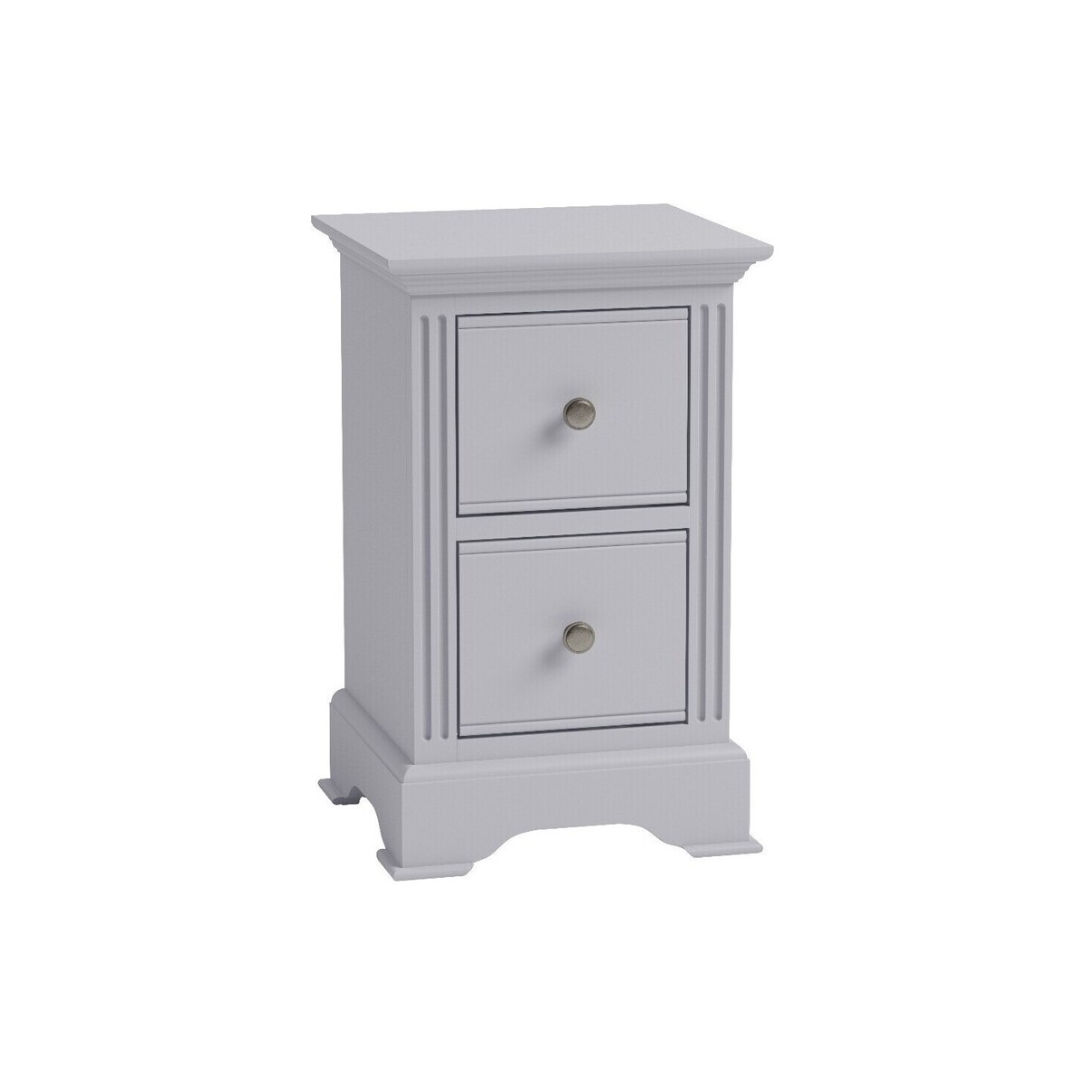 The Aubrey Small Grey Bedside Table brings classic style to any bedroom setting. The small bedside table is crafted from sturdy solid wood with a soft moonlight-grey painted finish and features elegant sculpted cornices. Offering handy storage space, the small grey bedside table is complete with 2 deep drawers with pewter effect knobs. Bedside table with timeless design suits any interior. Sturdy solid wood frame with soft grey painted finish. 2 deep drawers on wooden guides offer handy storage. Sculpted cornices for an elegant look. Pewter effect knobs provide the perfect finishing touch. Fully assembled. Complements other items from the Aubrey Collection.