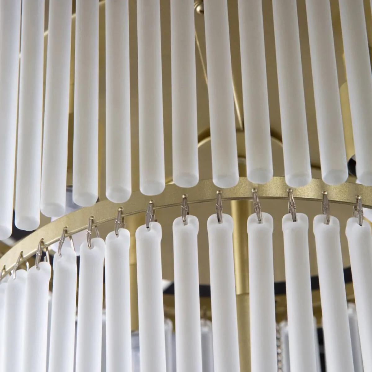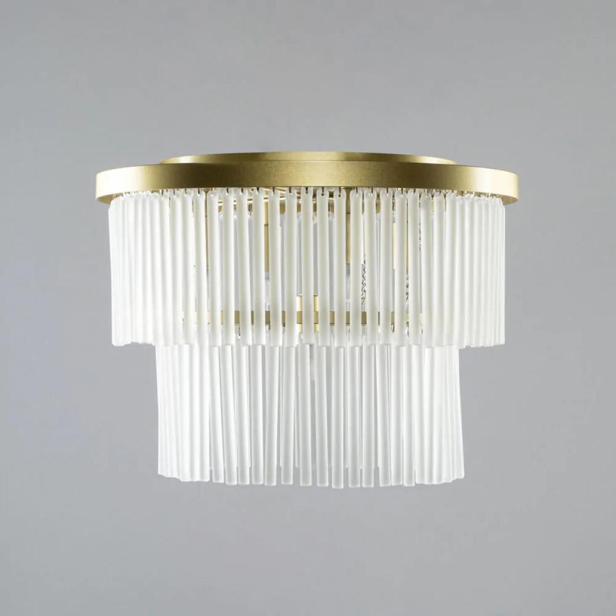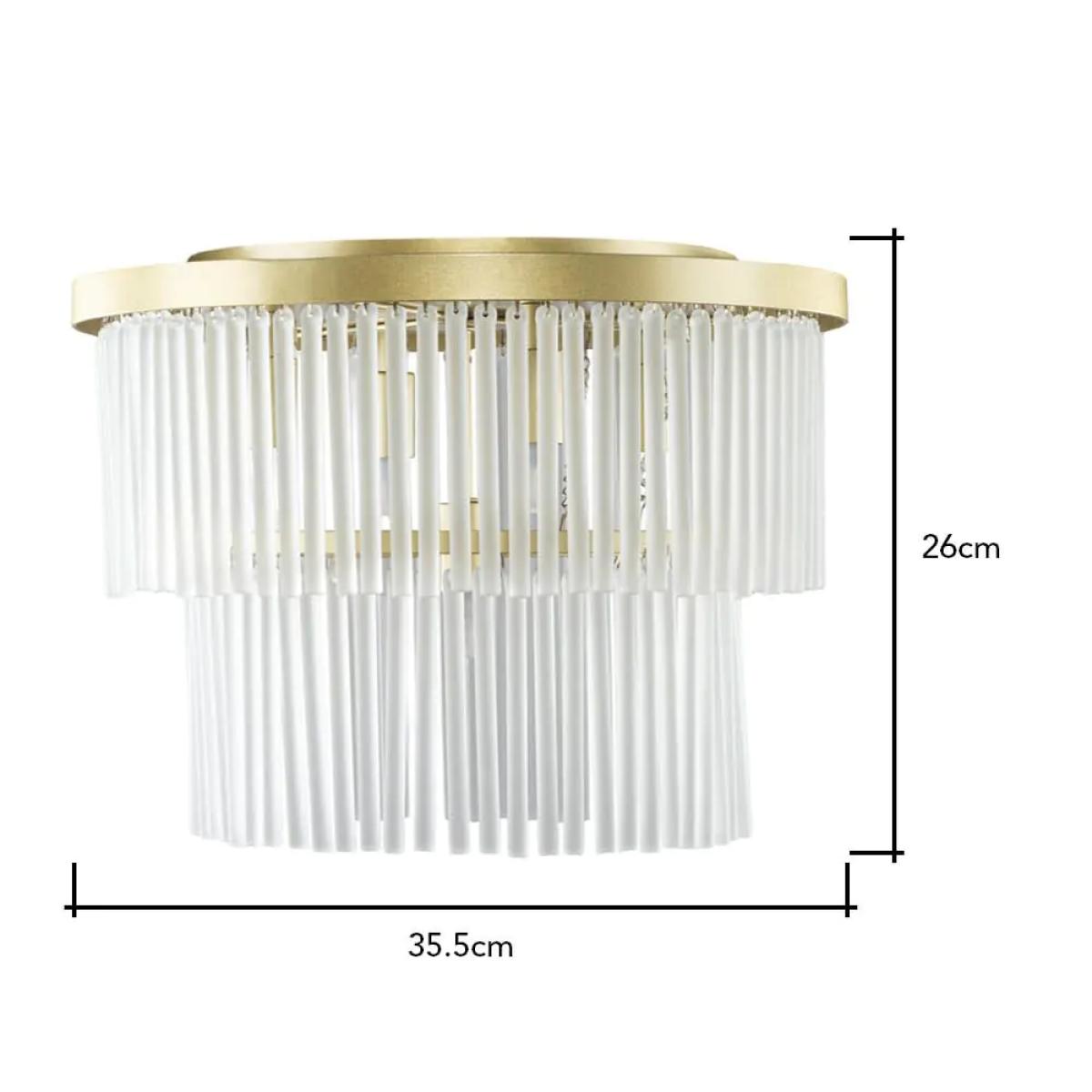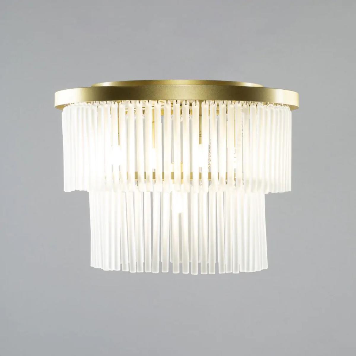 Get stylish and chic lighting looks for low ceilings with the Aubrey Tiered Flush Ceiling Light. This ceiling flush light comes in a satin brass finish for a post modern aesthetic and features tiers of beautiful frosted glass bars for a warm glow diffused outwards. It is also ideal for low ceilings in hallways or landings due to the flush design providing a minimal drop height.