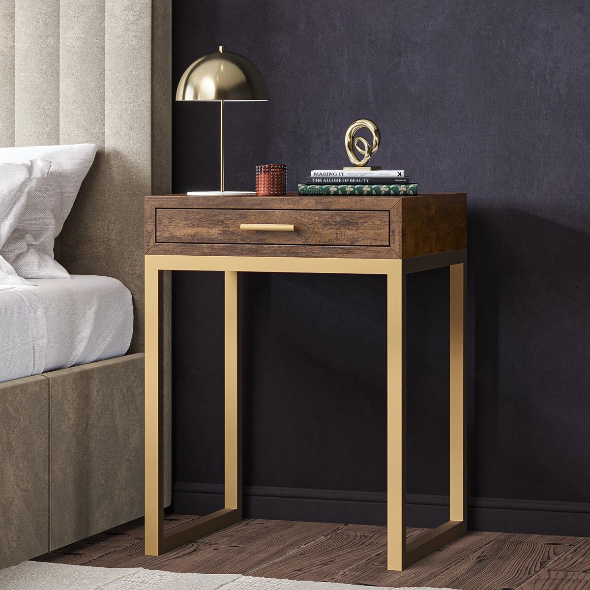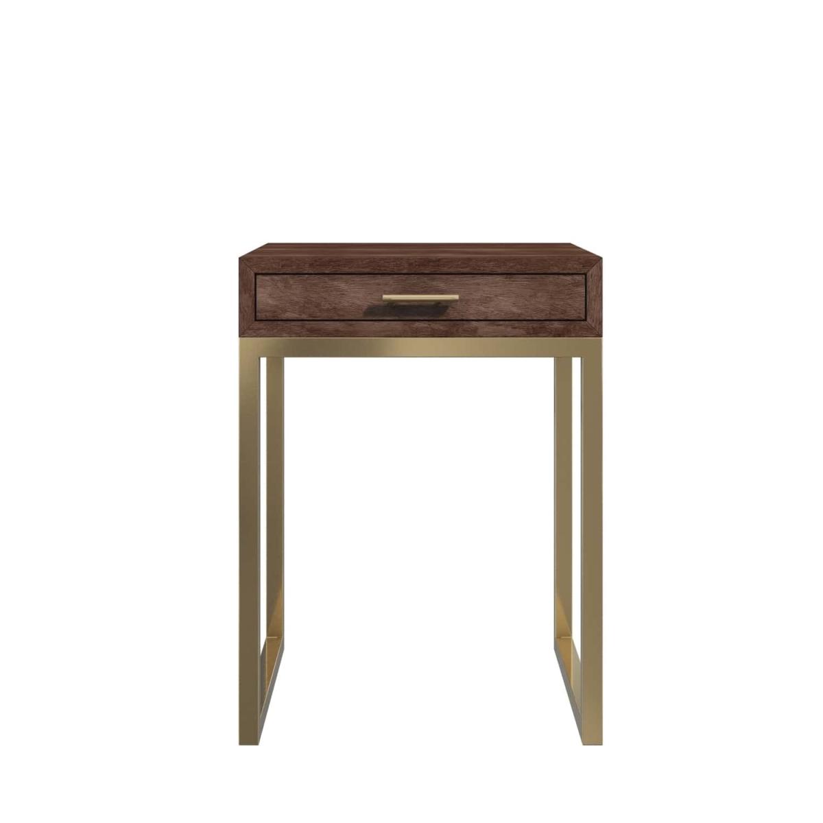 What stands out Expertly handcrafted by skilled artisans each piece offers its own charm and characteristics to ensure each piece is truly unique and individual. Contemporary in design adding an industrial twist to a more traditional piece. The walnut finish and gold details help produce a warming piece overall. Its solid design means you can be confident it'll withstand the test of time. Individually handmade every piece has a unique element and personal touch. Minimal assembly required; simply screw in the legs. Created using 100% vegan friendly materials The details. Combining traditional style with an industrial influence the Aubrey bedside table offers the finest quality when it comes to decking out your home. Handmade every piece exudes warmth and sense of individuality that anyone can appreciate. Whether you stand a lamp upon the chunky top or simply use it as somewhere to set down your book as you settle down for the night the Aubrey bedside table is well up to the challenge. The walnut effect top offers a sense of traditional design contrasting against the gold finished base and handle in the best possible way to create a piece that suits both modern and classic styles alike. Featuring a neat drawer this bedside table provides the perfect place to store away clutter keeping everything within easy reach. Essential info. Dimensions. H 61 x W 45.5 x D 41 cm Drawer dimensions. H 6.5 x W 42 x D 41 cm Material. Solid mango wood with iron base Finish. Walnut and gold PU Drawers. 1 Assembly required. Yes More info Handmade piece for personal touch. Assembly required. Matching items available in the Aubrey range. Made from sustainably sourced wood materials.