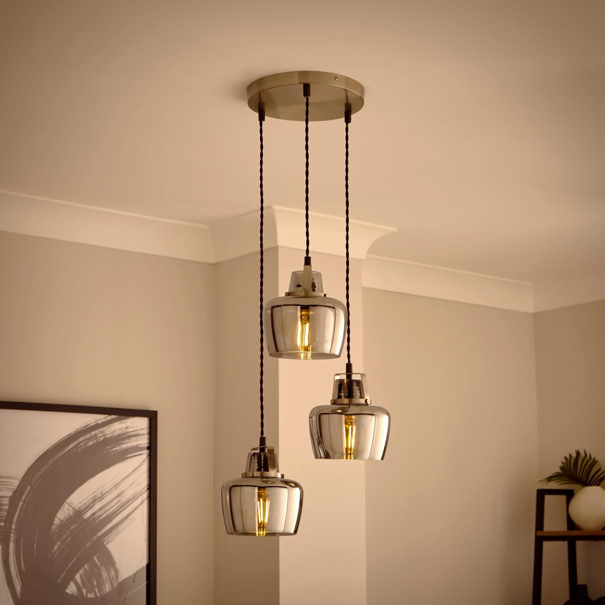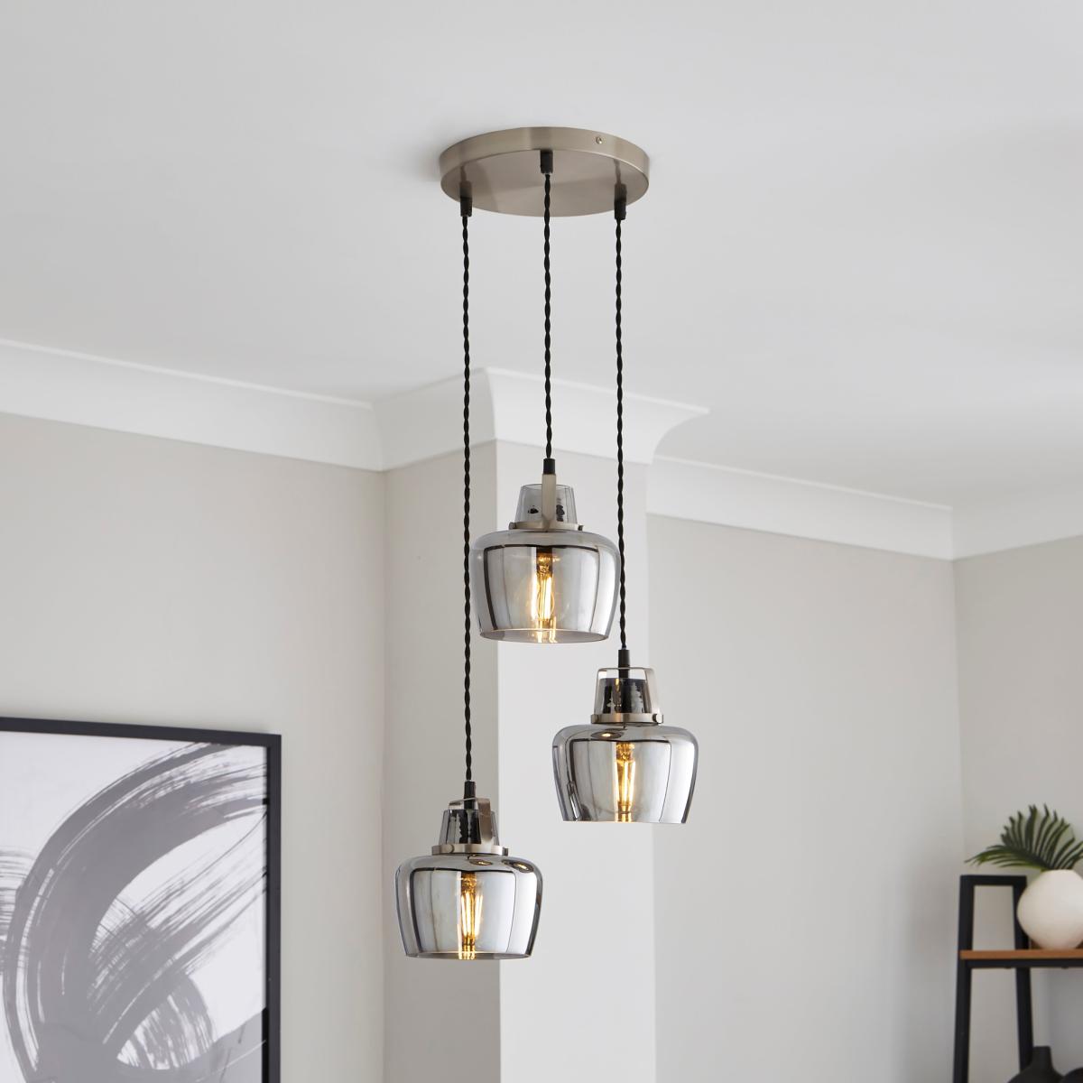 * Industrial-Inspired Design * Made from Sturdy Glass & Metal * Height Adjustable - Tailored Ambience * Requires: Standard (GLS) Bulbs & E27 Cap Types Add a statement to your ceiling with the Auburn Industrial 3 Light Adjustable Cluster Ceiling Light. A unique twist, this light features three smoked glass shades and sturdy satin-nickel metalwork - effortlessly complementing both modern and classic interiors.