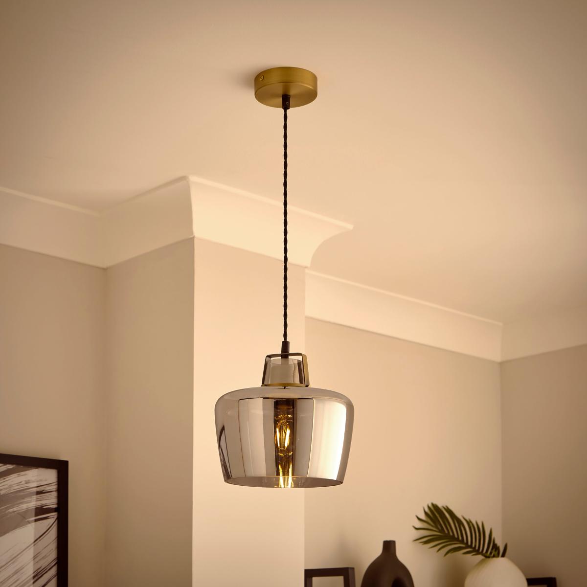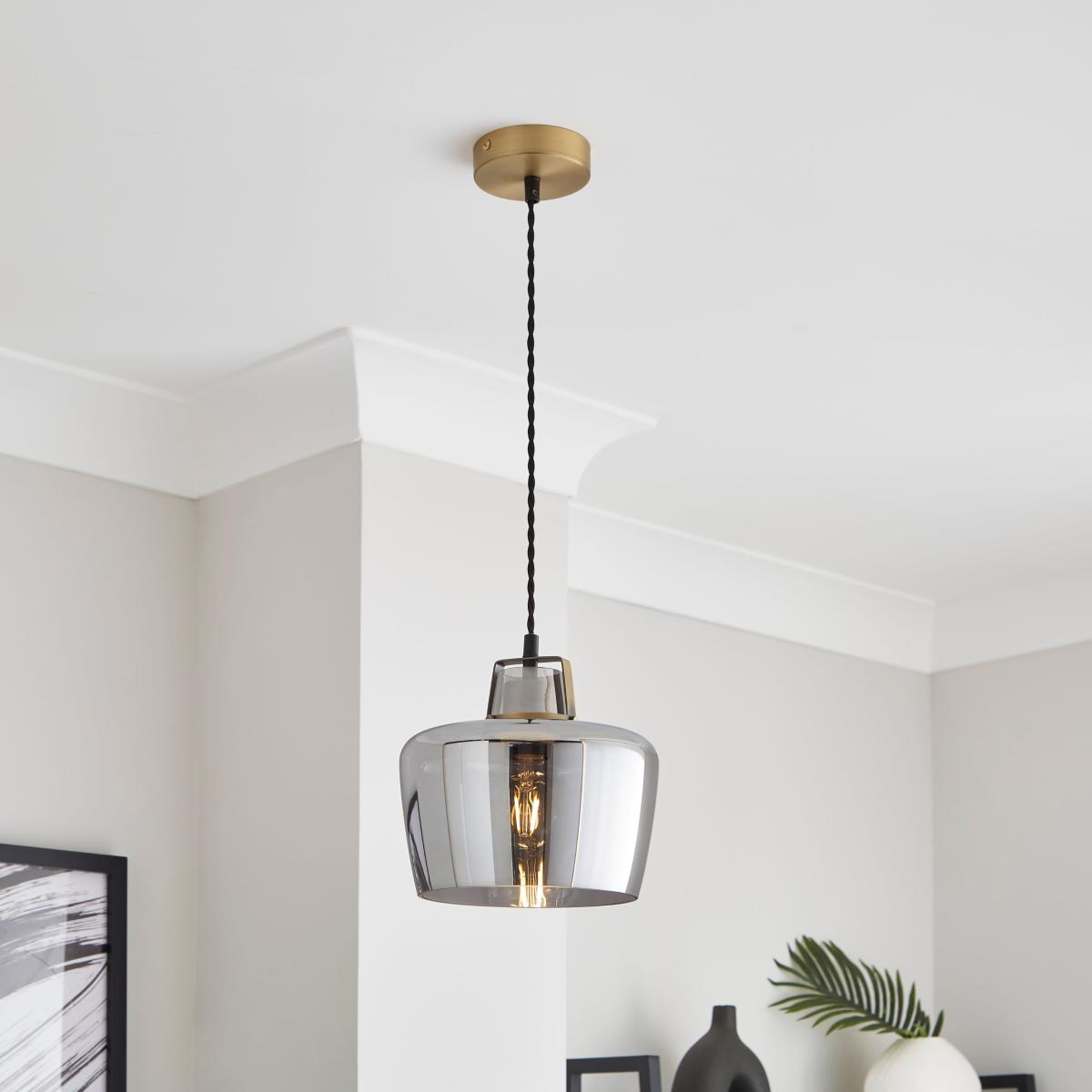 * Modern-Industrial Look & Design * Made from Sturdy Metal & Glass * Height Adjustable - Tailored Ambience * Requires: Standard (GLS) Bulb & E27 Cap Type Upgrade your living space with the striking Auburn Industrial Adjustable Pendant Light. With a smoked glass shade and sturdy satin-nickel metalwork, it easily complements both classic and modern interiors.