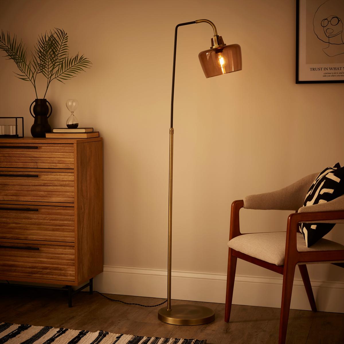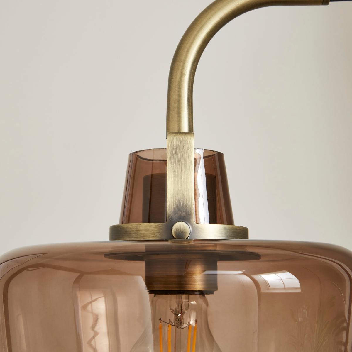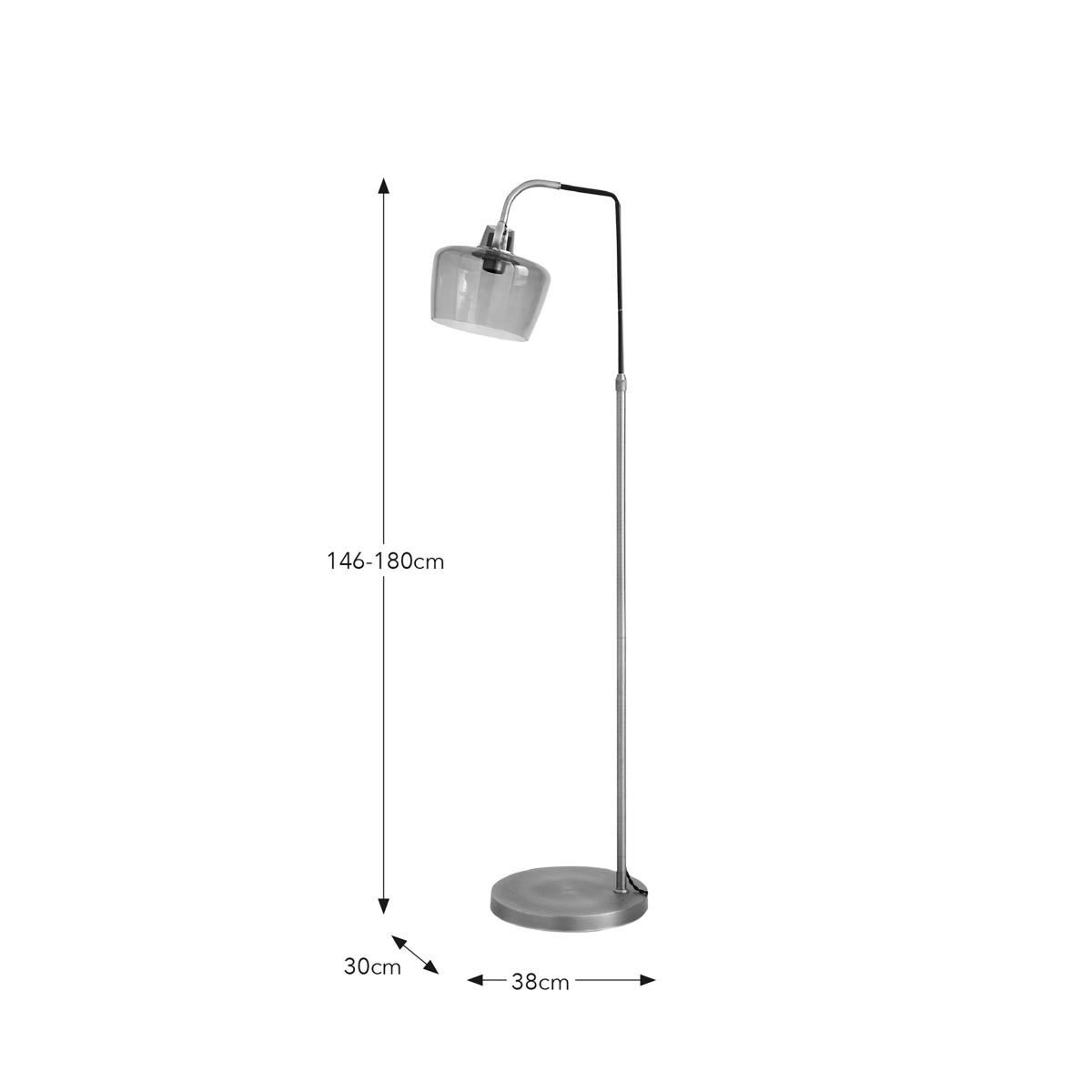 * Adjustable* Glass Shade* Eye-Catching Design Mixing the opulence of complimentary pewter metal work with a smoked glass shade, this adjustable floor lamp is a real style statement for the home. Explore matching products in the rest of the Auburn range.