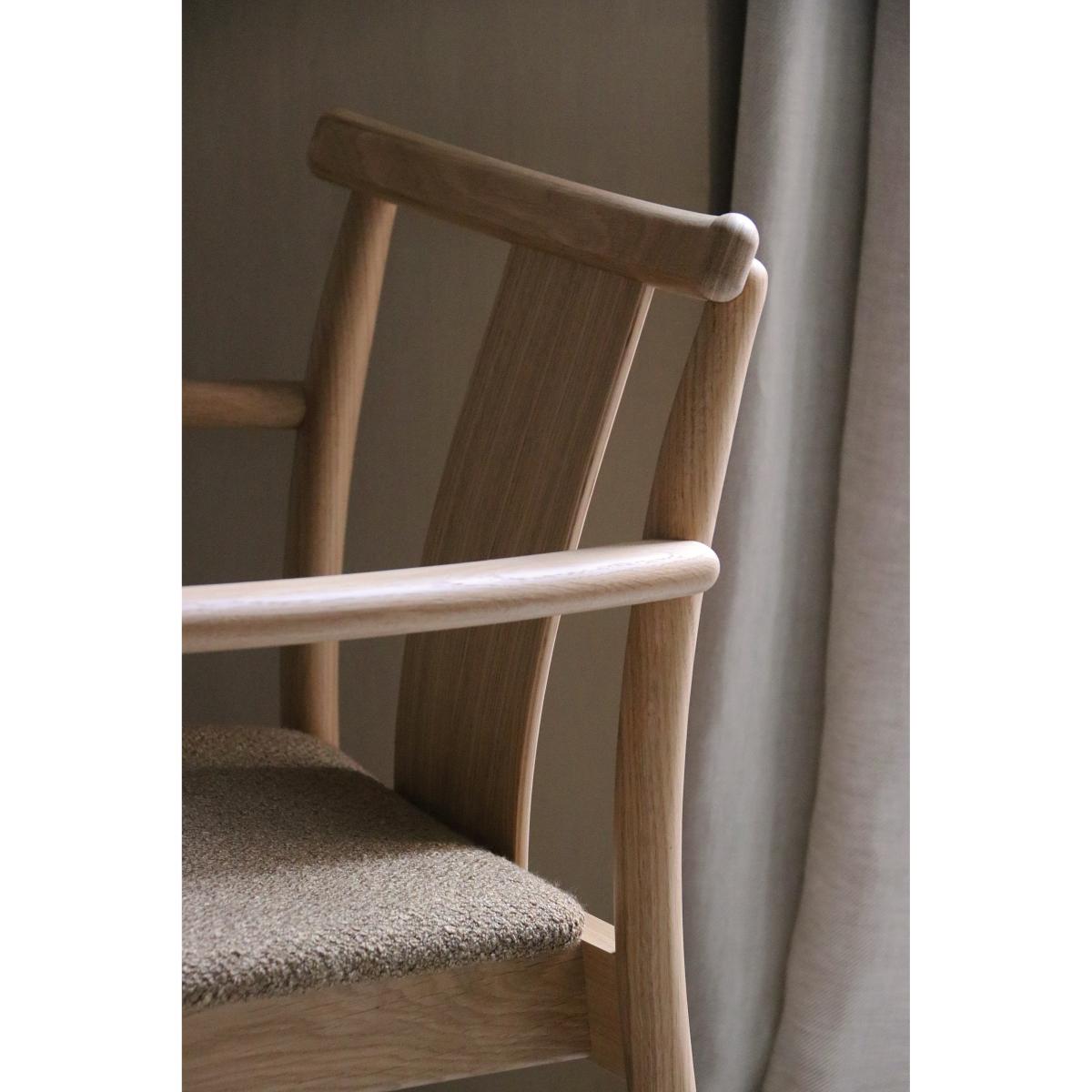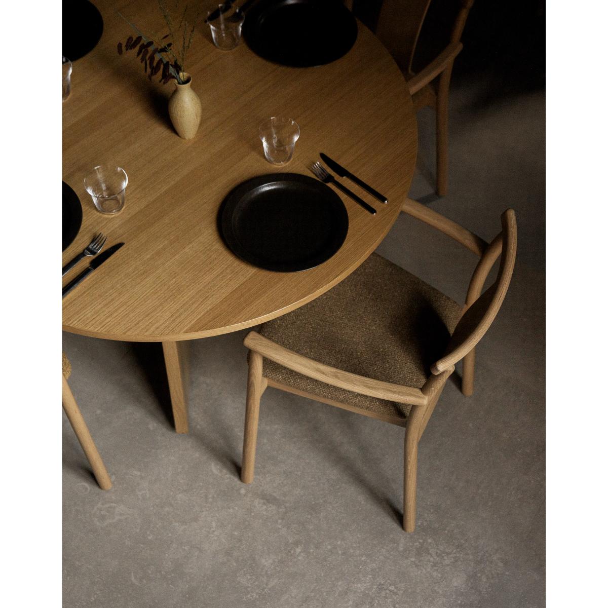 This Audo Copenhagen arm chair is a lovely blend of Scandinavian minimalism and tactile warmth, making it a versatile choice for various interiors. I love how the oak frame adds natural texture and a light, airy feel, while the bouclé cushion in gold offers a touch of understated luxury. It works particularly well in modern dining rooms with neutral palettes or in more eclectic spaces where it can act as a statement piece. For styling tips, consider pairing it with timber or mid-century inspired tables to highlight its natural wood qualities, or contrast it with colourful or patterned tableware to add visual interest. Its understated elegance also makes it suitable for both formal and casual settings, making it a practical yet stylish choice.