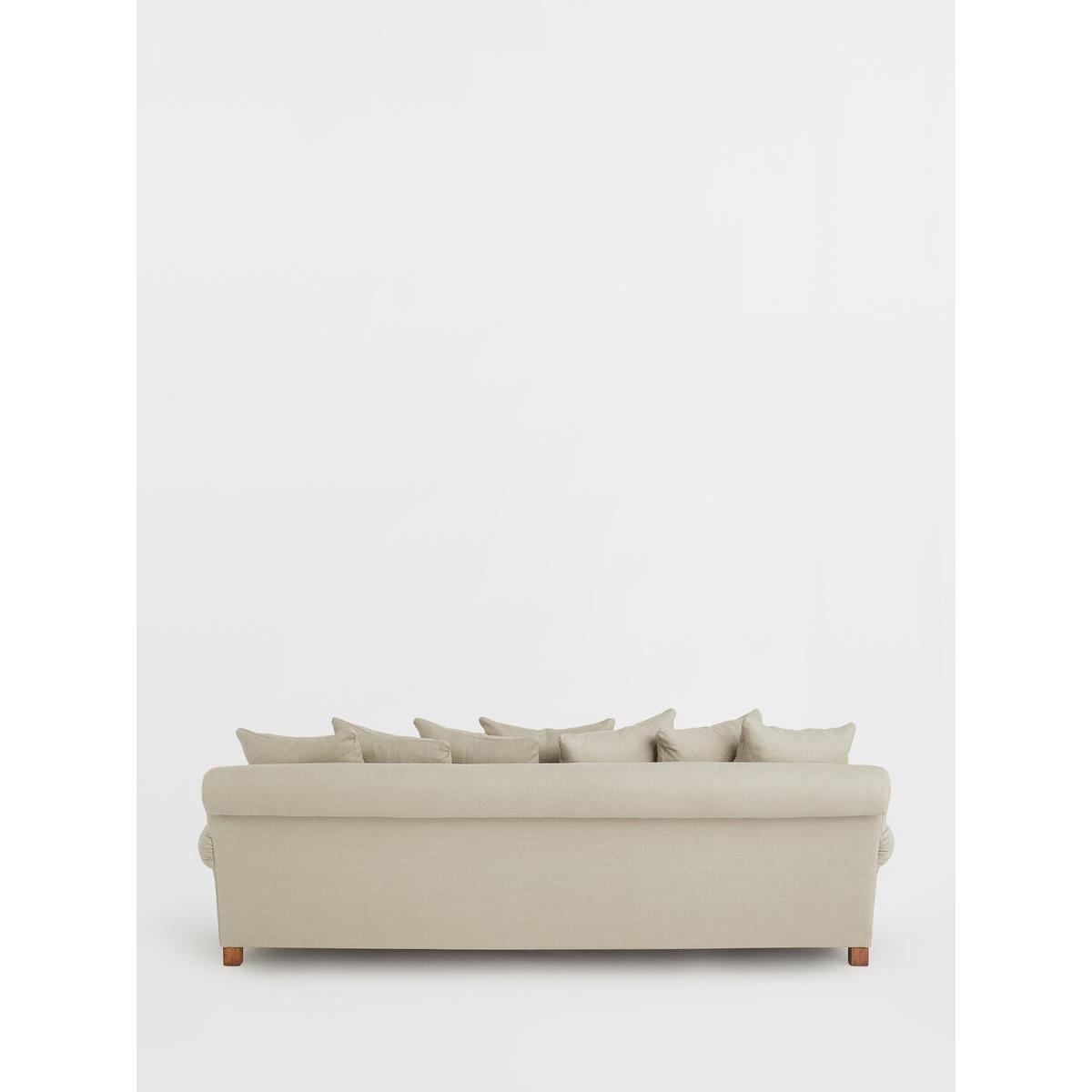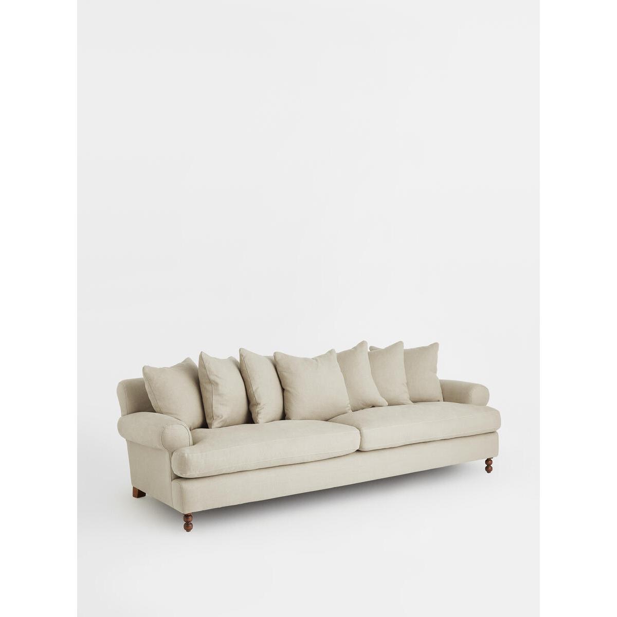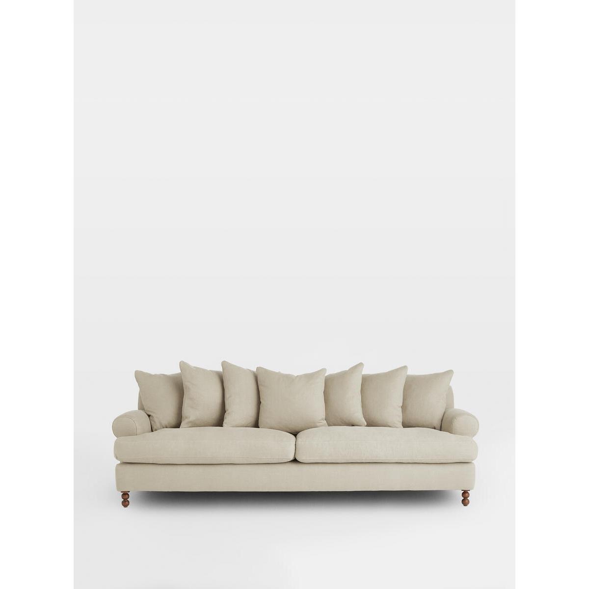 Inspired by the classic interiors of Babington House, our Audrey sofa is cut from linen and shows our take on a traditional cigar arm. The feather-wrapped foam seat cushions enhance the deep-sit lounger shape, while oversized scatter cushions give a homely feel. Linen four-seater sofa Soho House take on a traditional cigar arm FSC-certified solid hardwood frame Deep-sit lounge style Oversized scatter cushions Feather-wrapped foam cushions, fully reversible Solid wood bobbin legs Inspired by Babington House