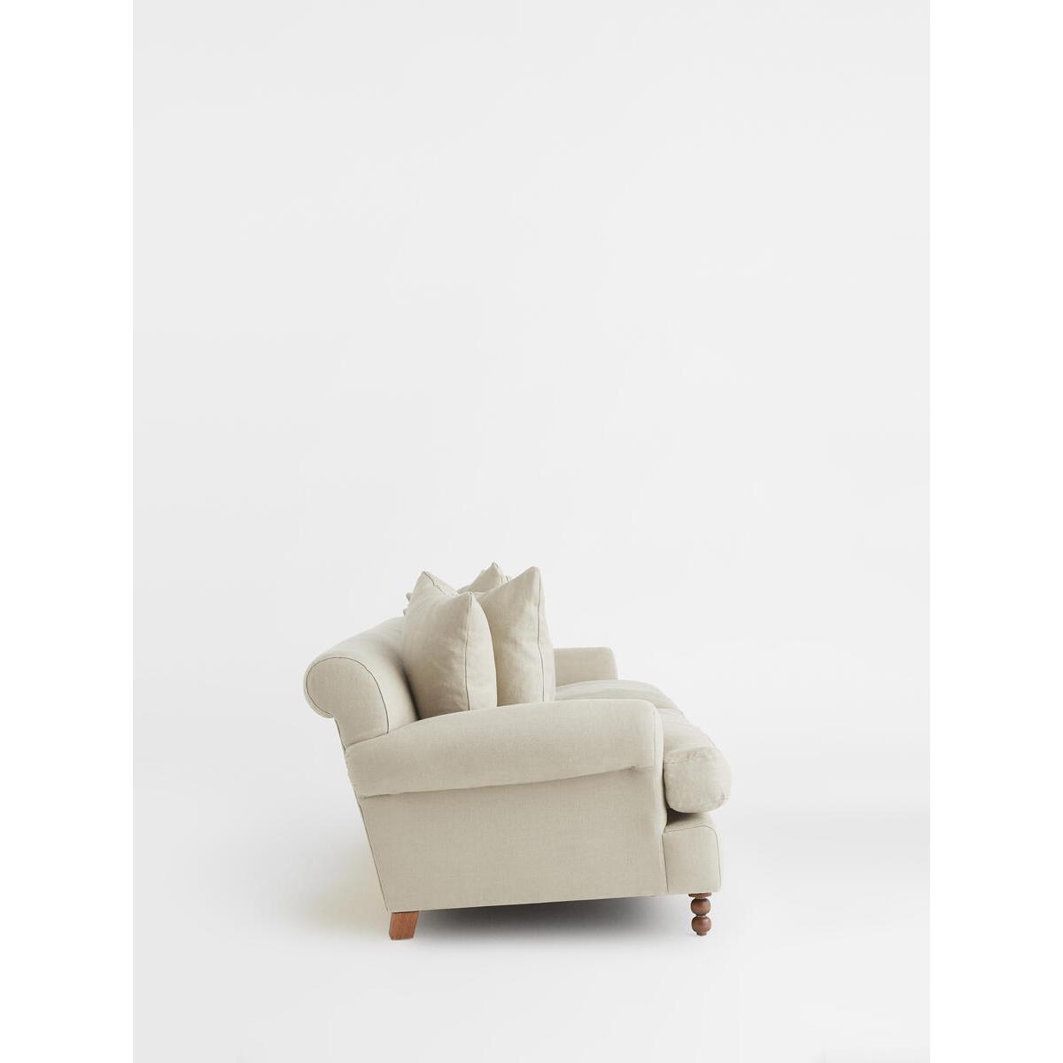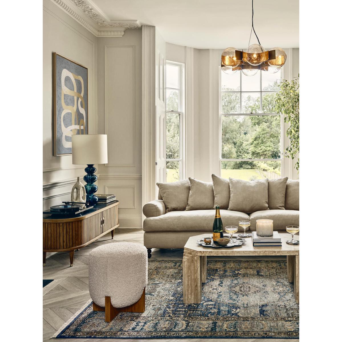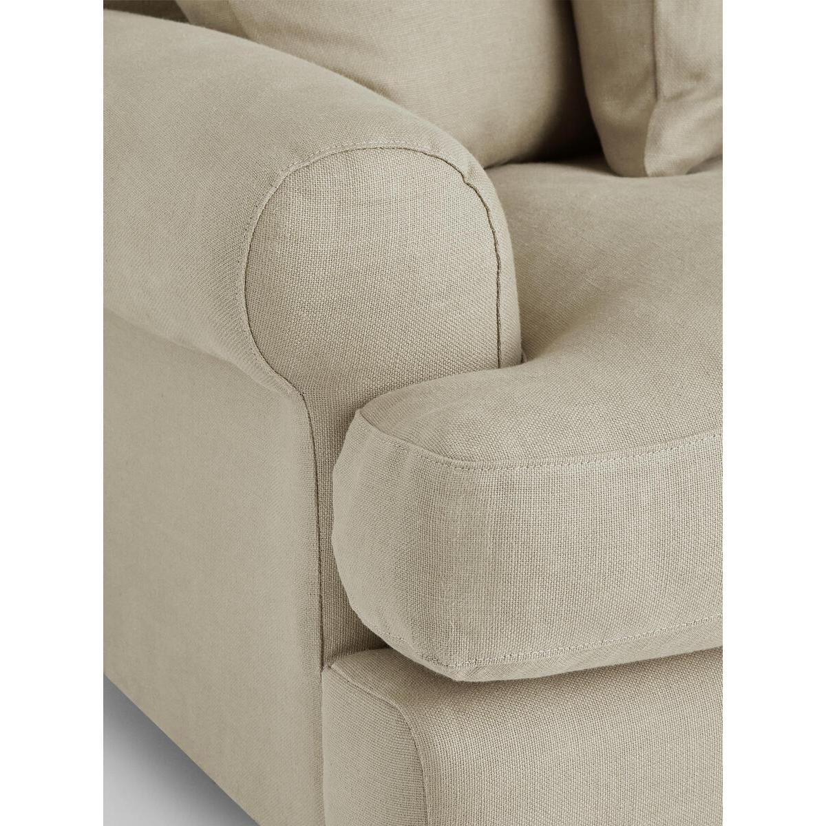 I love this sofa for its versatile, neutral linen fabric that brings a relaxed yet refined vibe to any living space. It's perfect for both classic and contemporary interiors, working especially well in light-filled, airy rooms like the one pictured. Practical styling tips include layering it with textured cushions and throws in subtle colours or soft patterns to add visual interest without overwhelming the space. Pairing it with a rustic wooden or mid-century style coffee table, as shown, creates a welcoming, balanced look. Its understated elegance makes it a great canvas for experimenting with accessories and colour pops in other soft furnishings or artwork.