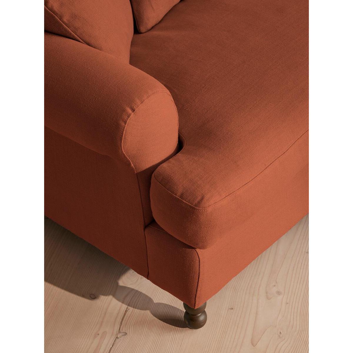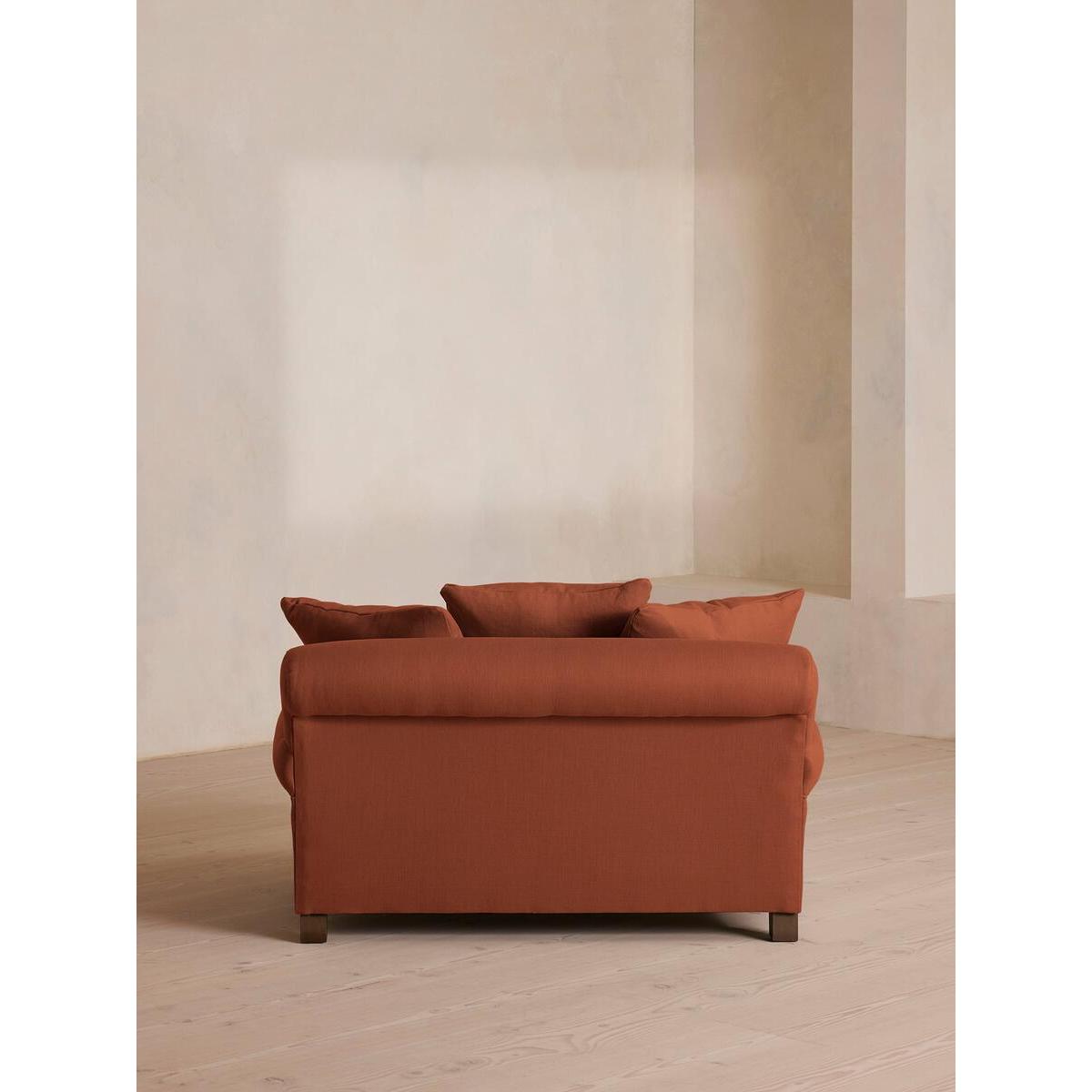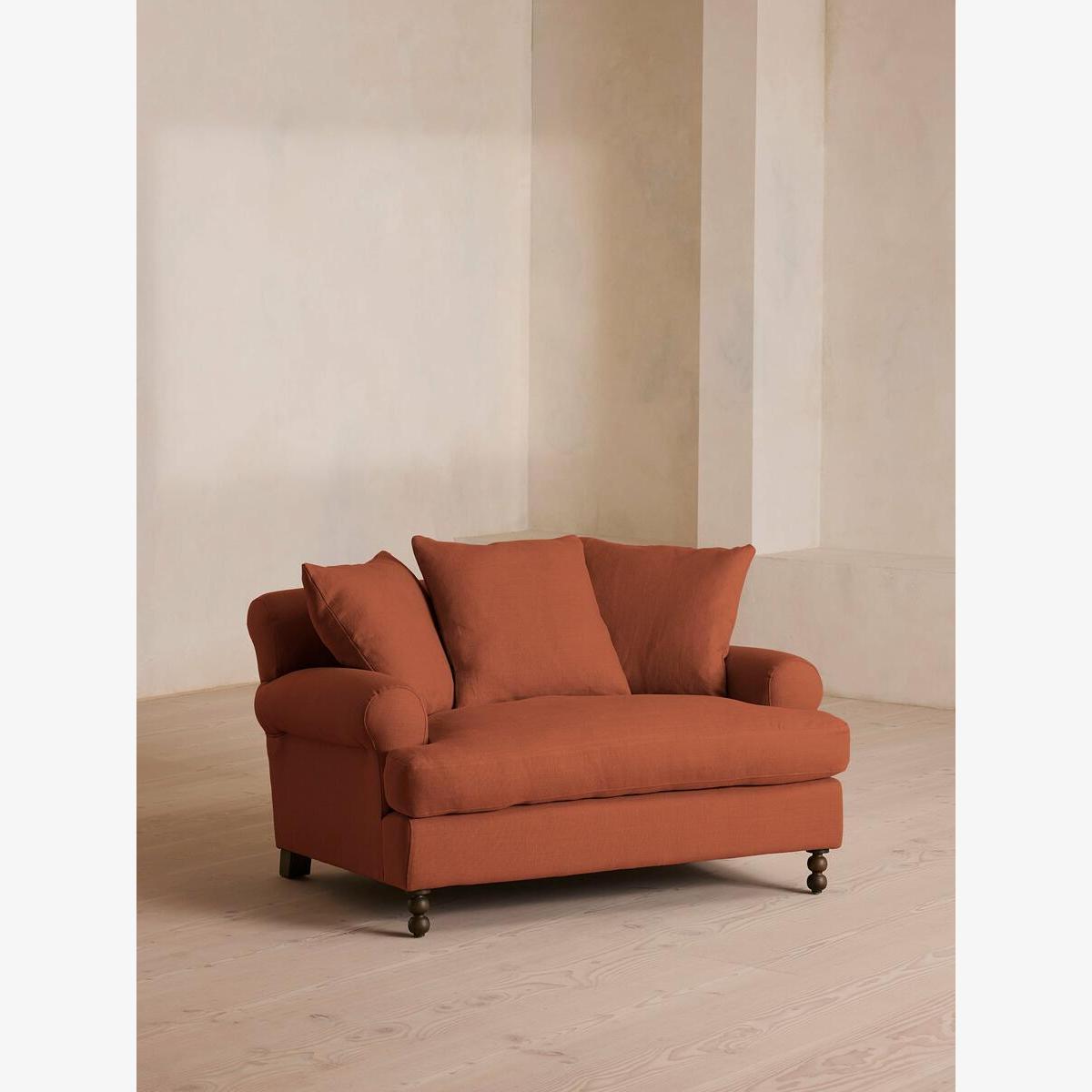 The Audrey loveseat is our take on a classic English scroll arm, where traditional tapered arms are combined with a relaxed pitch and deep sit. Handmade in the UK by skilled craftsmen, it's upholstered in natural linen with oversized feather-wrapped cushions echoing the homely interiors of Babington House in Somerset. Add to your living room or seating area to bring a taste of our countryside retreat into your own home. Upholstered loveseat 100% linen upholstery Available in other colours and fabrics Handcrafted in the UK Engineered hardwood frame Tapered scroll arms Relaxed pitch with deep sit Oversized scatter cushions Feather-wrapped foam cushions, fully reversible Solid wood bobbin legs Inspired by Babington House