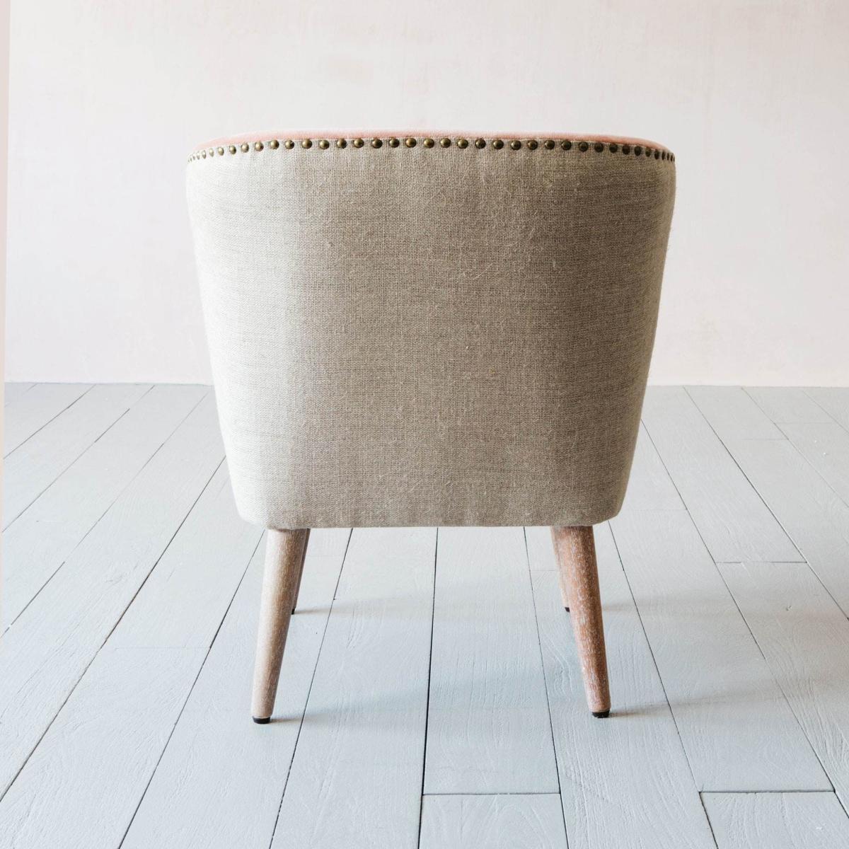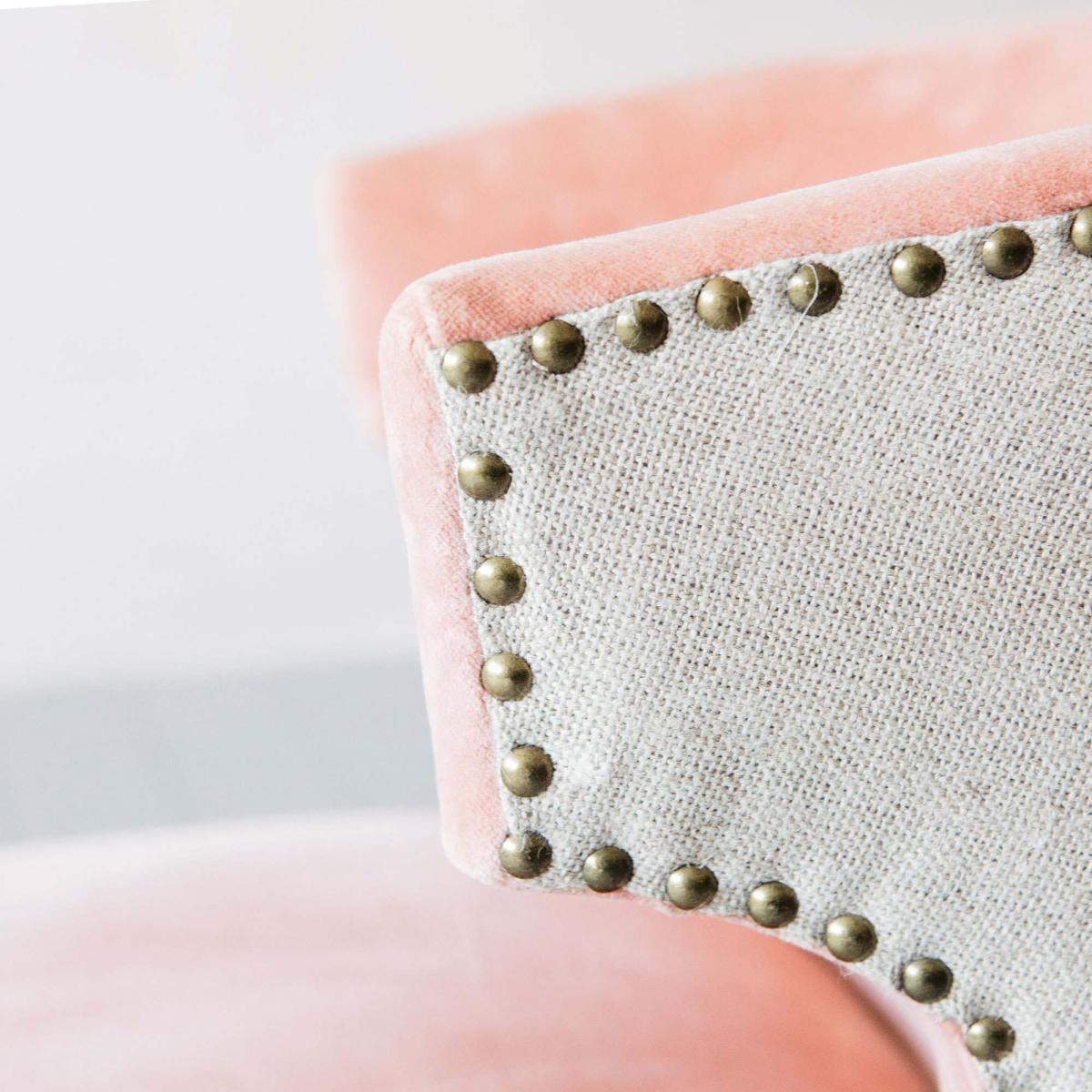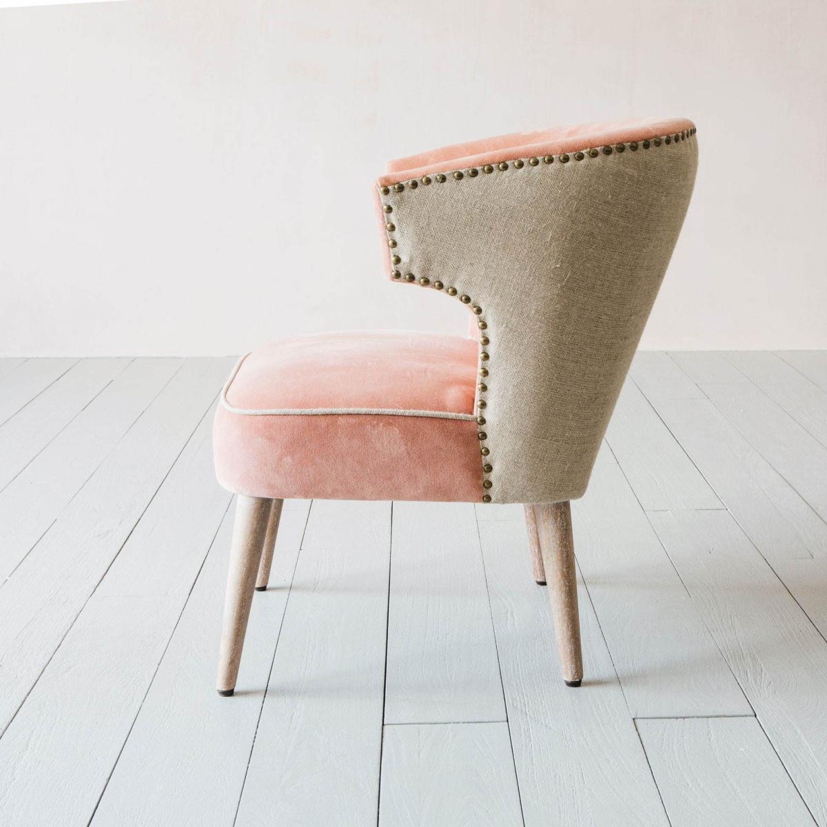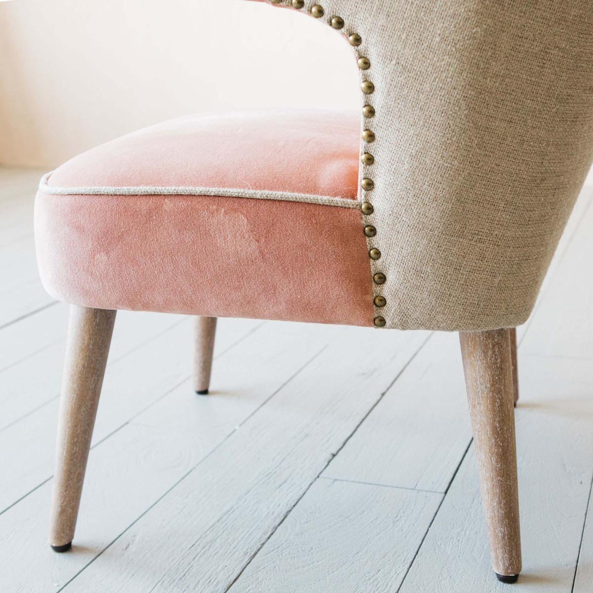 A twist on 50's cocktail chairs, our Audrey chair is upholstered in soft pink velvet with a natural linen back and brass stud detailing. Finished with classic tapered legs crafted from sustainable mango wood.