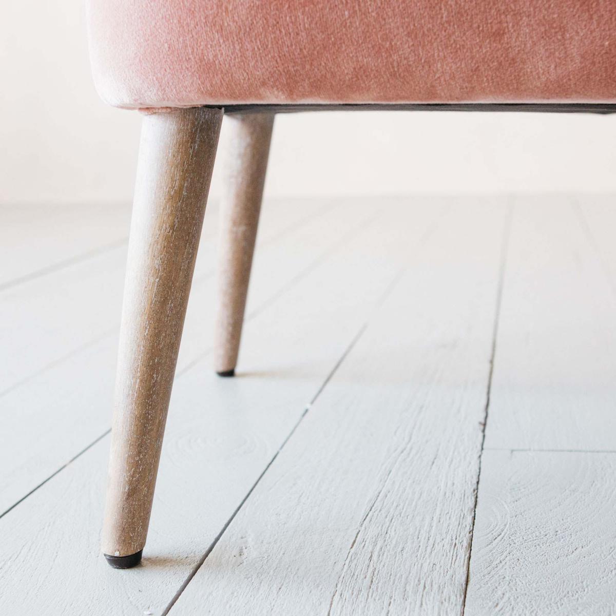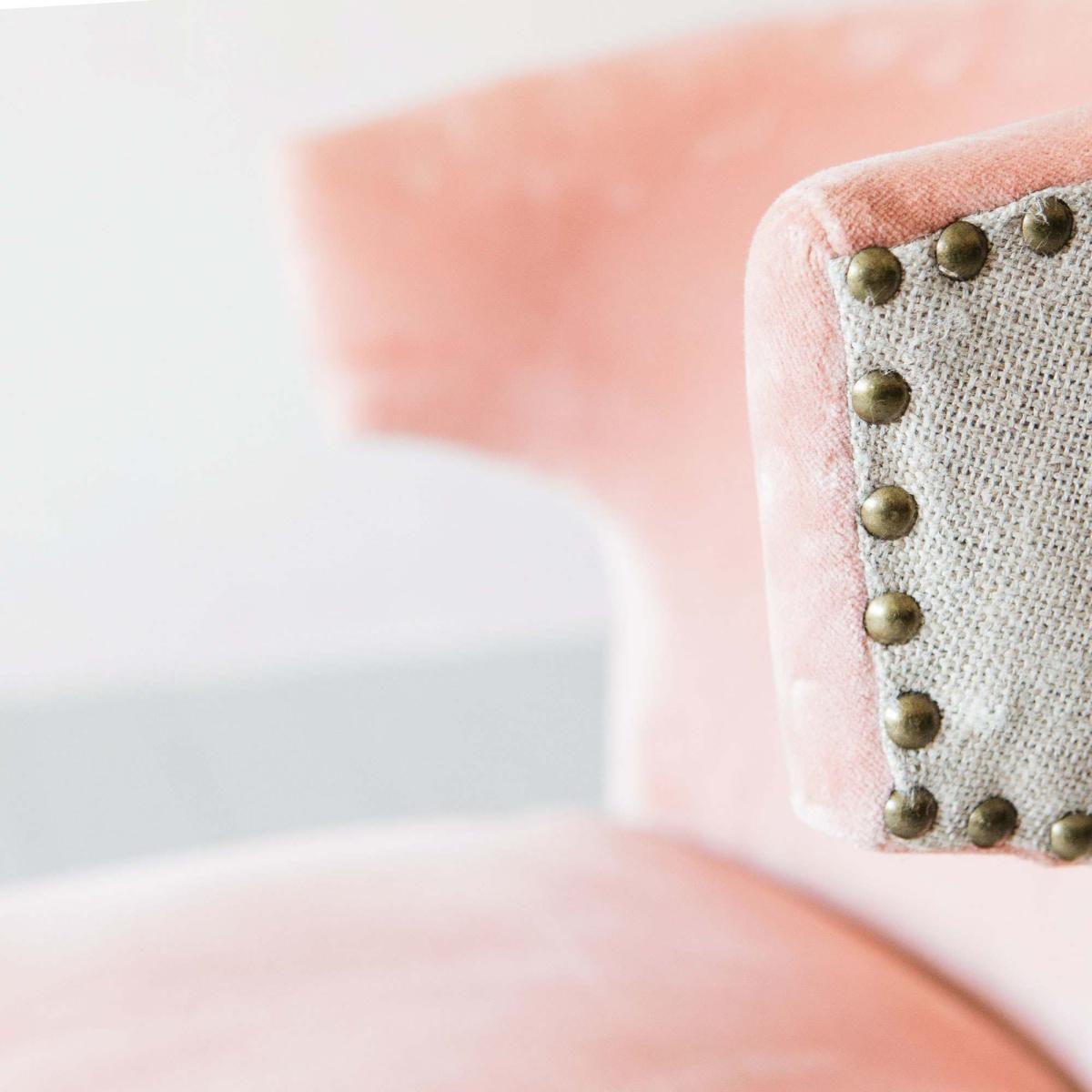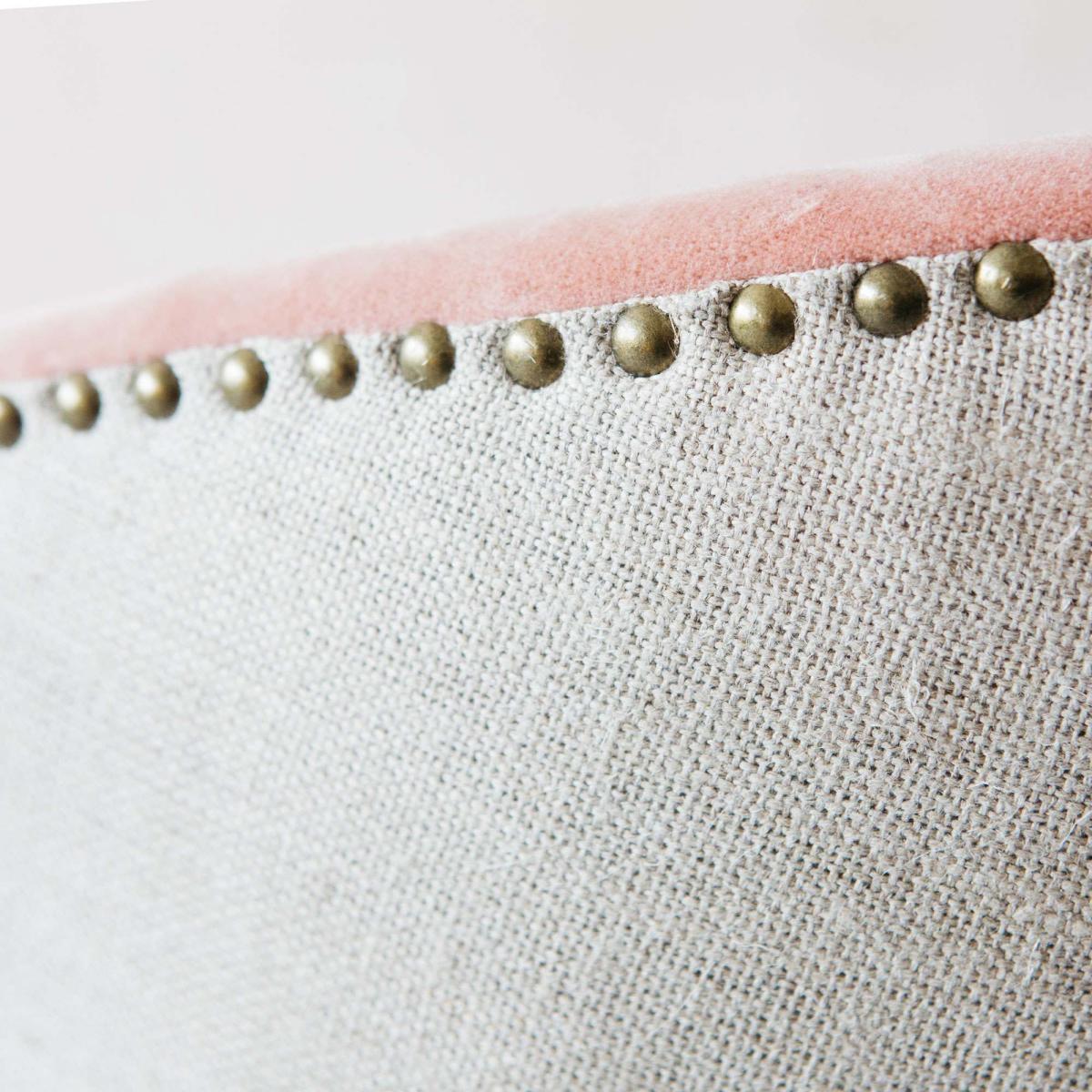 A twist on 50's cocktail chairs, our Audrey chair is upholstered in soft pink velvet with a natural linen back and brass stud detailing. Finished with classic tapered legs crafted from sustainable mango wood.