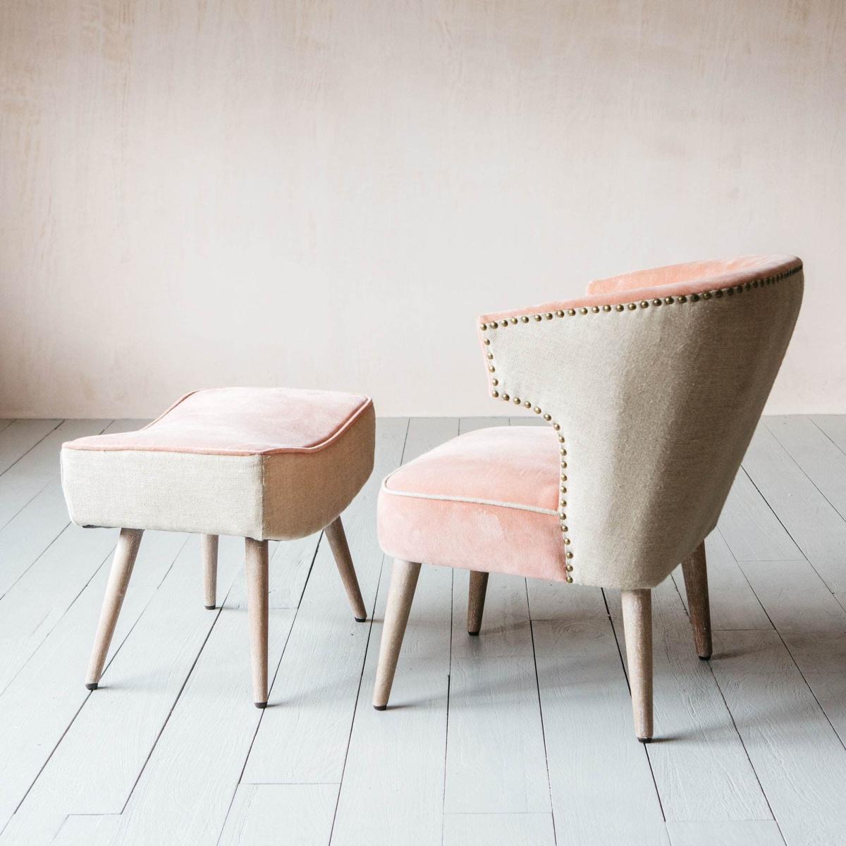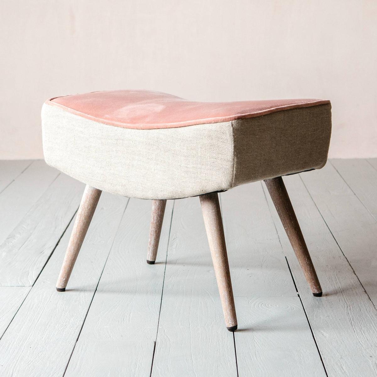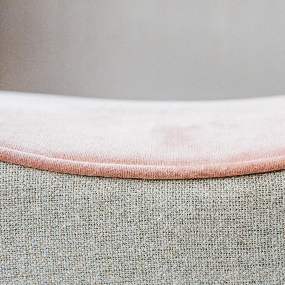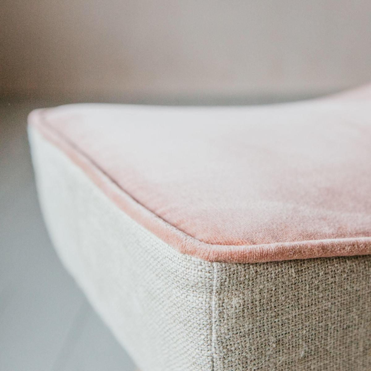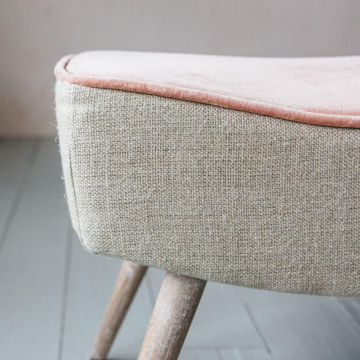 With a subtle curved shaped, our Audrey stool is upholstered in soft pink velvet and natural linen, with brass stud detailing and tapered mango wood legs.