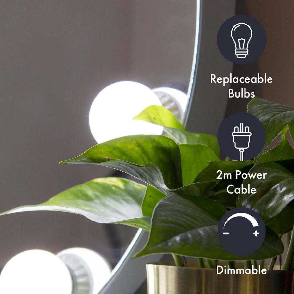 Audrey's large round frameless mirror is a real head-turner and makes the piece feel unique and opulent. 10 long-lasting LED globe bulbs radiate even illumination and can be brightened or dimmed at the twist of a dial. The Audrey Hollywood light-up mirror plugs quickly and easily into the wall and boasts a smart memory function to remember your last light settings on the next use.