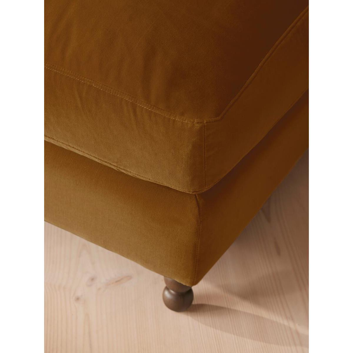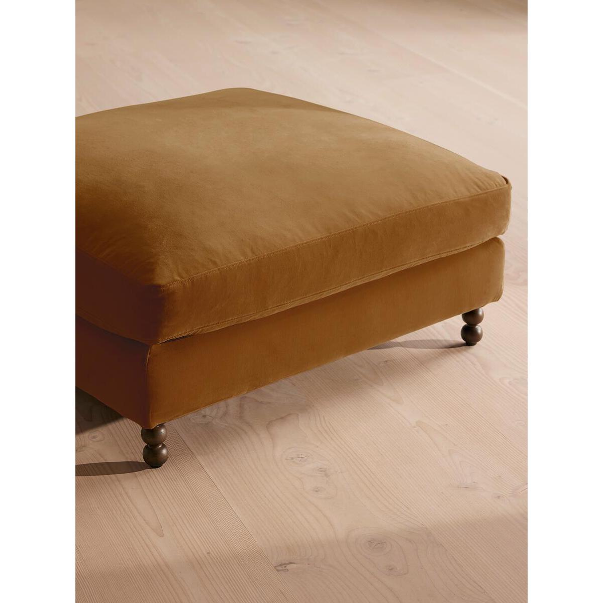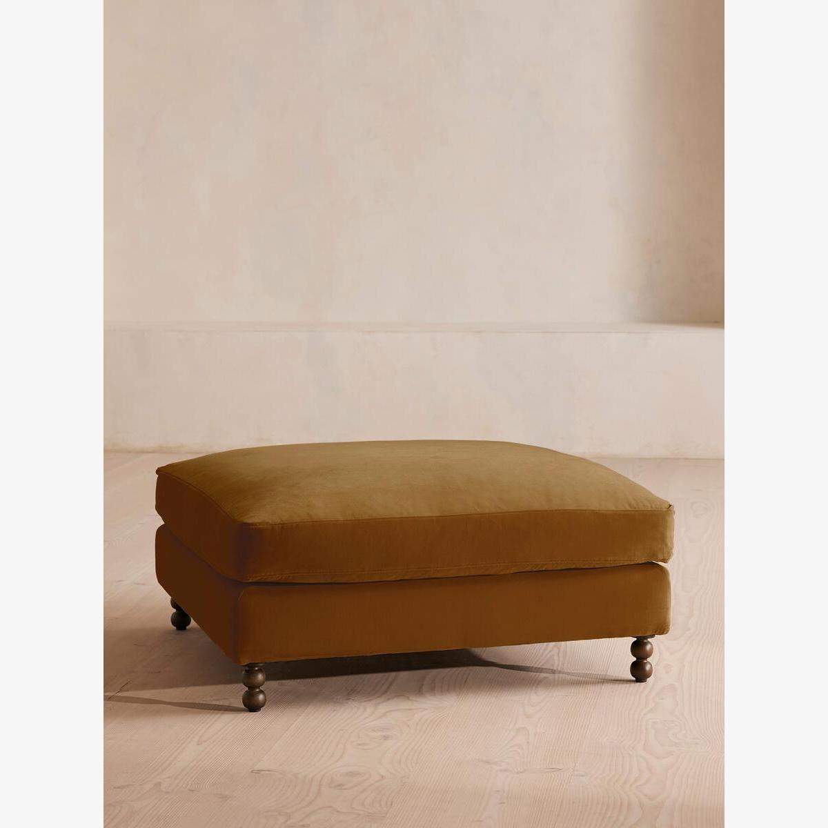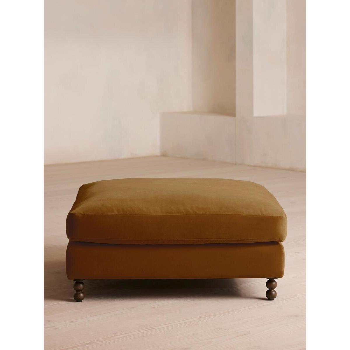 Inspired by the comfy, vintage interiors of Babington House in Somerset, our Audrey square ottoman has been handcrafted in the UK with rich velvet upholstery and a feather-wrapped foam seat cushion. Resting on solid wood bobbin legs, pair it with the Audrey loveseat and sofa for a coordinated living room scheme. Square ottoman Upholstered in cotton velvet Available in other colours and fabrics Engineered hardwood frame Handcrafted in the UK Feather-wrapped foam cushion Solid wood bobbin legs Inspired by Babington House