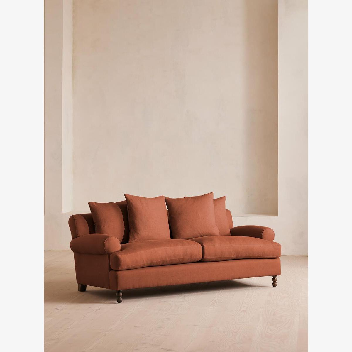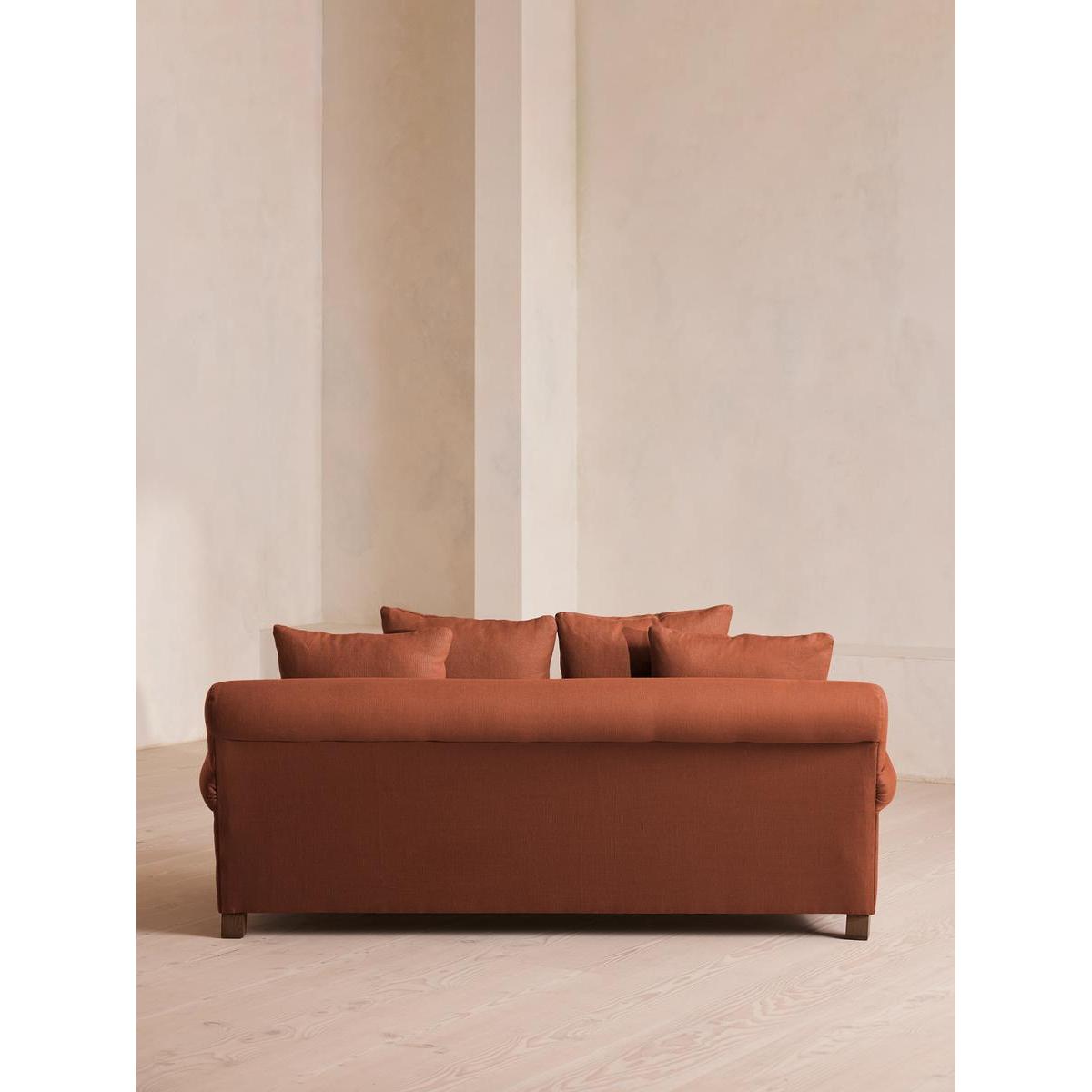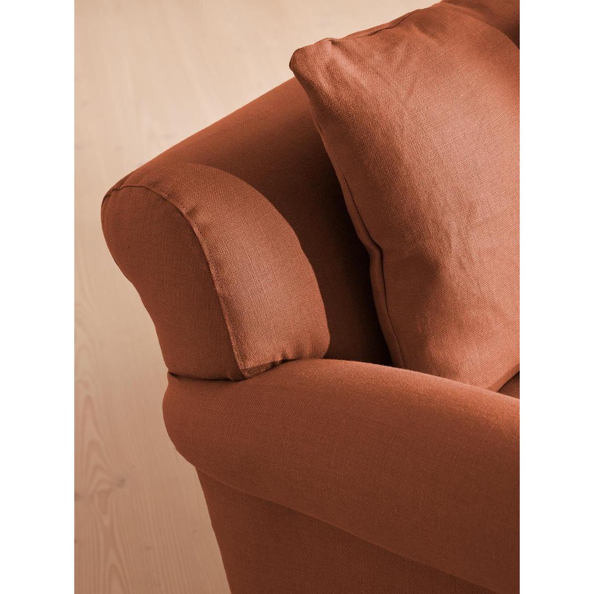 The Audrey sofa is our take on a classic English scroll arm, where traditional tapered arms are combined with a relaxed pitch and deep sit. Handmade in the UK by skilled craftsmen, natural linen upholstery is complemented with oversized feather-wrapped cushions, echoing the homely interiors of Babington House in Somerset. Add to your living room or seating area to bring a taste of our countryside retreat into your own home.
