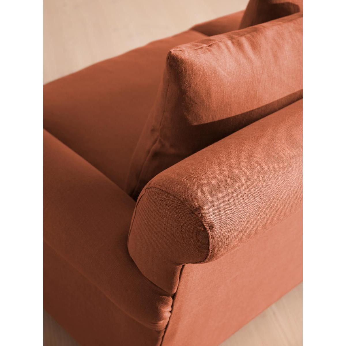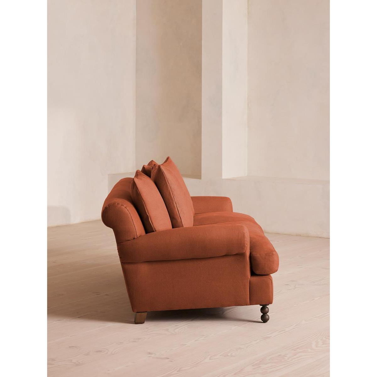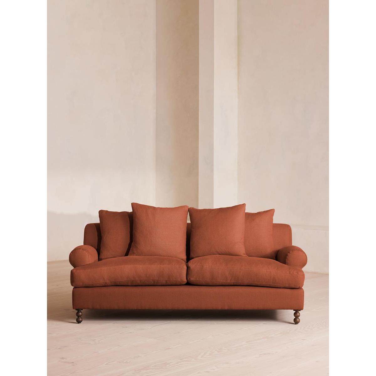 The Audrey sofa is our take on a classic English scroll arm, where traditional tapered arms are combined with a relaxed pitch and deep sit. Handmade in the UK by skilled craftsmen, natural linen upholstery is complemented with oversized feather-wrapped cushions, echoing the homely interiors of Babington House in Somerset. Add to your living room or seating area to bring a taste of our countryside retreat into your own home.