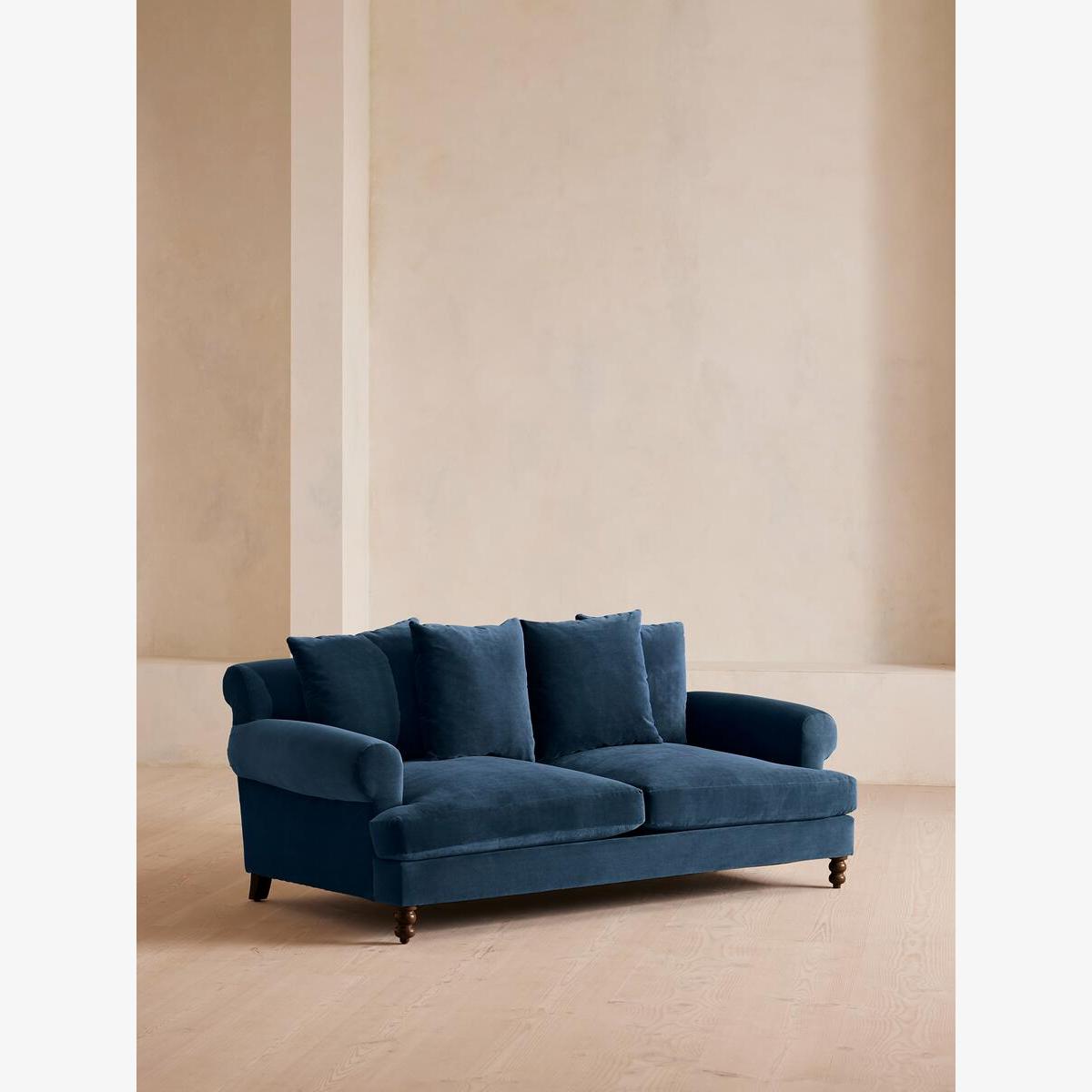 The Audrey sofa is our take on a classic English scroll arm, where traditional tapered arms are combined with a relaxed pitch and deep sit. Handmade in the UK by skilled craftsmen, velvet upholstery is complemented with oversized feather-wrapped cushions, echoing the homely interiors of Babington House in Somerset. Add to your living room or seating area to bring a taste of our countryside retreat into your own home. Two-seater sofa Upholstered in cotton velvet Available in other colours and fabrics Engineered hardwood frame Handcrafted in the UK Tapered scroll arms Relaxed pitch with deep sit Oversized scatter cushions Feather-wrapped foam cushions, fully reversible Solid wood bobbin legs Inspired by Babington House