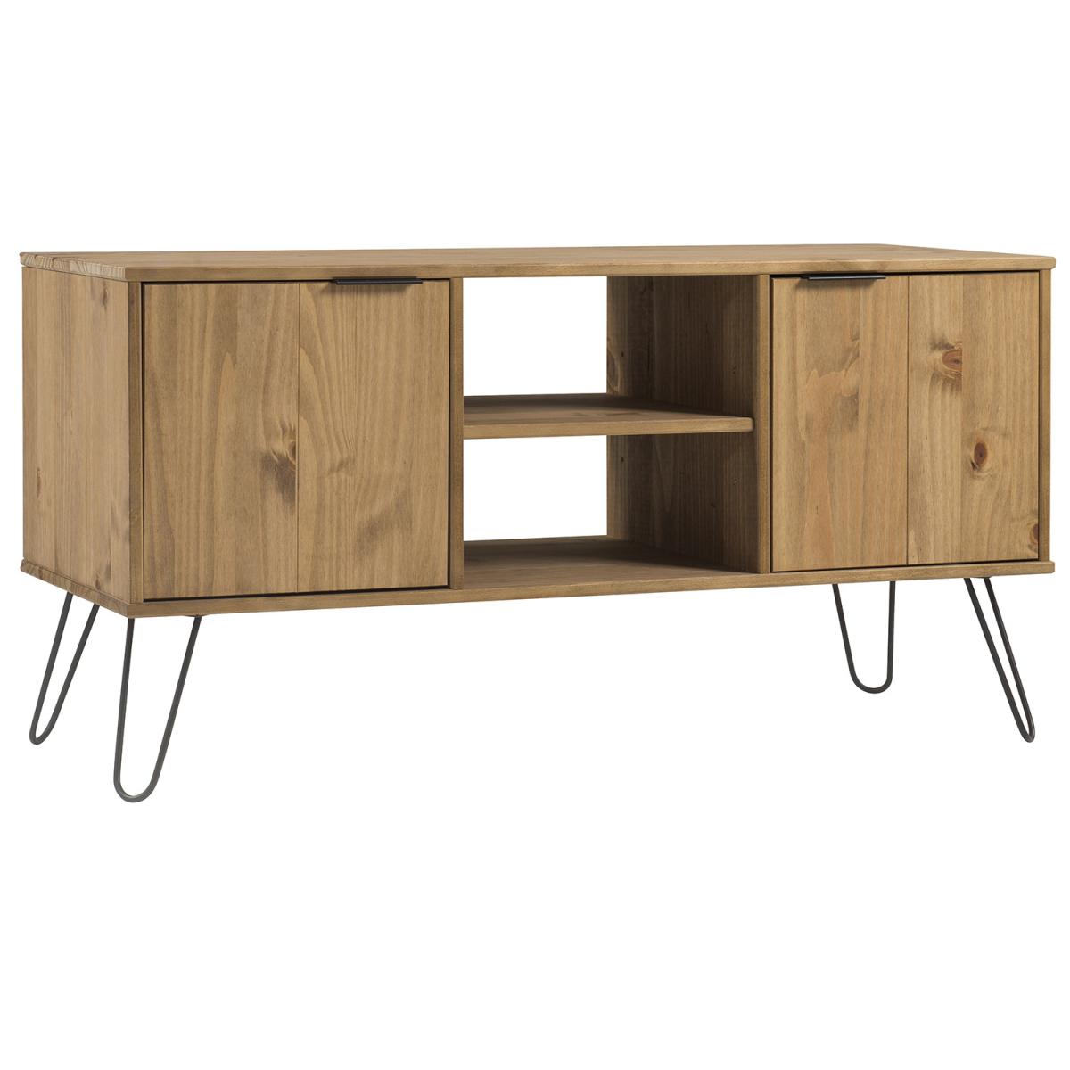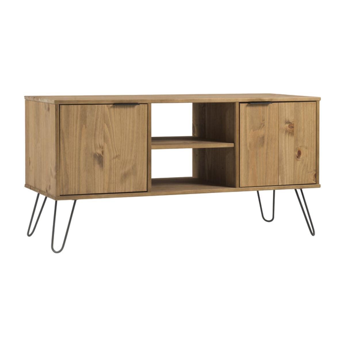 Good sized flat screen TV unit with plenty of space for your accessories, games console and digital TV box. Contemporary clean line design blends seamlessly with the metal hair pin legs to bring you a casual style that suits most modern interiors. Constructed from pine wood with black metal legs and grip handles. Each piece has unique characteristics in the wood such as knots, variances in shading and graining. These are part of the natural character of the Augusta furniture range. Mix with other pieces from the Augusta contemporary pine furniture range.