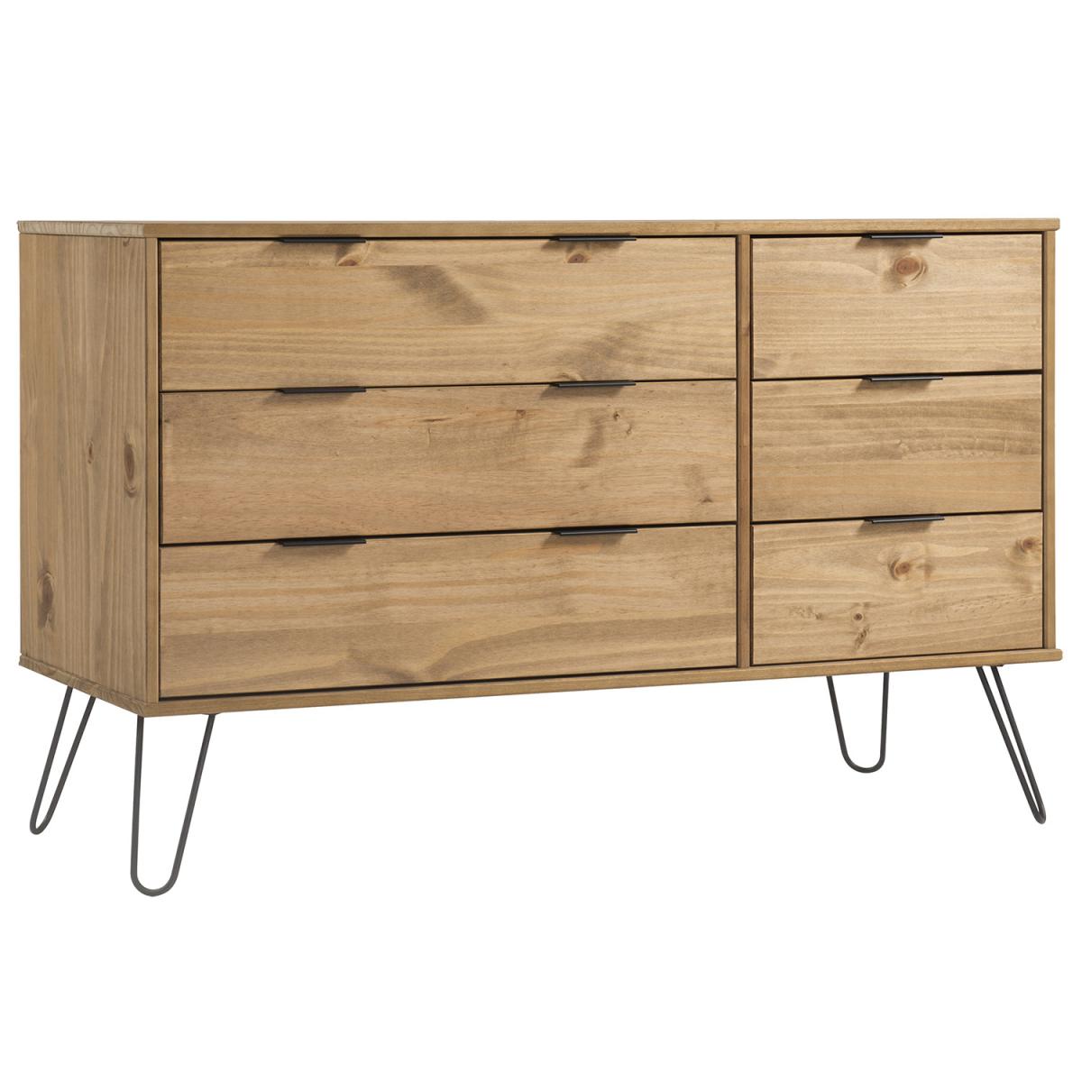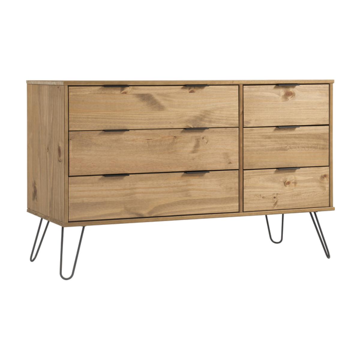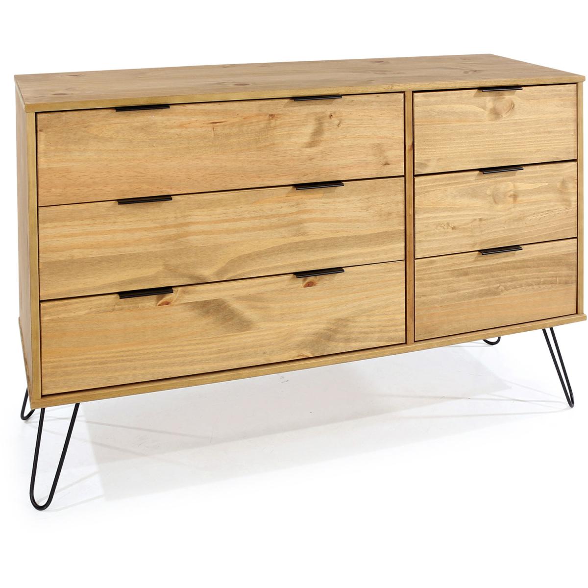Three small drawers next to three wide drawers are perfect for getting all your folded clothes and accessories organised. Contemporary clean line design blends seamlessly with the metal hair pin legs and grip handles to bring you a casual style that suits most modern interiors. Constructed from solid wood and MDF. Black metal legs and metal effect handles. Each piece has unique characteristics in the wood such as knots, variances in shading and graining. These are part of the natural character of the Augusta furniture range. Mix with other pieces from the Augusta contemporary pine furniture range.