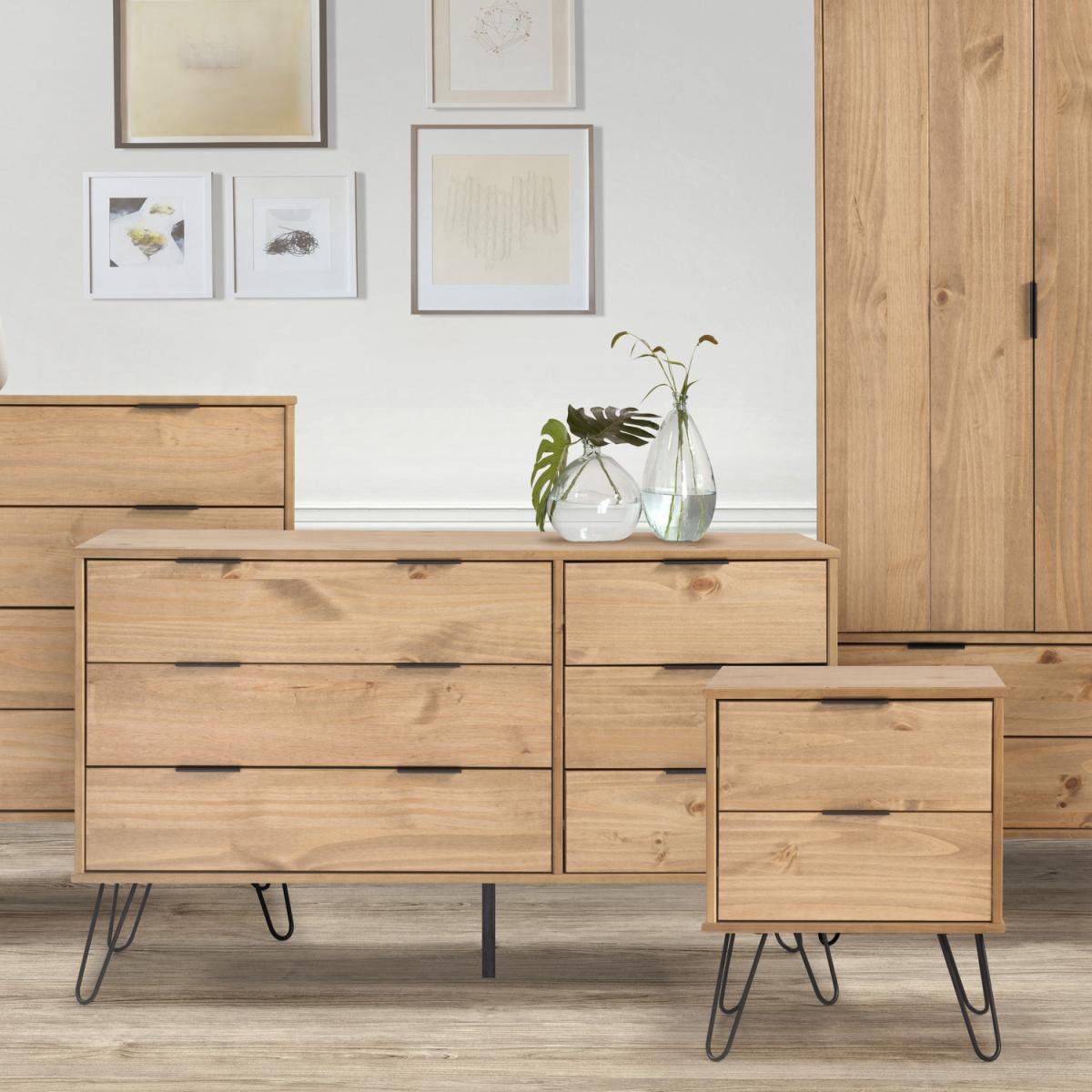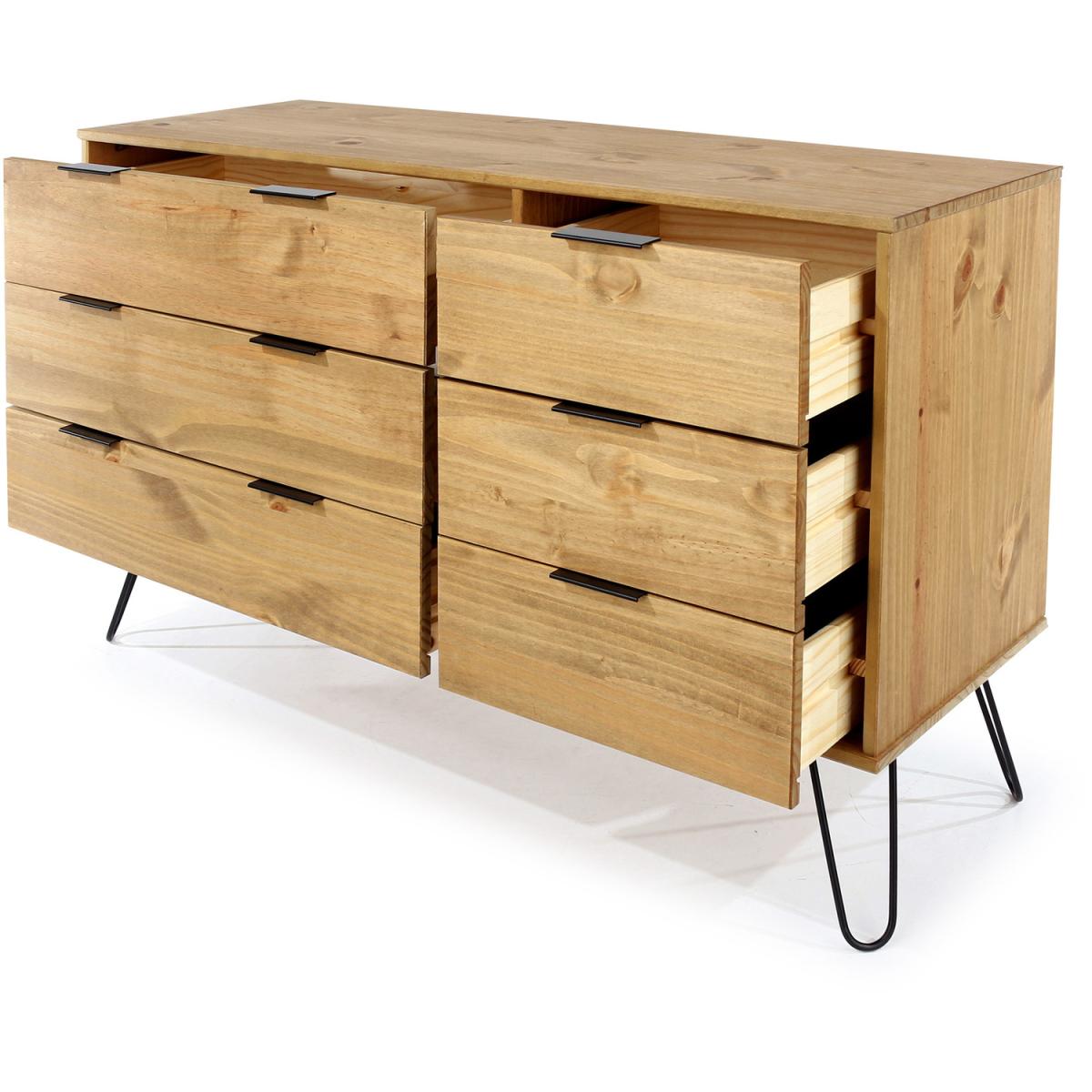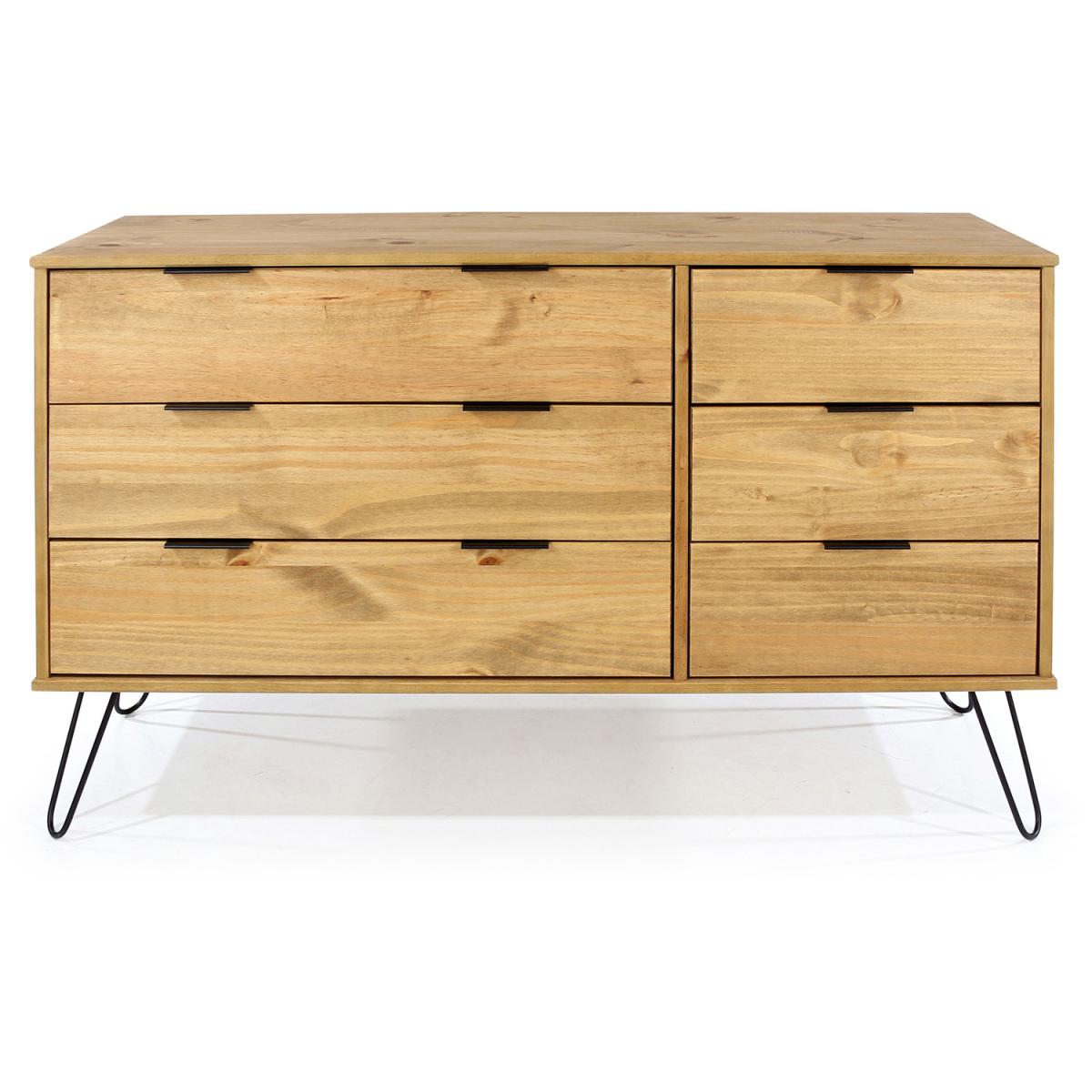 Three small drawers next to three wide drawers are perfect for getting all your folded clothes and accessories organised. Contemporary clean line design blends seamlessly with the metal hair pin legs and grip handles to bring you a casual style that suits most modern interiors. Constructed from solid wood and MDF. Black metal legs and metal effect handles. Each piece has unique characteristics in the wood such as knots, variances in shading and graining. These are part of the natural character of the Augusta furniture range. Mix with other pieces from the Augusta contemporary pine furniture range.