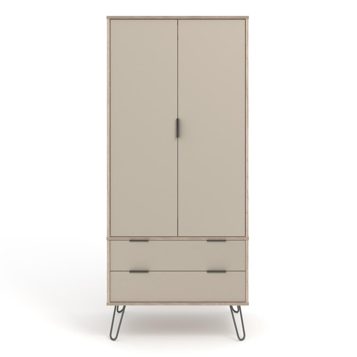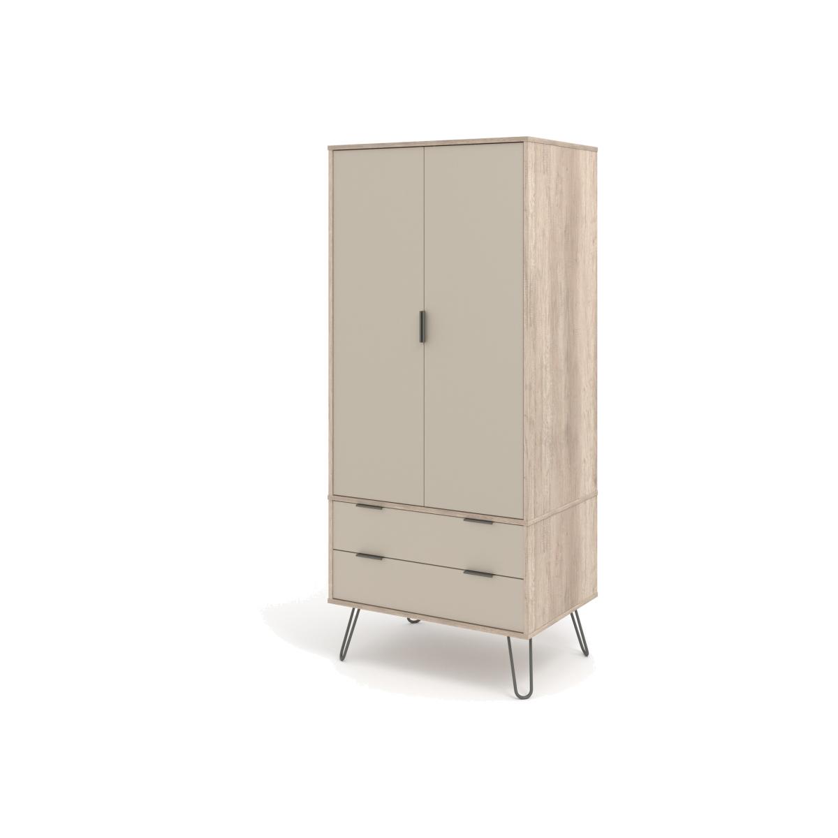 Stunning Driftwood and Calico effect casual living collection. Contemporary clean lines have been blended with hairpin legs to create a modern industrial styled range. Constructed from hardwearing melamine coated manufactured boards in a driftwood effect and softened by the complimenting calico effect drawer and drawer fronts. Gunmetal grey real metal legs and profiled handles complete the look. Mix with other pieces from the Augusta Driftwood furniture range to create a coordinated living style. This Augusta Driftwood wardrobe is perfect for smaller bedrooms. The combination of the hanging area above and the two drawers in the base help you to maximise the use of space.
