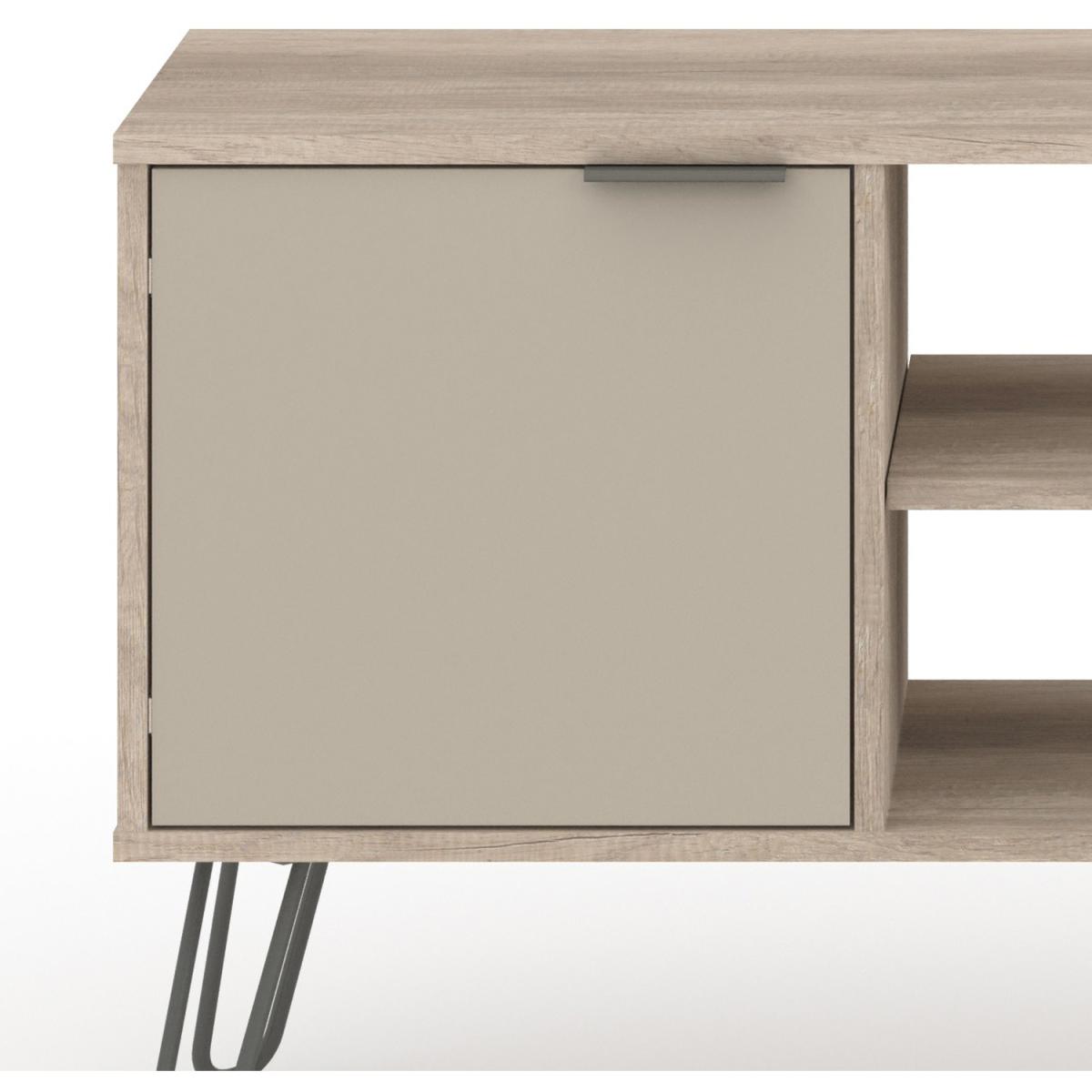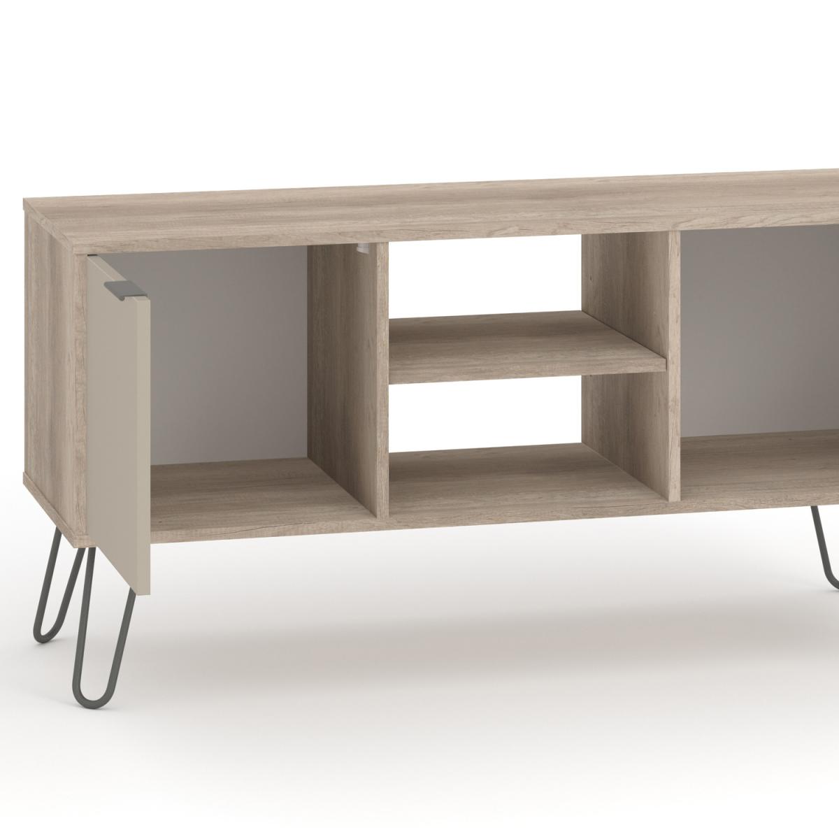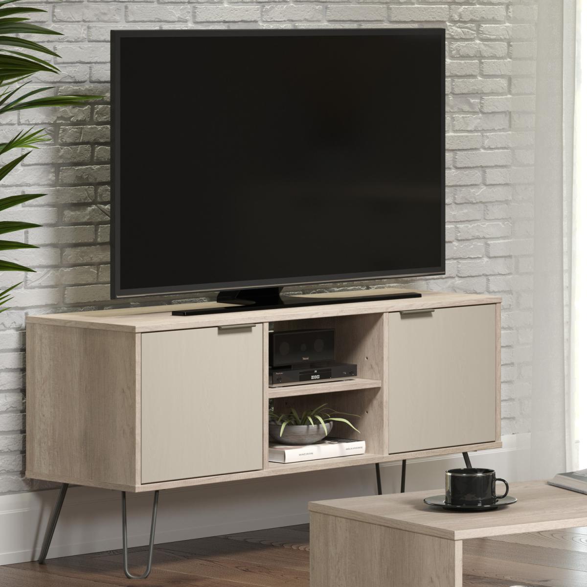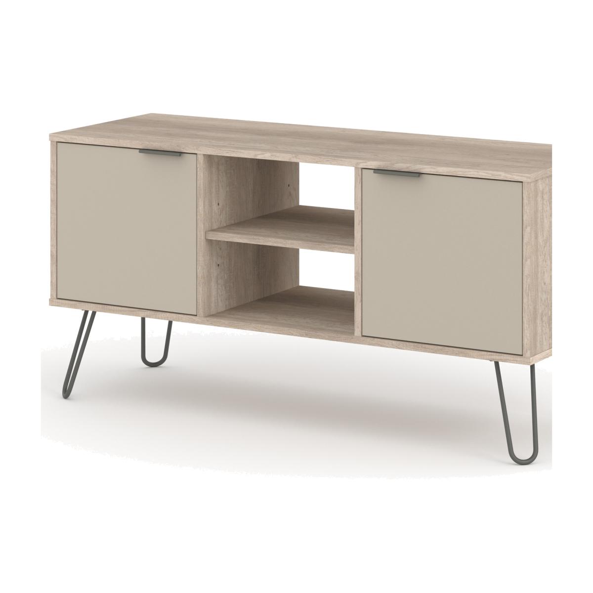 Stunning Driftwood and Calico effect casual living collection. Contemporary clean lines have been blended with hairpin legs to create a modern industrial styled range. Constructed from hardwearing melamine coated manufactured boards in a driftwood effect and softened by the complimenting calico effect drawer and drawer fronts. Gunmetal grey real metal legs and profiled handles complete the look. Mix with other pieces from the Augusta Driftwood furniture range to create a coordinated living style. Good sized flat-screen TV unit with plenty of open space for your accessories, games console and digital TV box, plus a cupboard at either end.