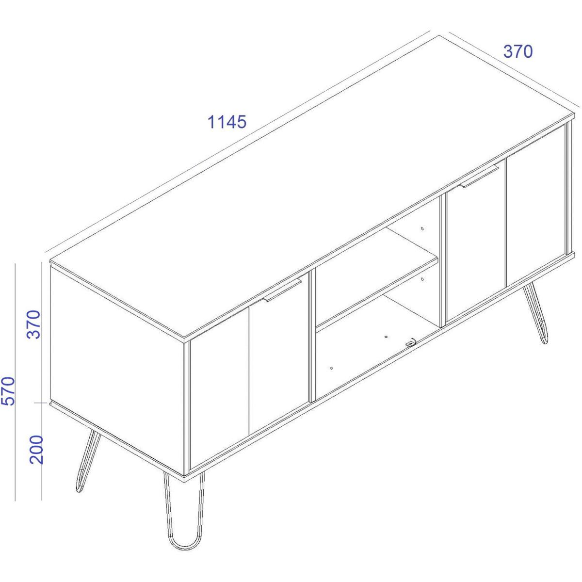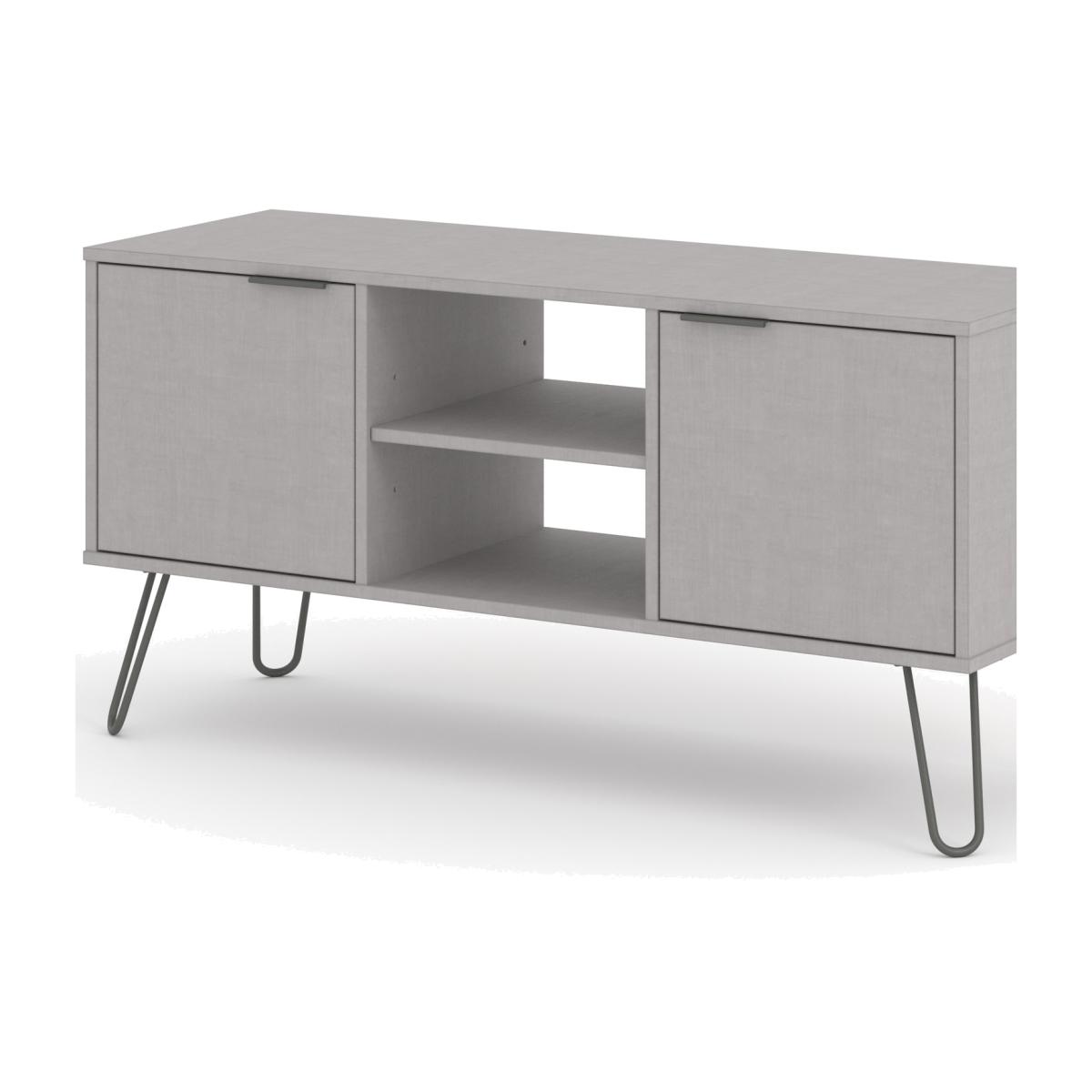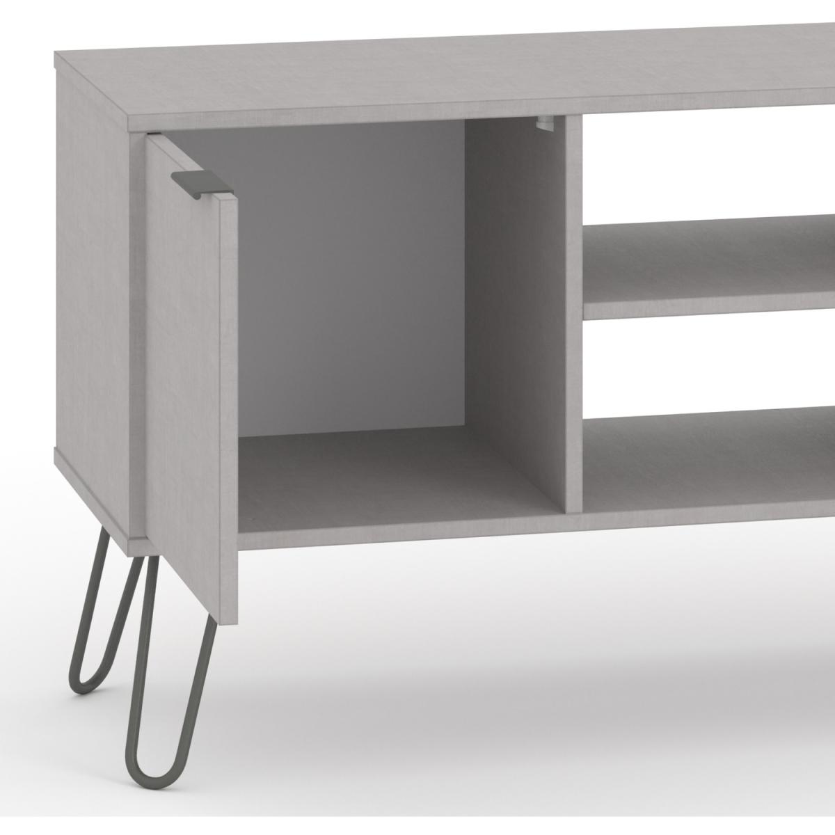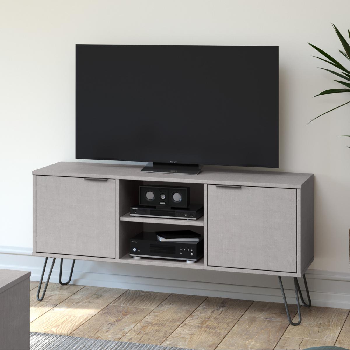 Contemporary clean lines have been blended with hairpin legs to create a modern industrial styled range. Constructed from hardwearing melamine coated manufactured boards. Gunmetal grey real metal legs and profiled handles complete the look. Each piece features a grained effect easy to clean finish. Mix with other pieces from the Augusta Grey furniture range to create a coordinated living style. Good sized flat-screen TV unit with plenty of open space for your accessories, games console and digital TV box, plus two useful cupboards one at either end for more storage.