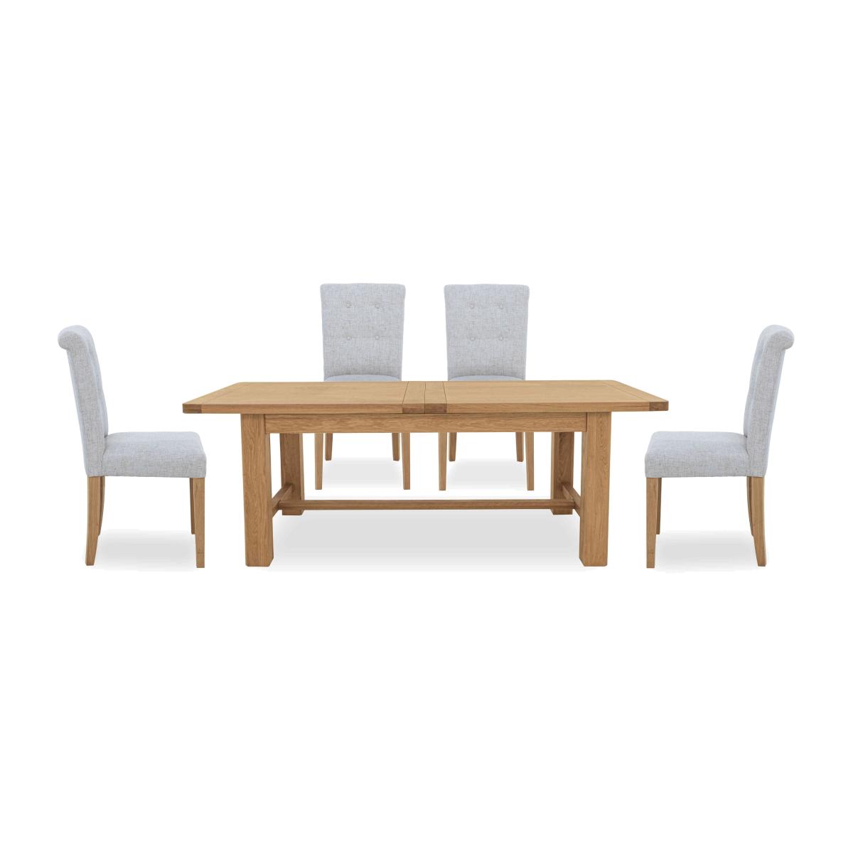 Characterful oak furniture at a great value-price? We’re here for it. Our Augusta range of dining room and living room is beautifully crafted in solid oak and oak veneer and offers an extensive choice of pieces for living rooms and dining rooms. So versatile, Augusta is a perfect fit for modern country homes and just as pleasing in classic interiors. With three styles of extending dining table and five styles of dining chair, it’s easy to create a dining set that’s clean-lined and classic – or one that’s contemporary and eclectic. The Augusta collection is exclusively available at Furniture Village. Elegant and comfortable, this beautiful dining set comprises a large oak and oak veneer extending dining table and a set of four roll back upholstered dining chairs. Why you'll love it You’ll feel at home with oak furniture from our Augusta range. Characterful modern country style at a great price. The extending dining table is beautifully crafted in oak and oak veneer. A clear lacquer finish protects and enhances the wood. Understated design with clean lines and sturdy square legs. Extends to seat 10 with an extra leaf that’s hidden within the table. Dining set includes 4 roll back upholstered dining chairs. Traditional in style and comfortably cushioned. In a choice of colours for the fabric upholstery. Perfect for everyday dining and family gatherings. Exclusively available at Furniture Village. This dining set is part of the Augusta range. What you need to know Dining chairs are made from oak. Cushioned with foam. Table is made from oak and oak veneer. 220 cm dining table seats 8 closed and extends to 280 cm to seat 10. No two pieces of wood or veneer are the same. Variations in colour will occur. Avoid placing in direct sunlight or close to a heat source. We recommend using coasters and placemats at all times. Wipe clean with a damp cloth and then dry using a soft duster. Do not use silicon-based furniture polish or abrasive cleaners. Shop the Augusta range for a huge choice of living and dining room furniture.