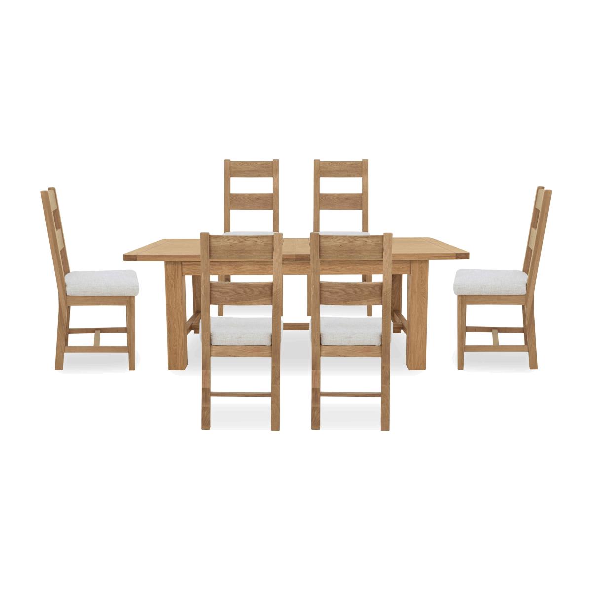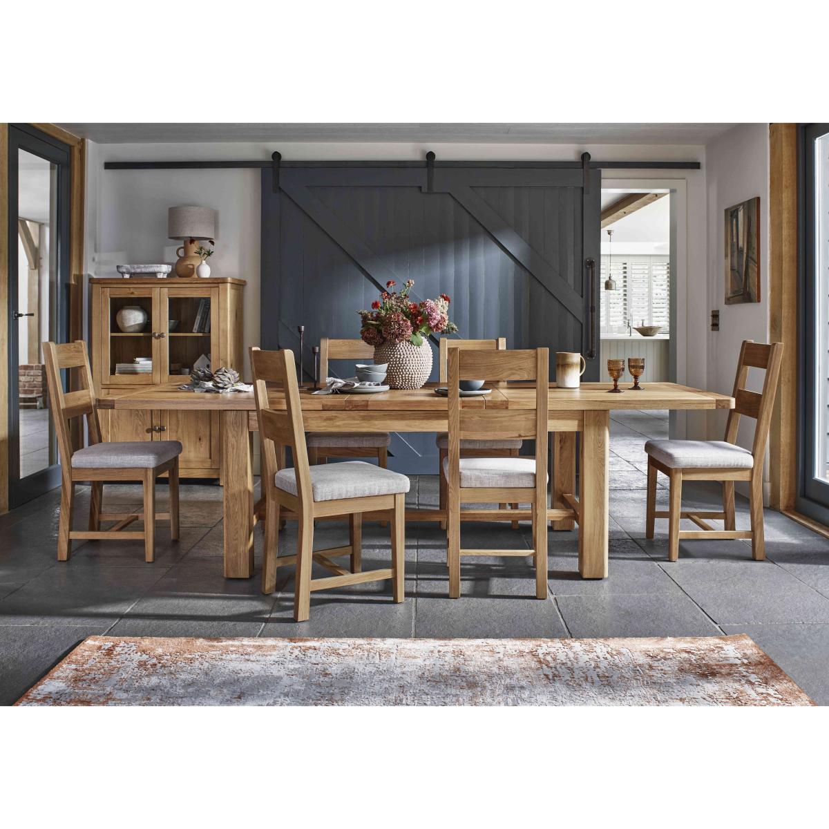 Characterful oak furniture at a great value-price? We’re here for it. Our Augusta range of dining room and living room is beautifully crafted in solid oak and oak veneer and offers an extensive choice of pieces for living rooms and dining rooms. So versatile, Augusta is a perfect fit for modern country homes and just as pleasing in classic interiors. With three styles of extending dining table and five styles of dining chair, it’s easy to create a dining set that’s clean-lined and classic – or one that’s contemporary and eclectic. The Augusta collection is exclusively available at Furniture Village. Gather friends and family with this large extending dining table and set of six ladderback chairs. Crafted with oak, the look is elegant and timeless. Why you'll love it You’ll feel at home with oak furniture from our Augusta range. Characterful modern country style at a great price. The extending dining table is beautifully crafted in oak and oak veneer. A clear lacquer finish protects and enhances the wood. Understated design with clean lines and sturdy square legs. Extends to seat 10 with an extra leaf that’s hidden within the table. Dining set includes 6 ladderback dining chairs. Chairs are made of solid oak with a clear lacquer finish. Cushioned seats are upholstered in a neutral clay colour. Perfect for everyday dining and family gatherings. Exclusively available at Furniture Village. This dining set is part of the Augusta range. What you need to know Dining chairs are made from oak. Cushioned with foam. Table is made from oak and oak veneer. 220 cm dining table seats 8 closed and extends to 280 cm to seat 10. No two pieces of wood or veneer are the same. Variations in colour will occur. Avoid placing in direct sunlight or close to a heat source. We recommend using coasters and placemats at all times. Wipe clean with a damp cloth and then dry using a soft duster. Do not use silicon-based furniture polish or abrasive cleaners. Shop the Augusta range for a huge choice of living and dining room furniture.