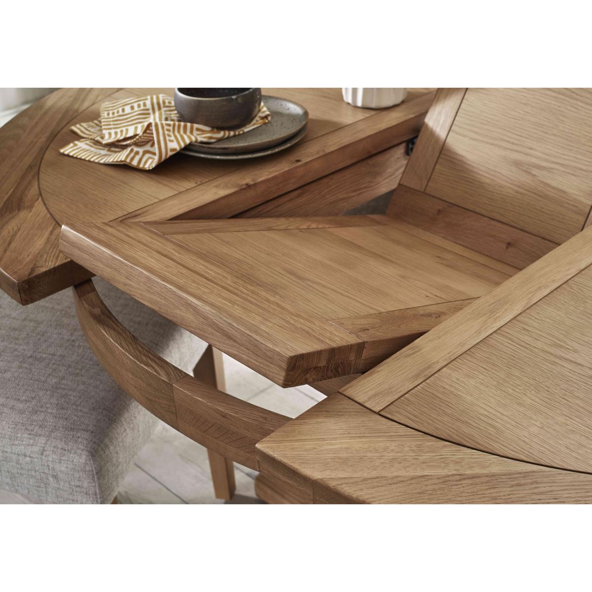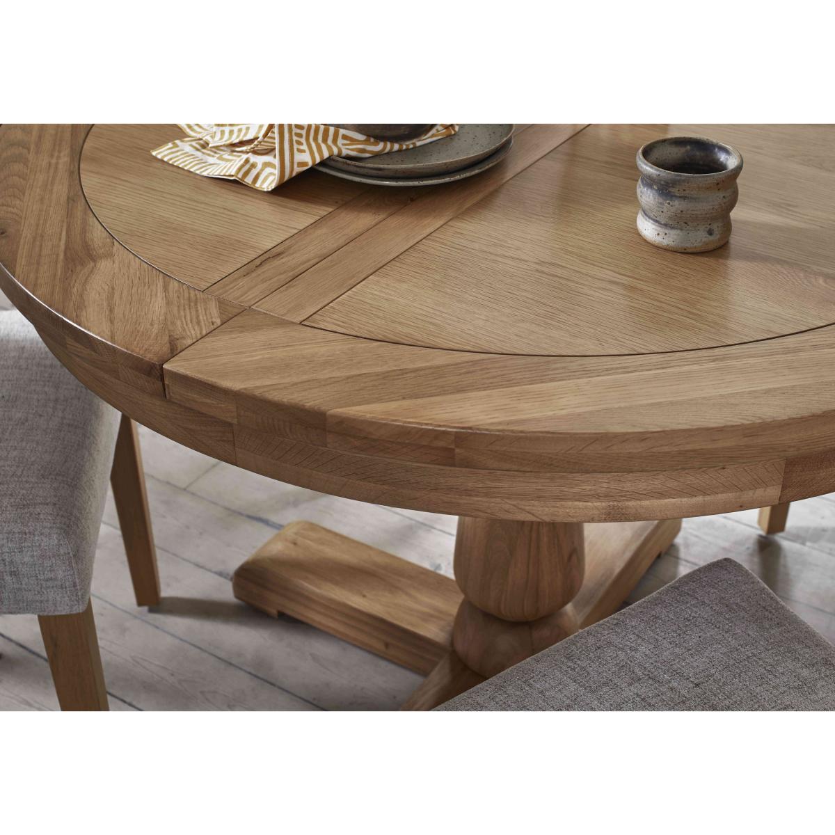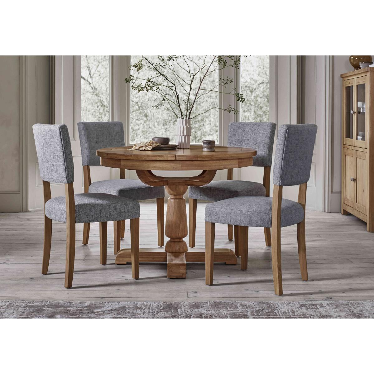 Characterful oak furniture at a great value-price? We’re here for it. Our Augusta range of dining room and living room is beautifully crafted in solid oak and oak veneer and offers an extensive choice of pieces for living rooms and dining rooms. So versatile, Augusta is a perfect fit for modern country homes and just as pleasing in classic interiors. With three styles of extending dining table and five styles of dining chair, it’s easy to create a dining set that’s clean-lined and classic – or one that’s contemporary and eclectic. The Augusta collection is exclusively available at Furniture Village. Classic meets contemporary in this beautiful oak dining set. The round table extends to seat six and the four open back dining chairs are modern and stylish. Why you'll love it You’ll feel at home with oak furniture from our Augusta range. Characterful modern country style at a great price. The circular extending dining table is beautifully crafted in oak and oak veneer. A clear lacquer finish protects and enhances the wood. Understated design with clean lines and pedestal base. Simple butterfly mechanism quickly extends this table to seat 6. Dining set includes 4 open back upholstered dining chairs. Comfortable and contemporary in style with simple buttoning. In a choice of colours for the fabric upholstery. Perfect for everyday dining and family gatherings. Exclusively available at Furniture Village. This dining set is part of the Augusta range. What you need to know Dining chairs are made from oak. Cushioned with foam. Table is made from oak and oak veneer. Seats 4 closed and extends to seat 6. No two pieces of wood or veneer are the same. Variations in colour will occur. Avoid placing in direct sunlight or close to a heat source. We recommend using coasters and placemats at all times. Wipe clean with a damp cloth and then dry using a soft duster. Do not use silicon-based furniture polish or abrasive cleaners. Shop the Augusta range for a huge choice of living and dining room furniture.