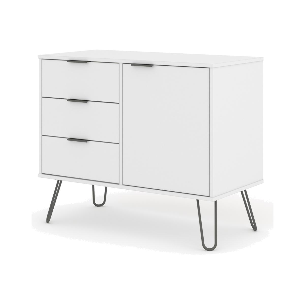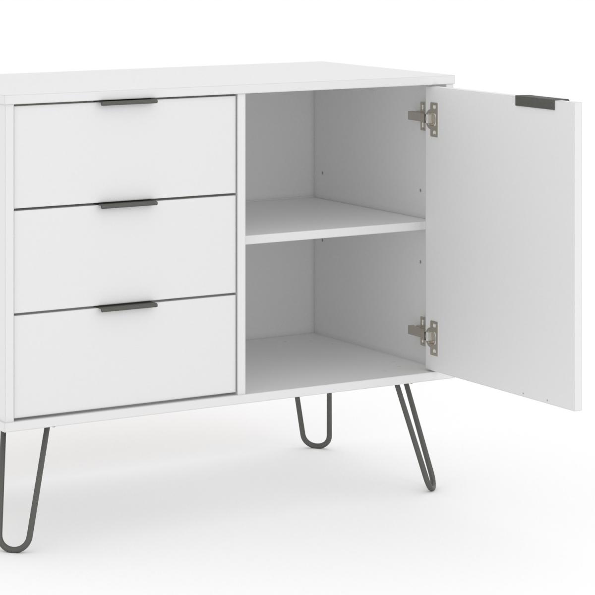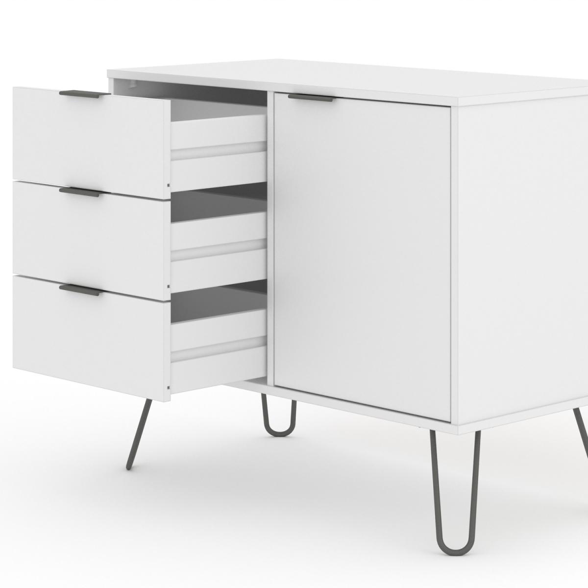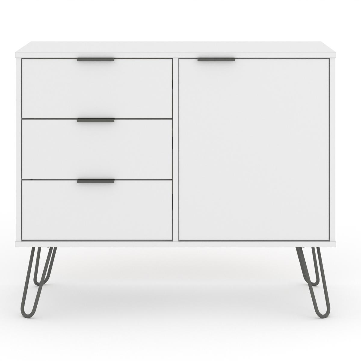 Contemporary clean lines have been blended with metal hairpin legs and profiled grip handles to create furniture ideal for modern casual living. Constructed from hardwearing melamine coated manufactured boards in a crisp white finish. Gunmetal grey real metal legs and profiled handles. Each piece has a hard-wearing, easy to clean finish. Mix with other pieces from the Augusta White furniture range to create a coordinated living style. This compact-sized sideboard is perfect for extra storage and display space in any living area of your home. Three useful drawers and a cupboard, inside which is an adjustable shelf, help you to make the best use of the storage space inside