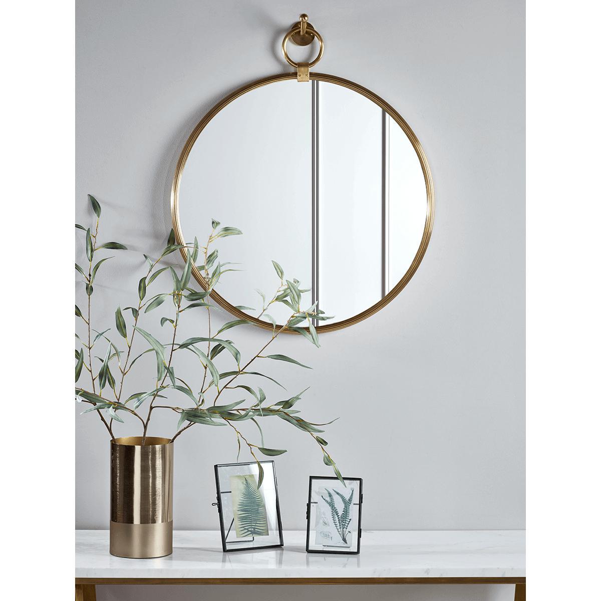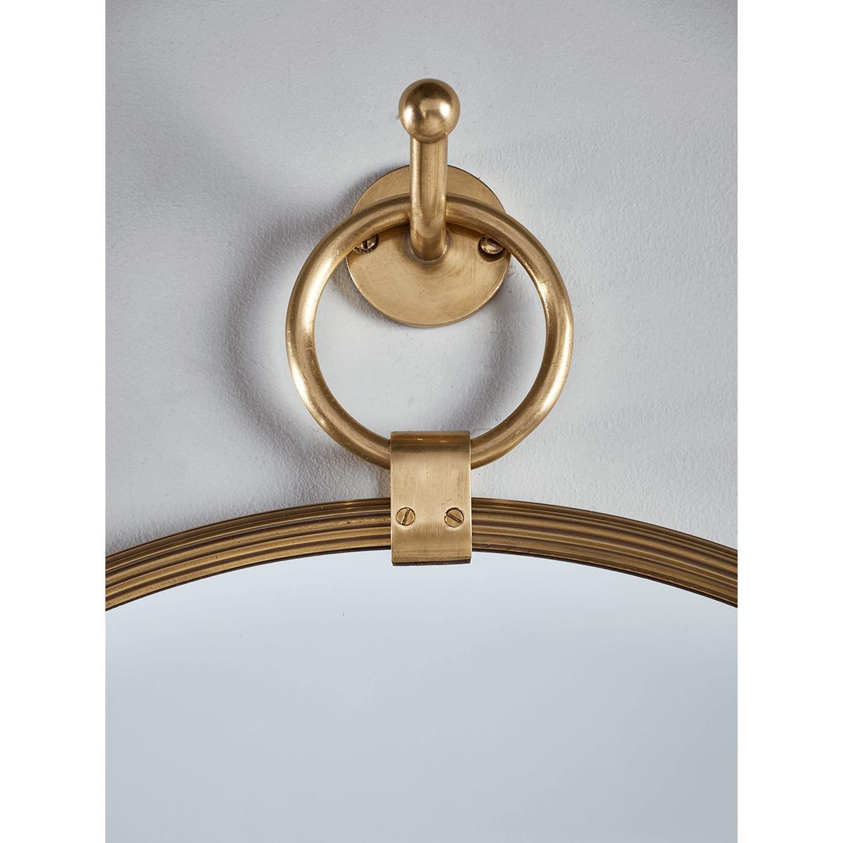 Crafted in a simple, circular shape with a wide mirrored surface and ribbed solid brass frame, our unique mirror will enhance the warmth and light in your living space and add interest to any wall. Each piece features a large hook to be mounted to the wall, and a weighty hoop for attaching the mirror.