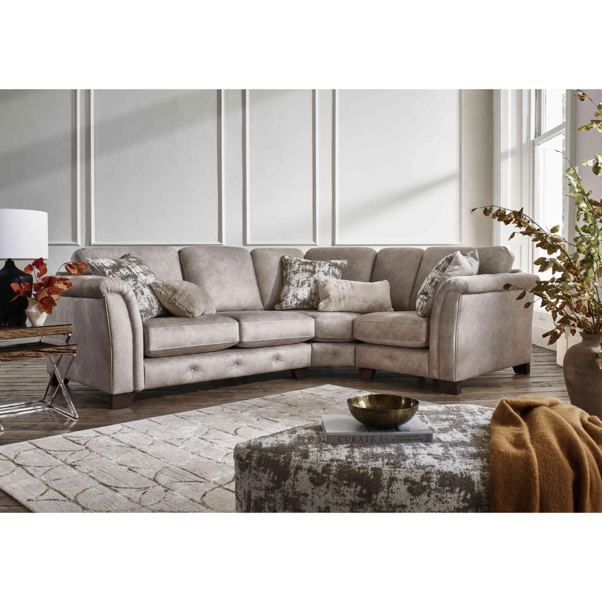 If you love glam sofa style and insist on serious comfort, then you’ll love our Aura range of sofas, chairs and footstools. This is a range that delivers substance as well as style, and there’s plenty of that too thanks to those beautiful rolled arms and buttoned borders. The incredibly comfortable seat cushioning comes with our 5-year plumpness guarantee and rests on sprung seating platforms for perfect support. Choose between traditional classic back style and the more relaxed feel of scatter back style. Even better? The collection is fully modular so you can design your own bespoke Aura sofa. Handcrafted in the UK and only at Furniture Village. You’ll love to lounge on the plumpness-guaranteed cushioning of our Aura corner sofa. Elegant and glam, it’s upholstered in a choice of sophisticated fabrics. Why you'll love it Gorgeous glam style that’s made for serious relaxing. High-performance Duo Flex seat cushioning for incredible comfort with support. And our 5-year plumpness guarantee means this is comfort that lasts and lasts. Lovely details include beautifully rolled arms and a buttoned border. Upholstered in a choice of sophisticated fabrics. With feather-filled accent cushions – 3 square cushions and 2 bolsters. Wood feet in 2 colours. Choose either dark or mid-oak. Available as both a left-hand facing and a right-hand facing corner sofa. Handcrafted with an exceptionally sturdy frame. Made in the UK and exclusive to Furniture Village. The Aura range is fully modular. Prefer a more relaxed look? Choose the scatter back version of this sofa. This classic back corner sofa is part of our Aura range. What you need to know Medium comfort level. Seat suspension: sprung. Seat cushioning: Duo Flex high-density foam. Cushioning is reversible. Back support: elastic webbing. Back cushioning: fibre. Cushioning is reversible. Back and feet are removable. To maintain cushion shape and fullness, be sure to plump daily. Rotate back and seat cushions for more even wear. Some fabrics can show wear on areas of more use or in direct sunlight. Clean regularly using a soft brush or vacuum with the curtain attachment. Deal with any spills promptly. Professional cleaning advised for oil- and grease-based stains. Please read our upholstery care guide for more advice.