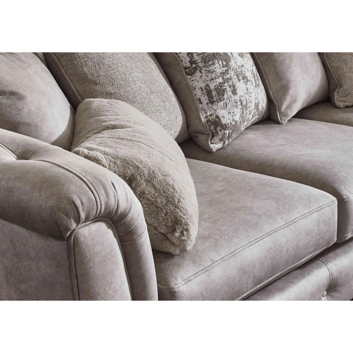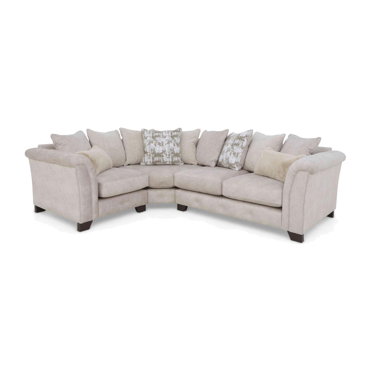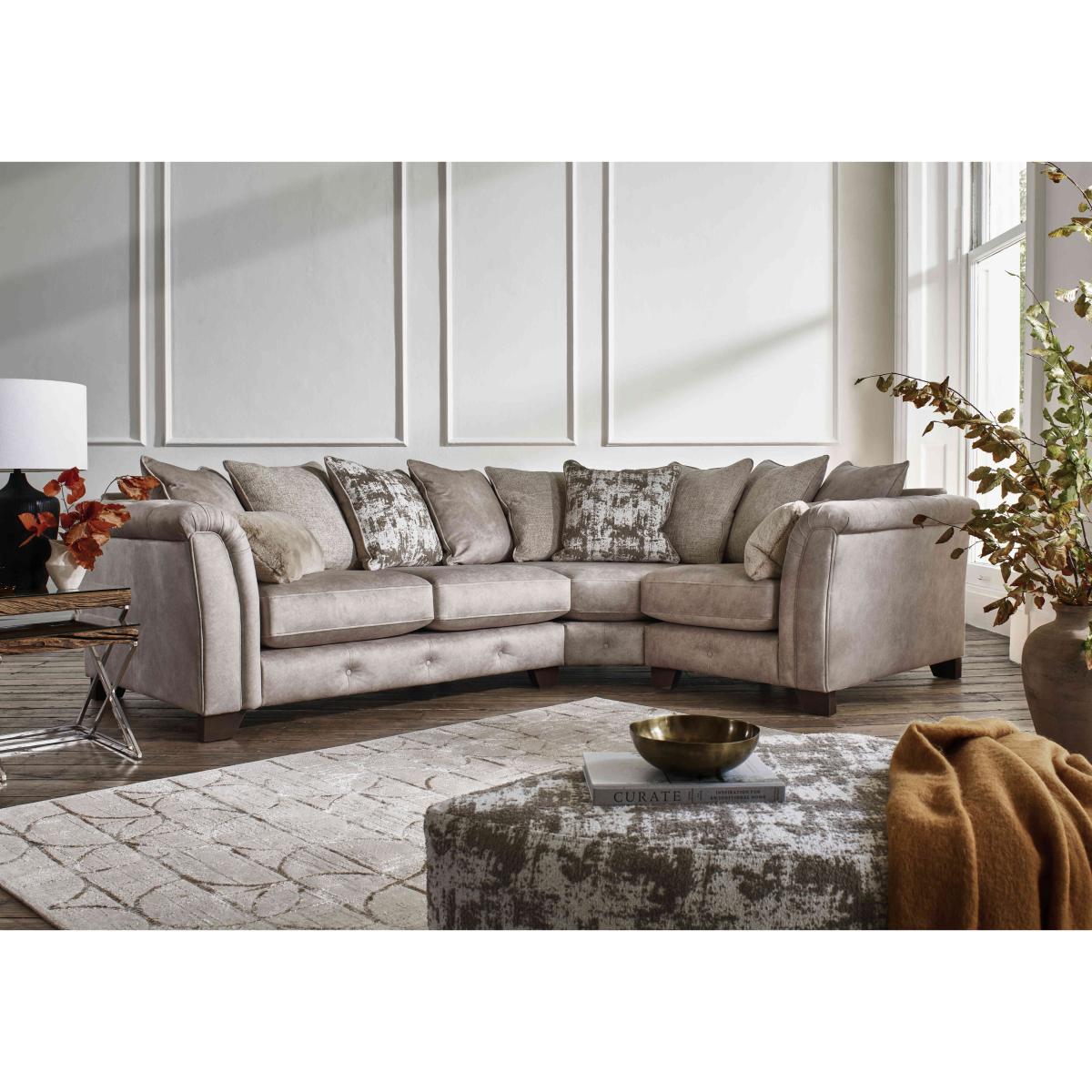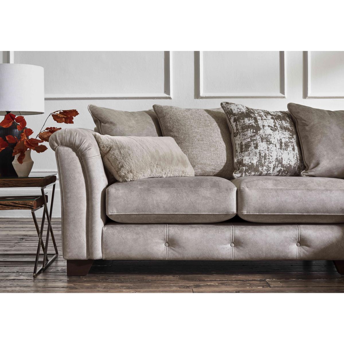 If you love glam sofa style and insist on serious comfort, then you’ll love our Aura range of sofas, chairs and footstools. This is a range that delivers substance as well as style, and there’s plenty of that too thanks to those beautiful rolled arms and buttoned borders. The incredibly comfortable seat cushioning comes with our 5-year plumpness guarantee and rests on sprung seating platforms for perfect support. Choose between traditional classic back style and the more relaxed feel of scatter back style. Even better? The collection is fully modular so you can design your own bespoke Aura sofa. Handcrafted in the UK and only at Furniture Village. Lounge in luxurious comfort with our stunning Aura scatter back corner sofa with no less than 11 feather-filled scatter cushions as well as plumpness-guaranteed seat cushioning. Why you'll love it Gorgeous glam style that’s made for serious relaxing. High-performance Duo Flex seat cushioning for incredible comfort with support. And our 5-year plumpness guarantee means this is comfort that lasts and lasts. Lovely details include beautifully rolled arms and a buttoned border. Upholstered in a choice of sophisticated fabrics. Pillow back style with 11 feather-filled scatters and bolsters. Wood feet in 2 colours. Choose either dark or mid-oak. Available as both a left-hand facing and a right-hand facing corner sofa. Handcrafted with an exceptionally sturdy frame. Made in the UK and exclusive to Furniture Village. The Aura range is fully modular. Prefer a more formal look? Choose the classic back version of this sofa. This scatter back corner sofa is part of our Aura range. What you need to know Medium comfort level. Seat suspension: sprung. Seat cushioning: Duo Flex high-density foam. Cushioning is reversible. Back support: elastic webbing. Pillow back cushions: feather. Back and feet are removable. To maintain cushion shape and fullness, be sure to plump daily. Rotate back and seat cushions for more even wear. Some fabrics can show wear on areas of more use or in direct sunlight. Clean regularly using a soft brush or vacuum with the curtain attachment. Deal with any spills promptly. Professional cleaning advised for oil- and grease-based stains. Please read our upholstery care guide for more advice.